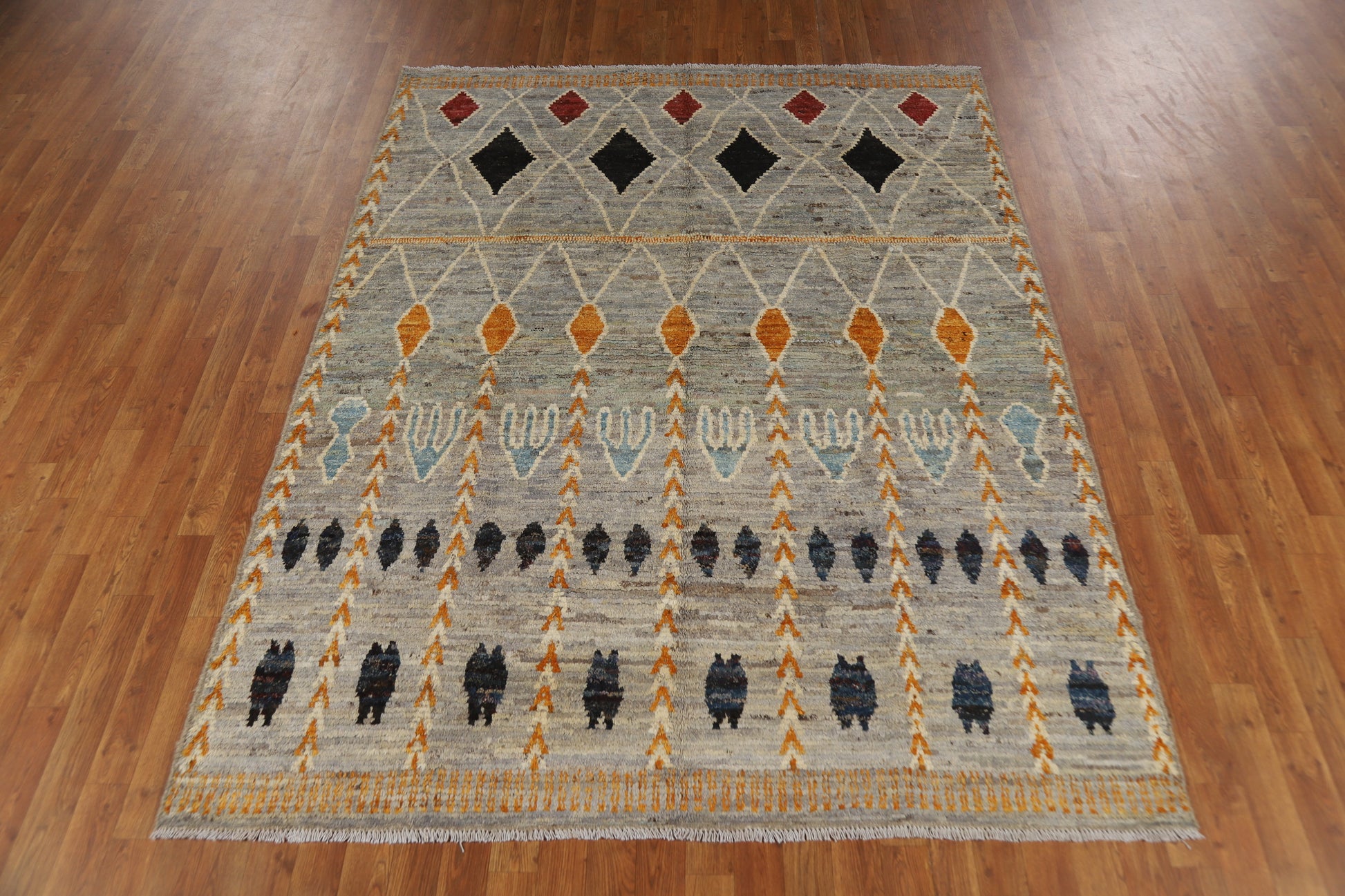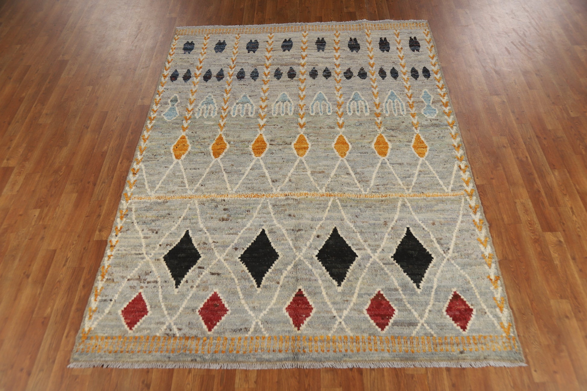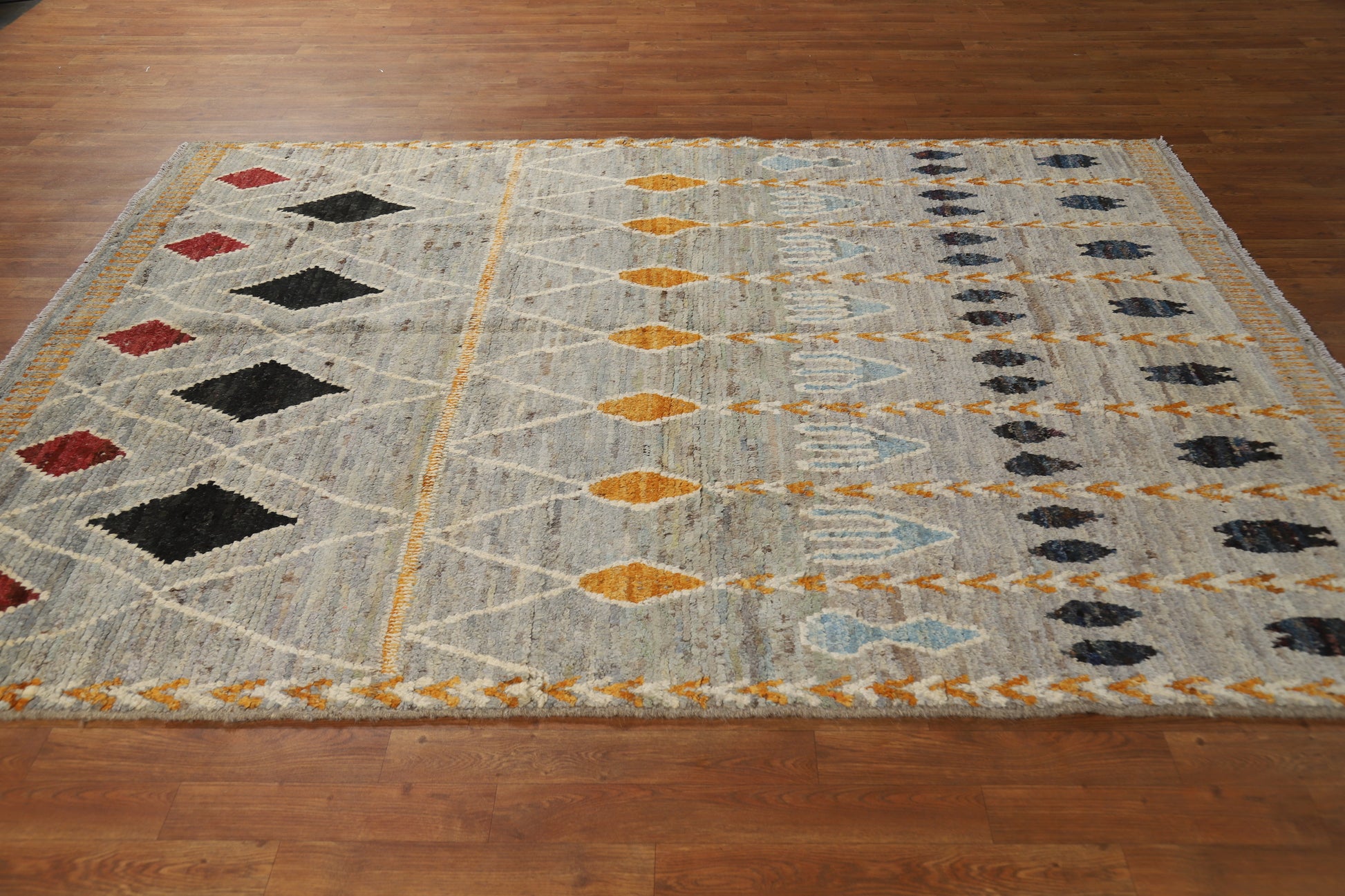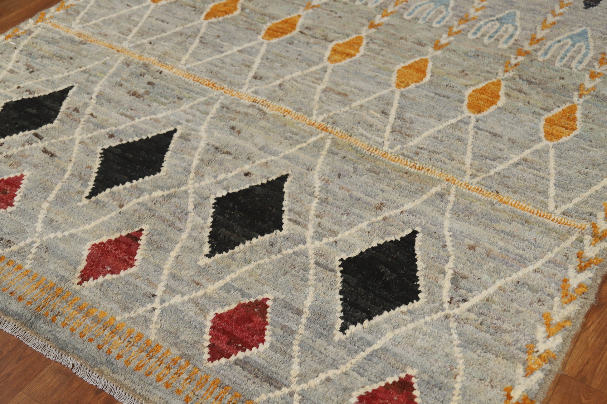 A Beautiful Genuine Pakistan Moroccan rug is Hand Knotted by skillful weavers in Pakistan with 100% Wool Material. This rug is in New, First Quality condition. dimensions are 8' 0'' X 6' 0'' in foot and 244 X 183 in centimeter. the primary color is Greys & Charcoal.