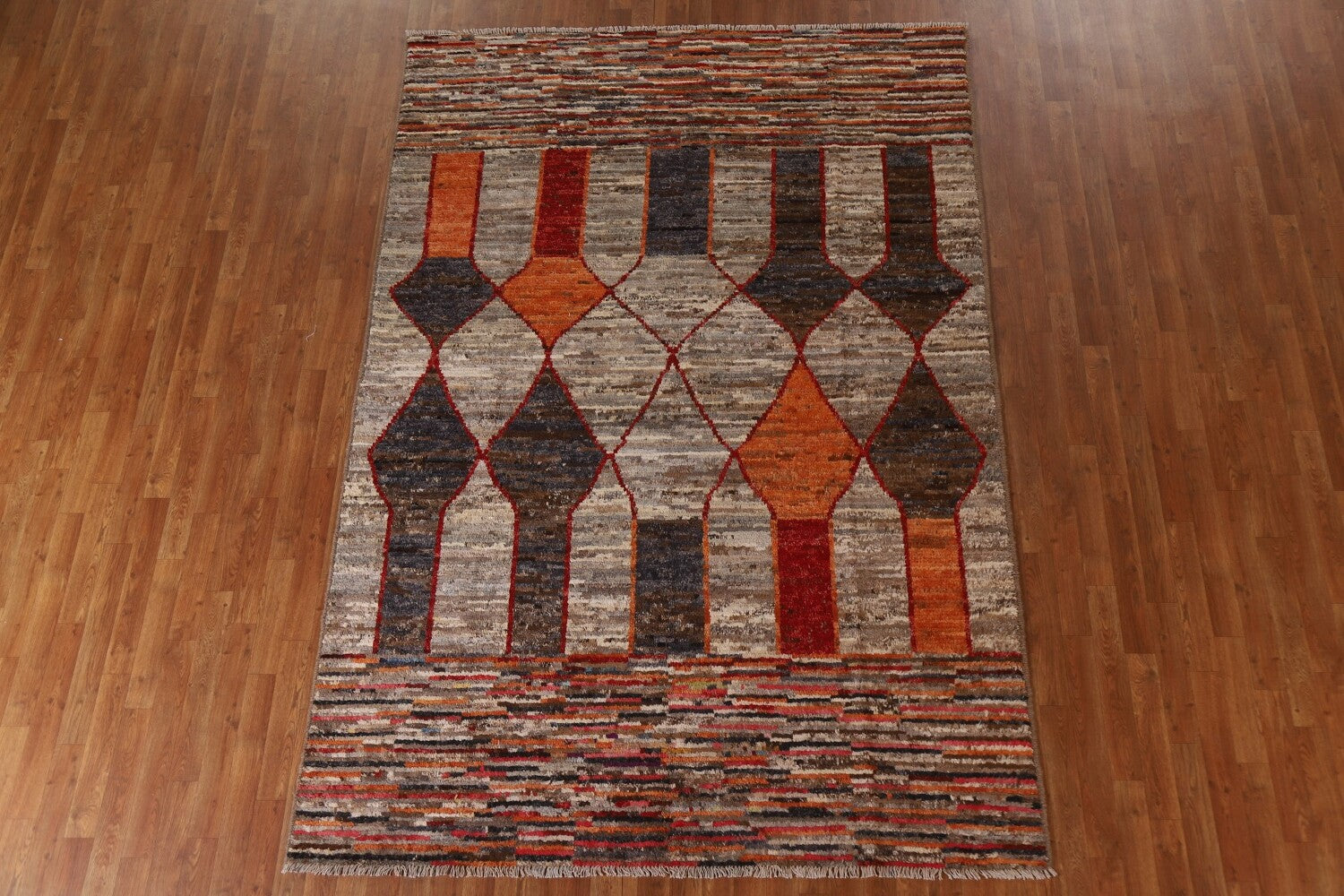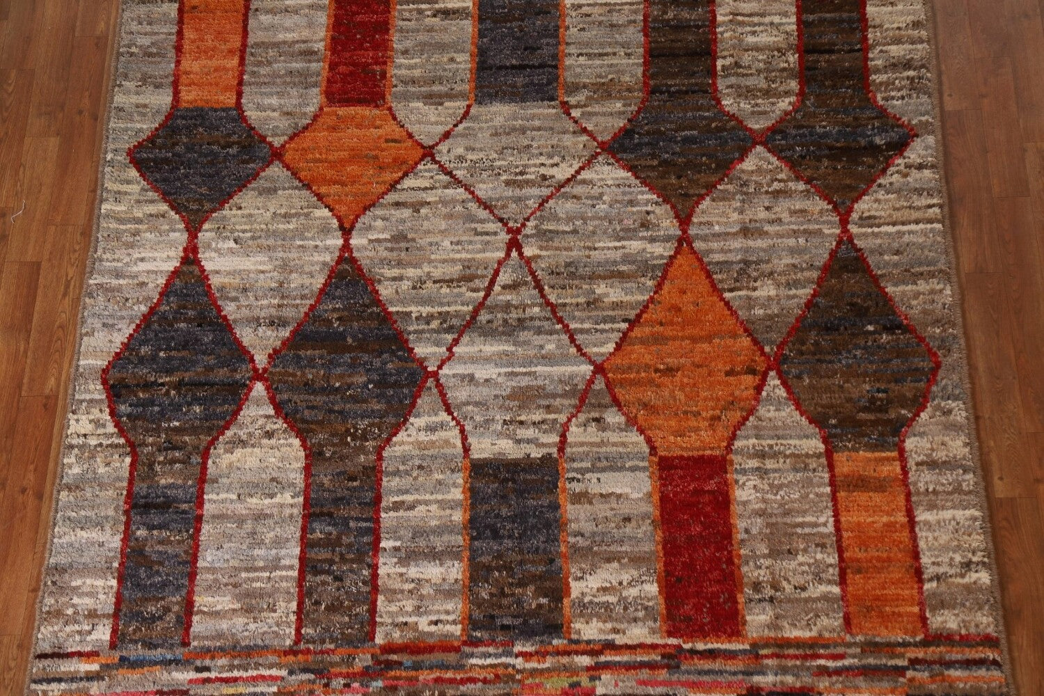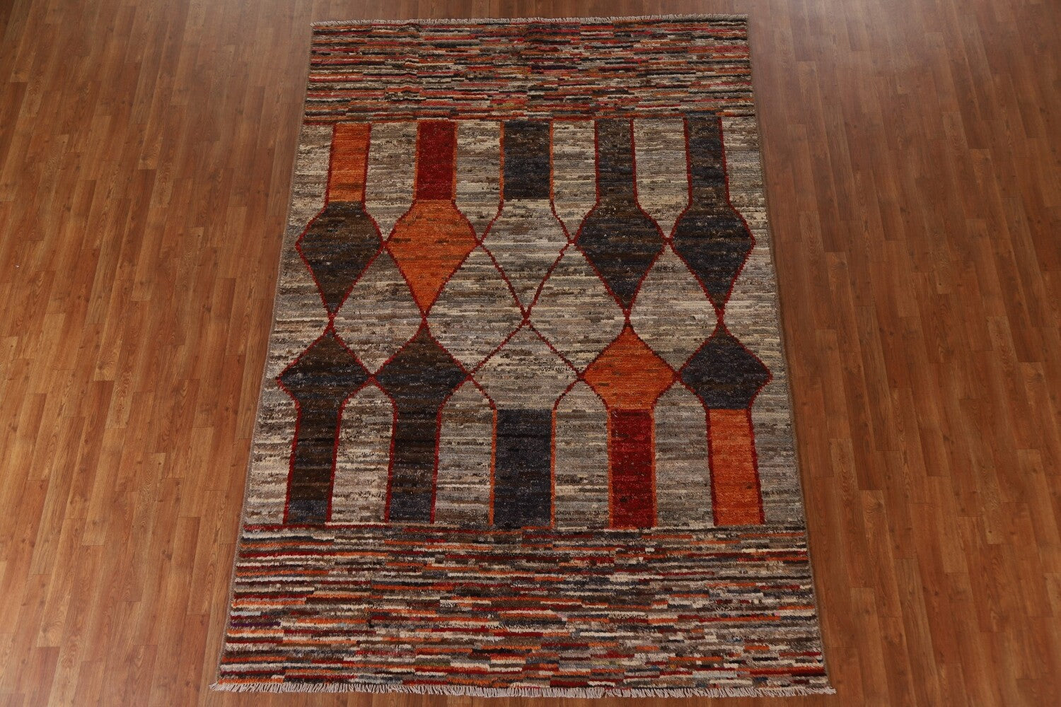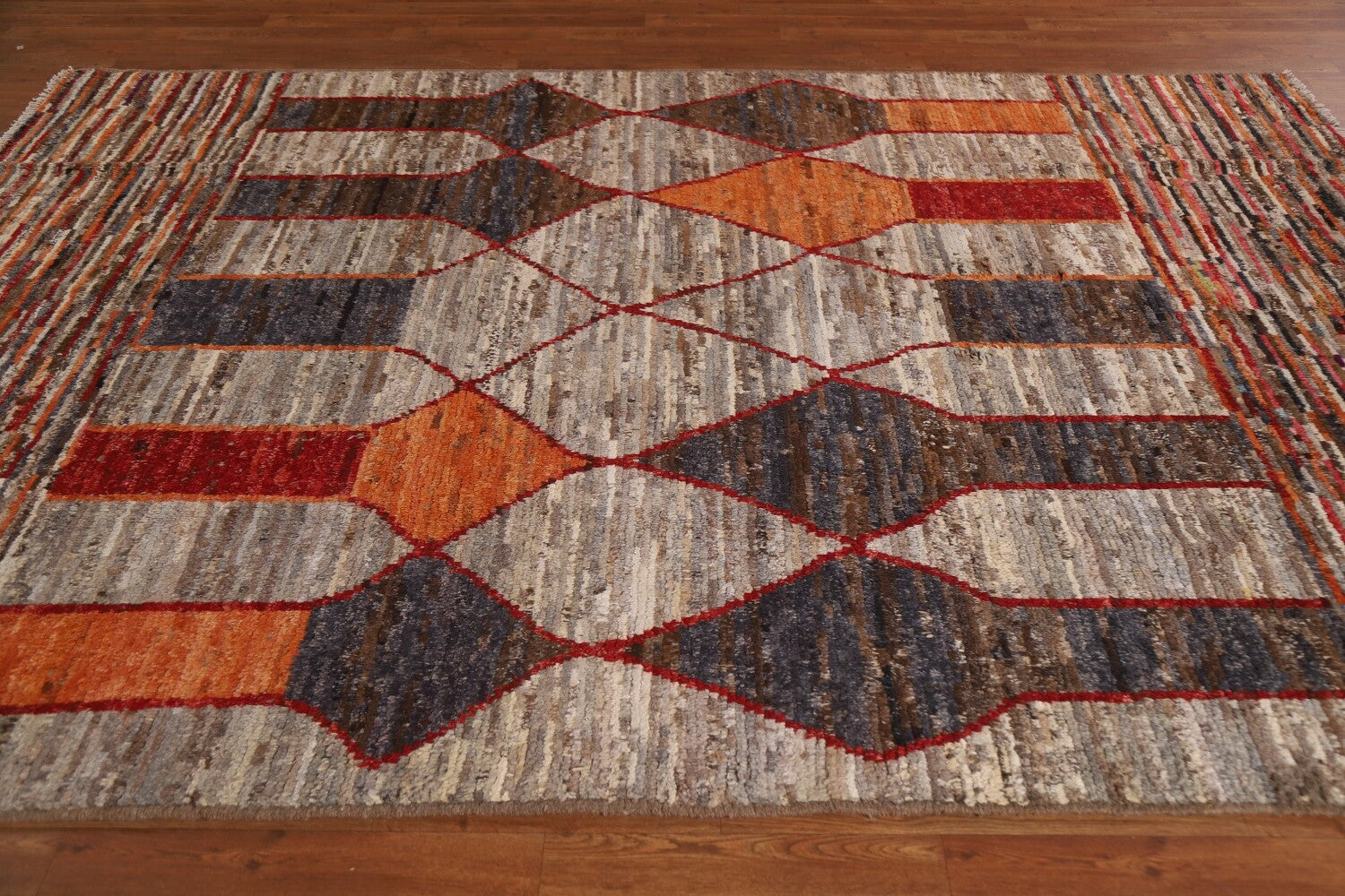 A Beautiful Genuine Pakistan Moroccan rug is Hand Knotted by skillful weavers in Pakistan with 100% Wool Material. This rug is in condition. dimensions are 9' 8'' X 6' 7'' in foot and 295 X 201 in centimeter. the primary color is Greys & Charcoal.