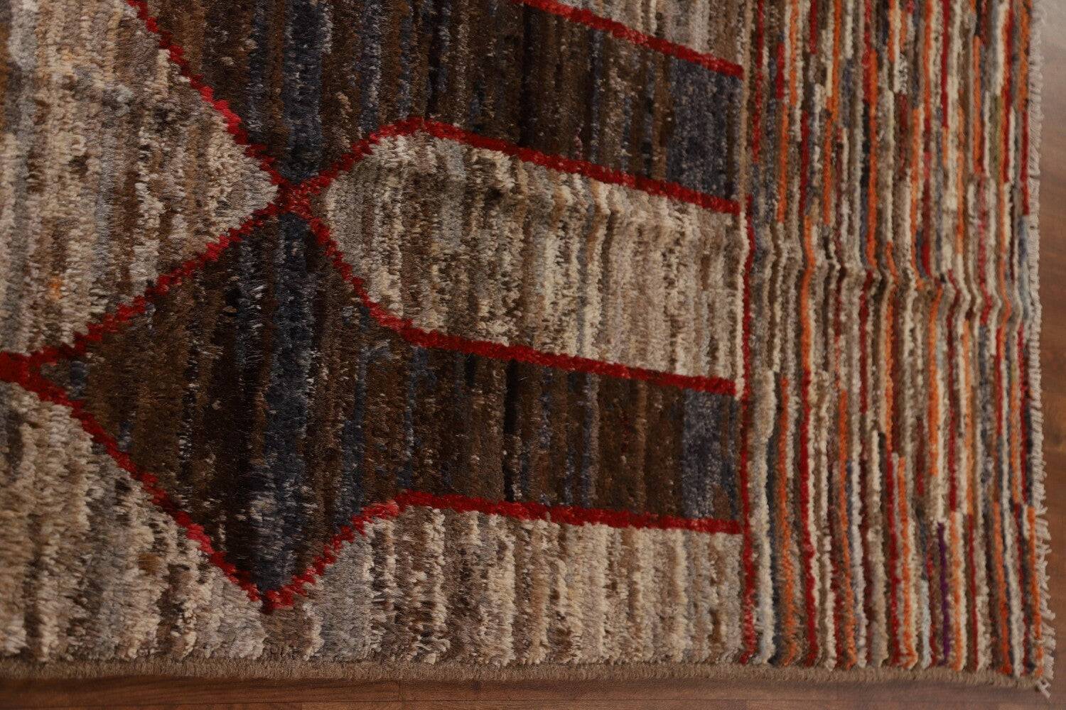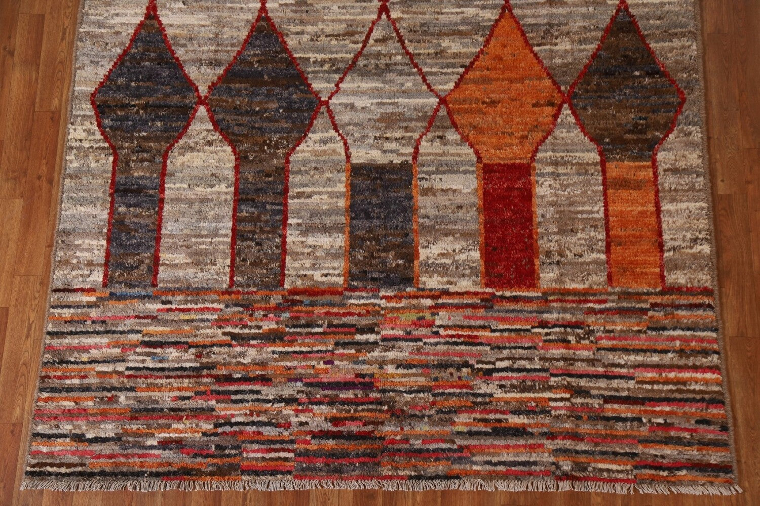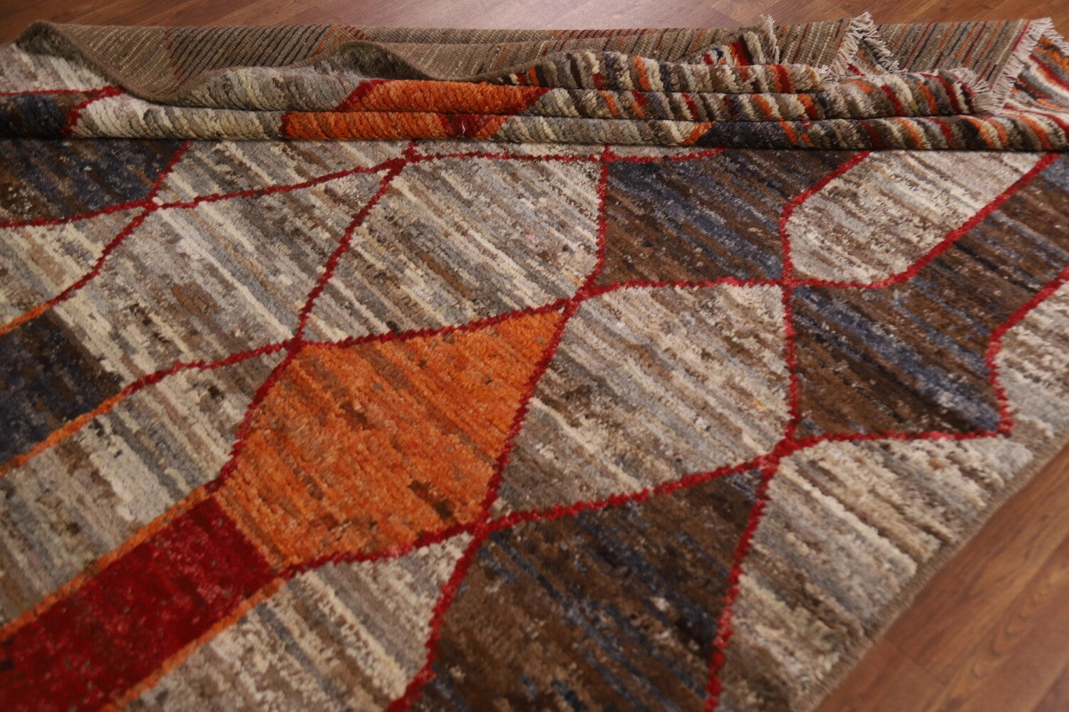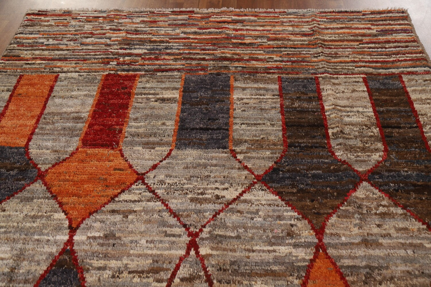 A Beautiful Genuine Pakistan Moroccan rug is Hand Knotted by skillful weavers in Pakistan with 100% Wool Material. This rug is in condition. dimensions are 9' 8'' X 6' 7'' in foot and 295 X 201 in centimeter. the primary color is Greys & Charcoal.