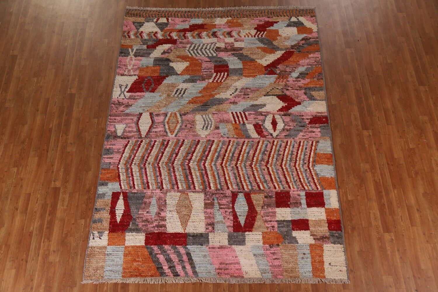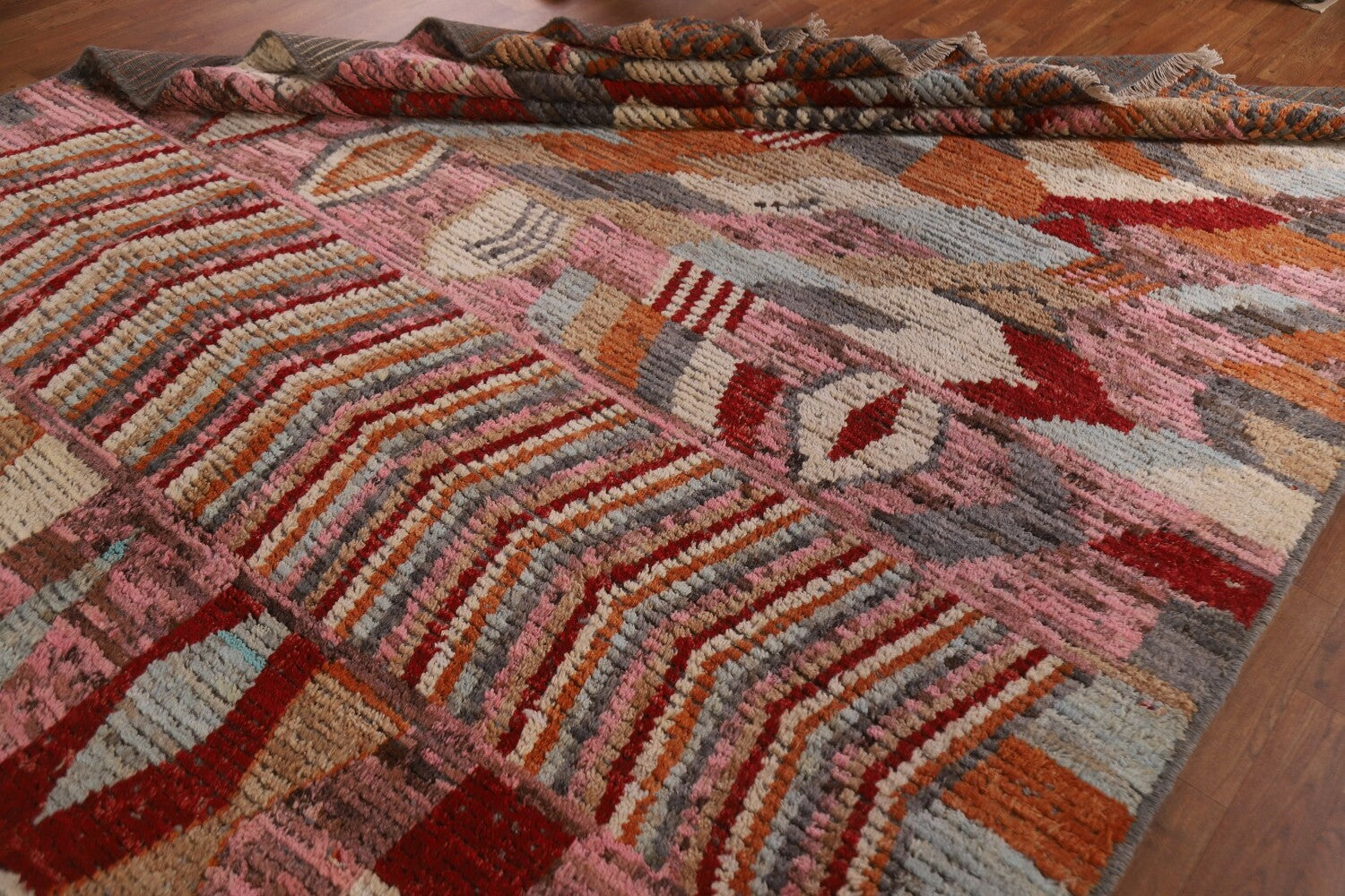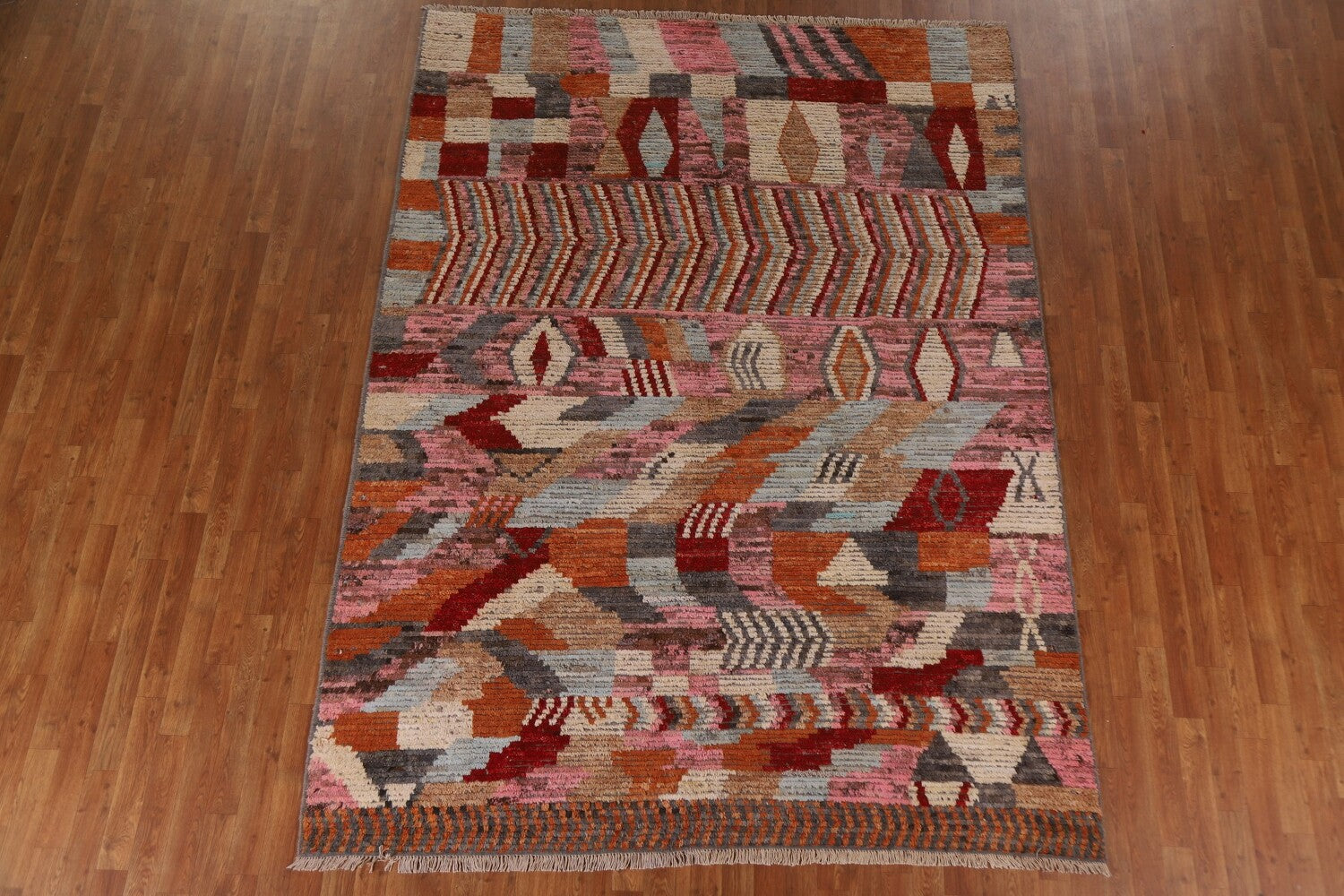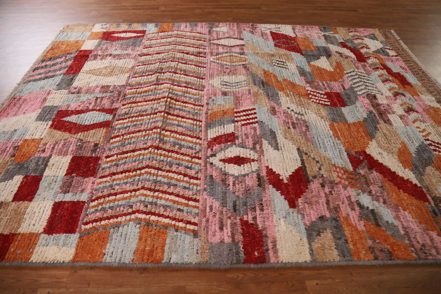 A Beautiful Genuine Pakistan Moroccan rug is Hand Knotted by skillful weavers in Pakistan with 100% Wool Material. This rug is in condition. dimensions are 9' 7'' X 7' 0'' in foot and 292 X 213 in centimeter. the primary color is Pink.