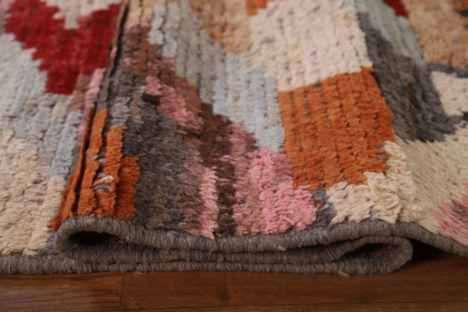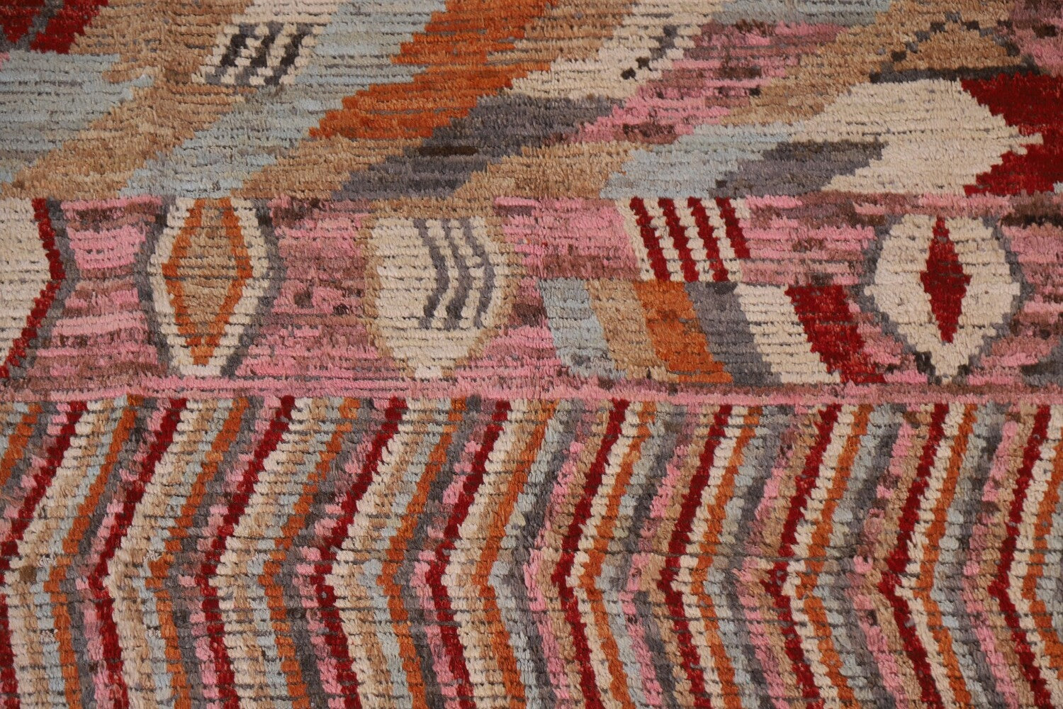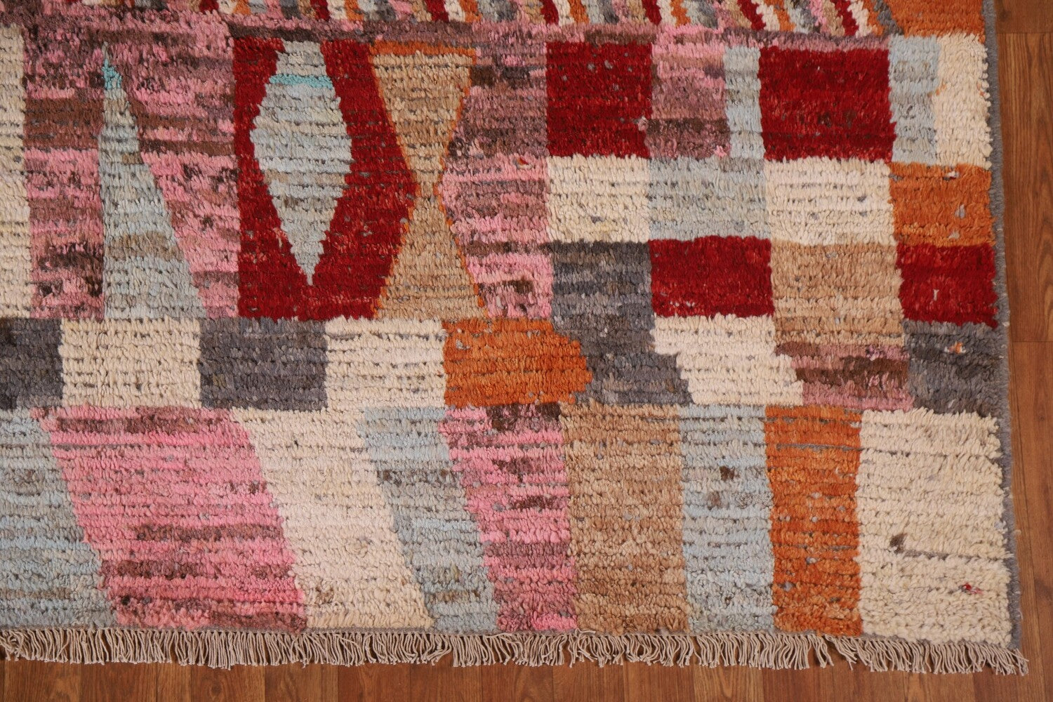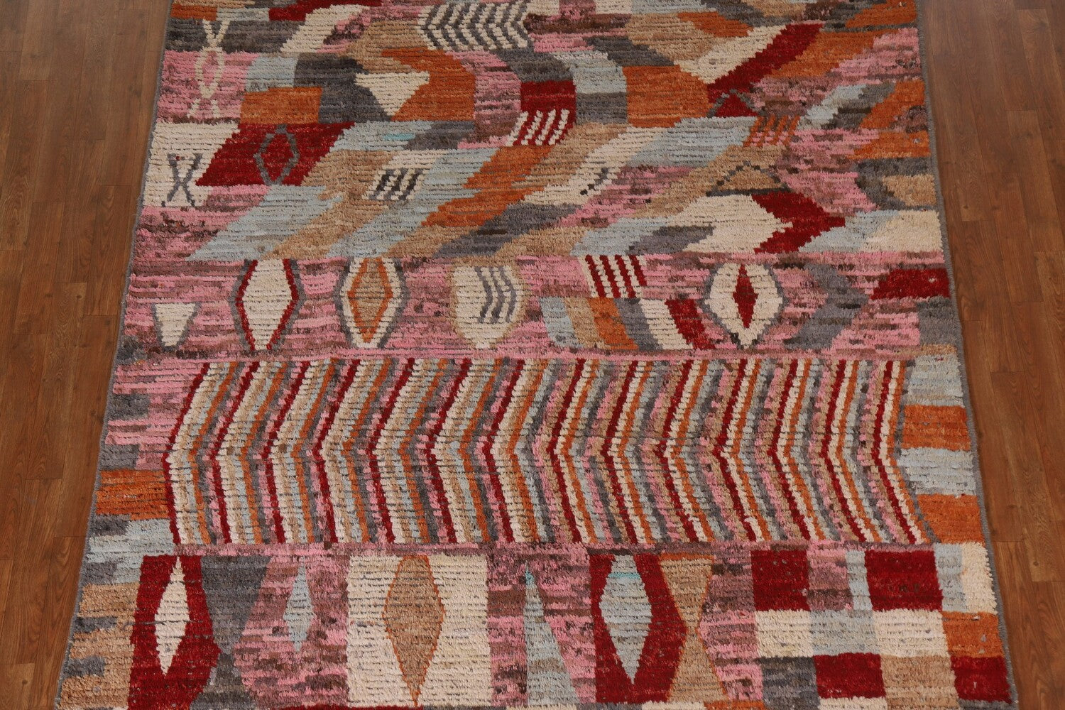 A Beautiful Genuine Pakistan Moroccan rug is Hand Knotted by skillful weavers in Pakistan with 100% Wool Material. This rug is in condition. dimensions are 9' 7'' X 7' 0'' in foot and 292 X 213 in centimeter. the primary color is Pink.