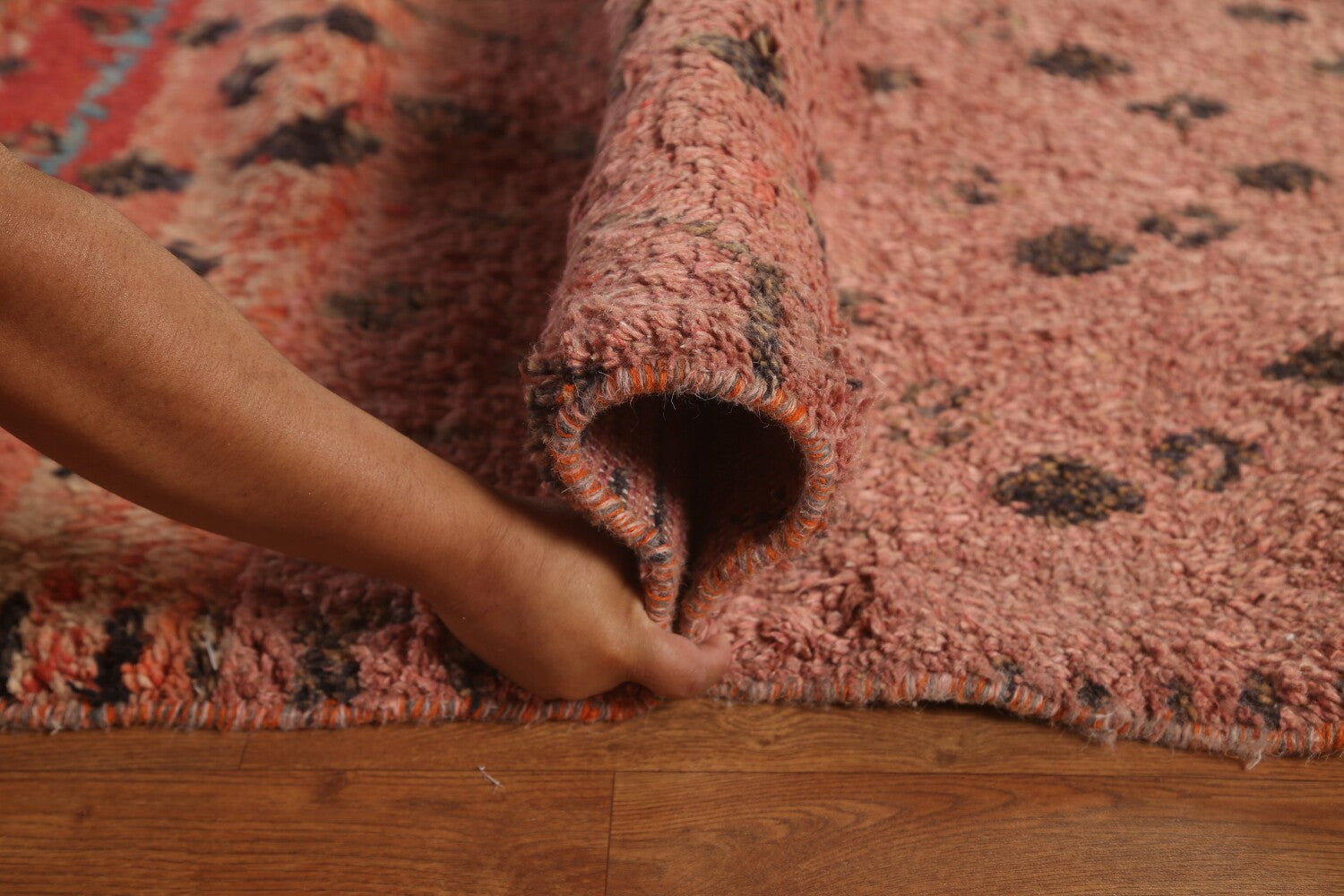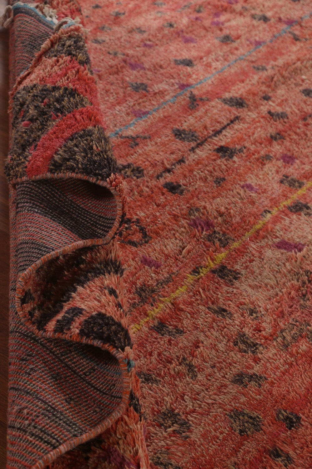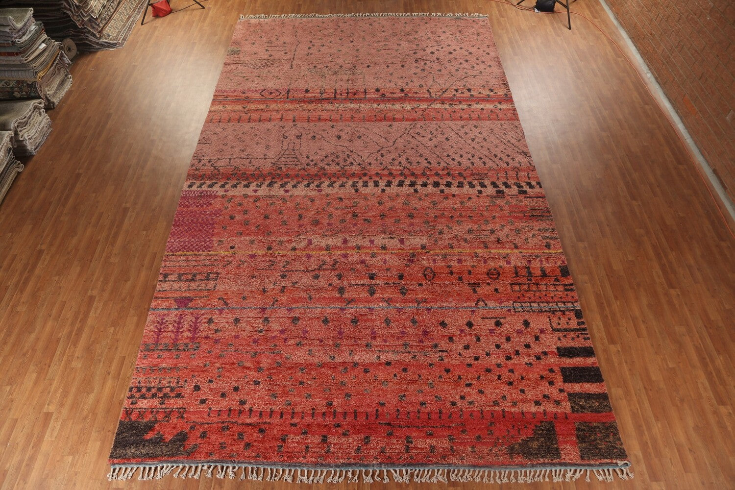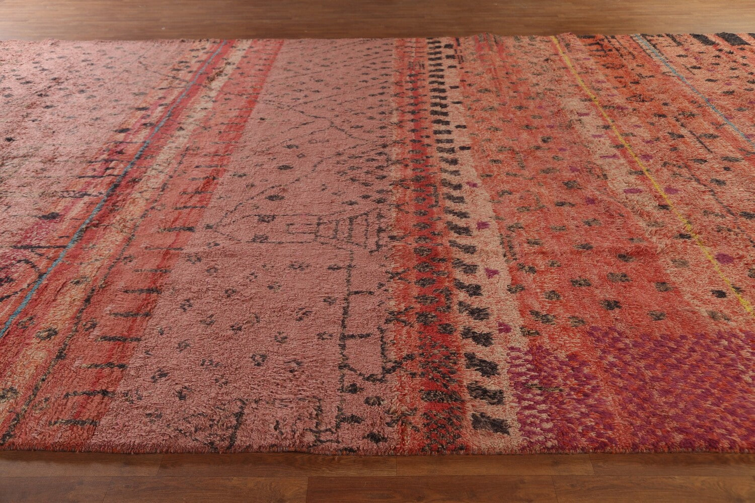 A Beautiful Genuine Pakistan Moroccan rug is Hand Knotted by skillful weavers in Pakistan with 100% Wool Material. This rug is in New, First Quality condition. dimensions are 19' 5'' X 11' 4'' in foot and 592 X 345 in centimeter. the primary color is Coral.