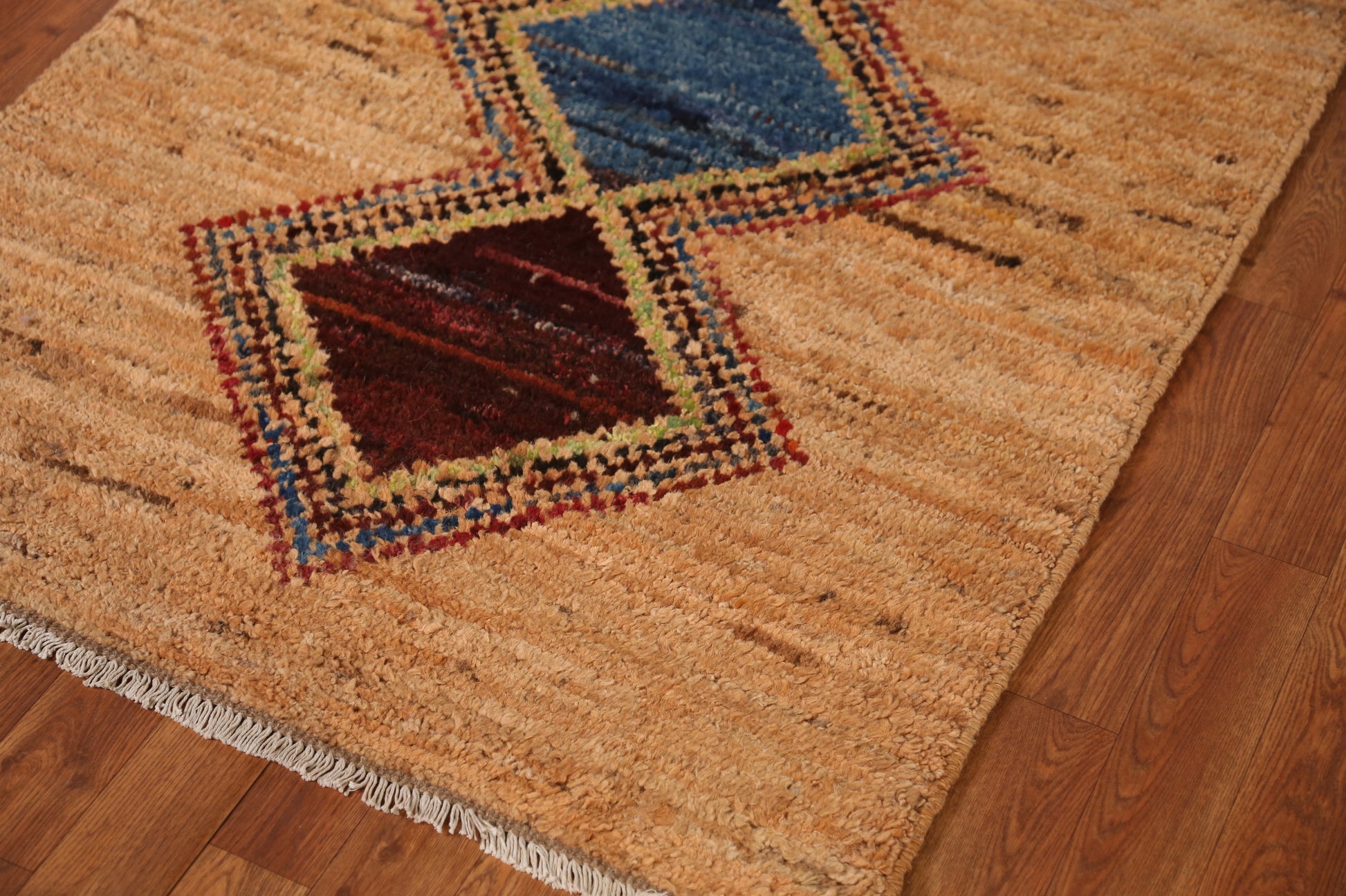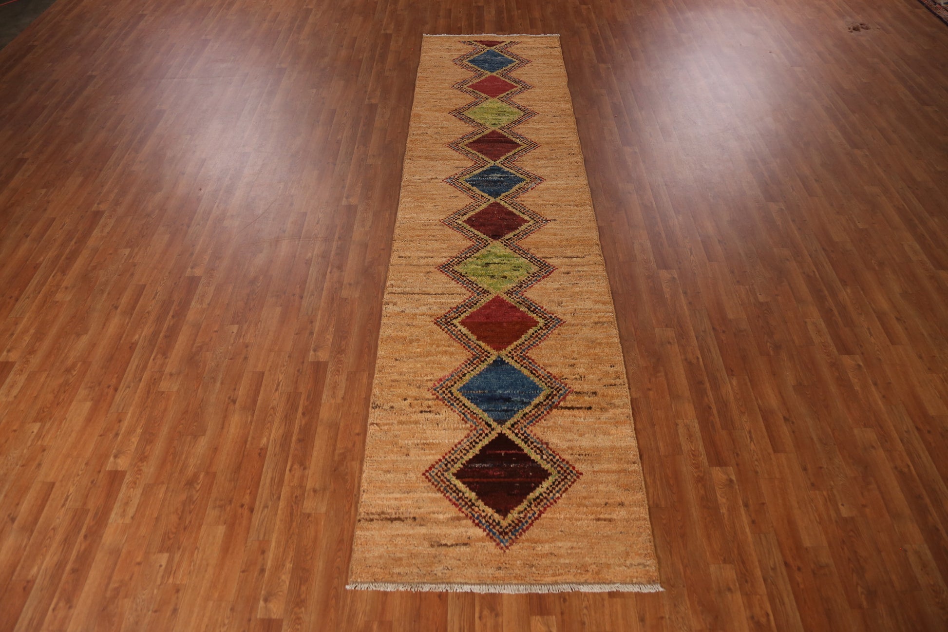 A Beautiful Genuine Pakistan Moroccan rug is Hand Knotted by skillful weavers in Pakistan with 100% Wool Material. This rug is in New, First Quality condition. dimensions are 12' 6'' X 3' 3'' in foot and 381 X 99 in centimeter. the primary color is Oranges & Rust.