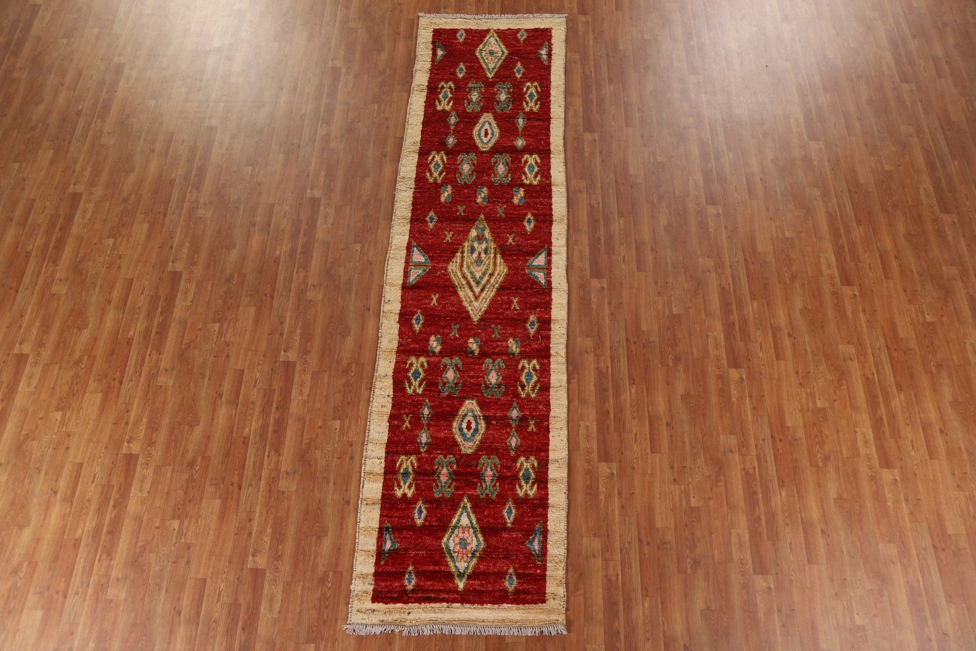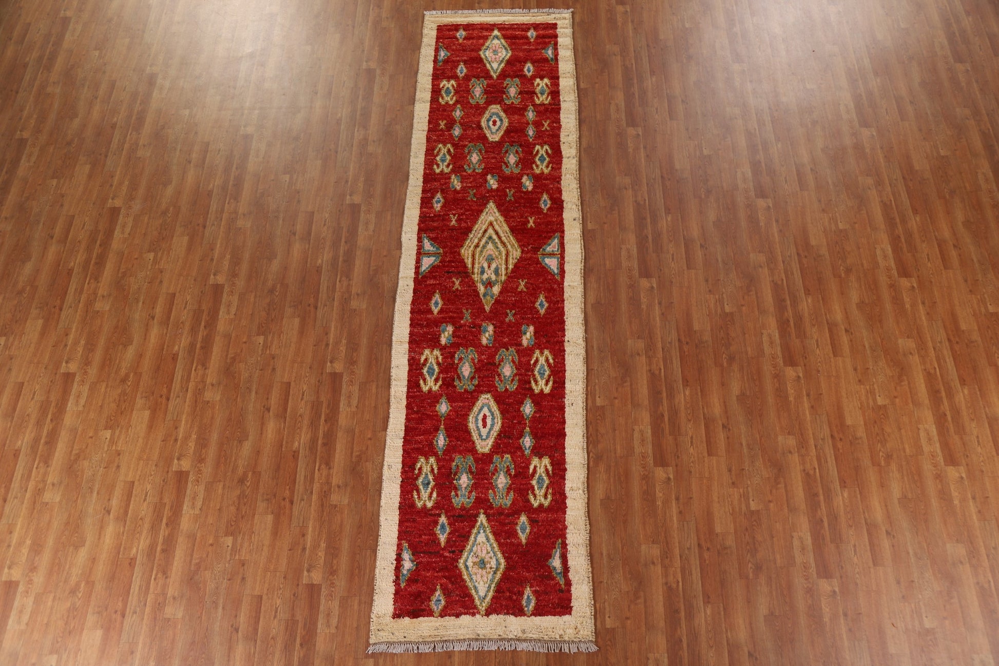 A Beautiful Genuine Pakistan Moroccan rug is Hand Knotted by skillful weavers in Pakistan with 100% Wool Material. This rug is in condition. dimensions are 12' 0'' X 3' 0'' in foot and 366 X 91 in centimeter. the primary color is Red.