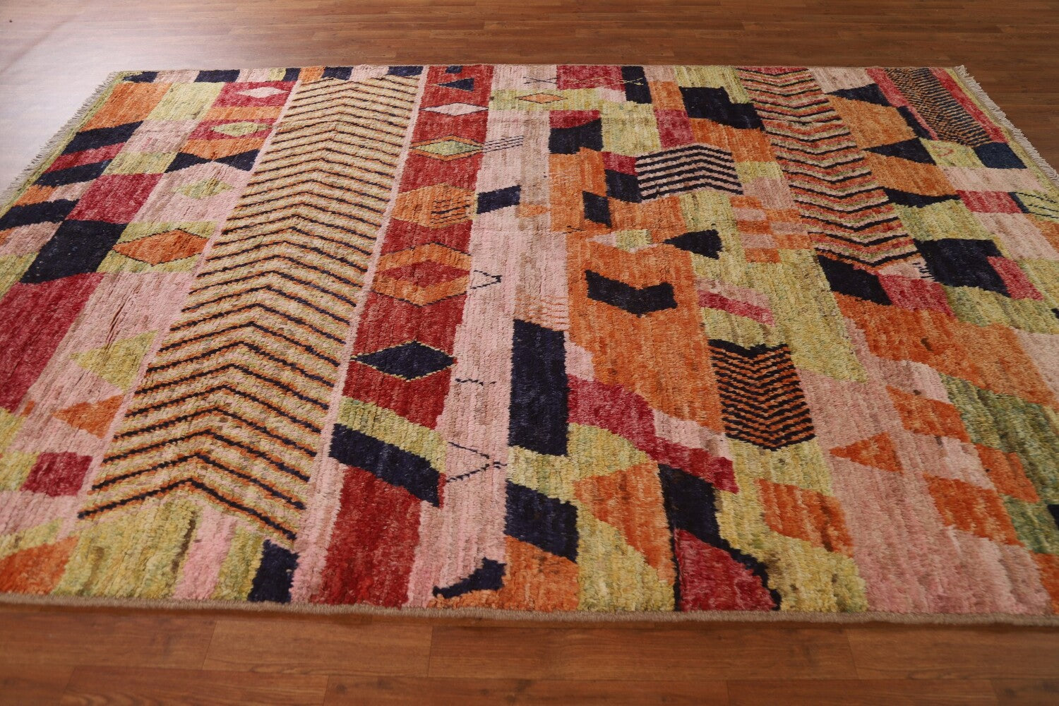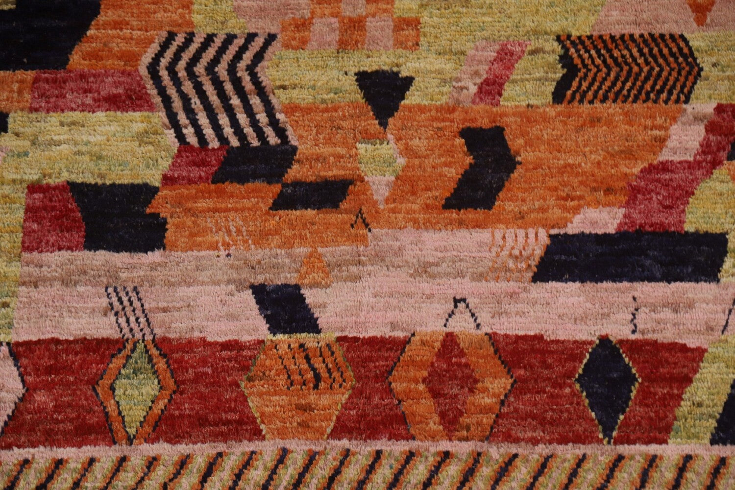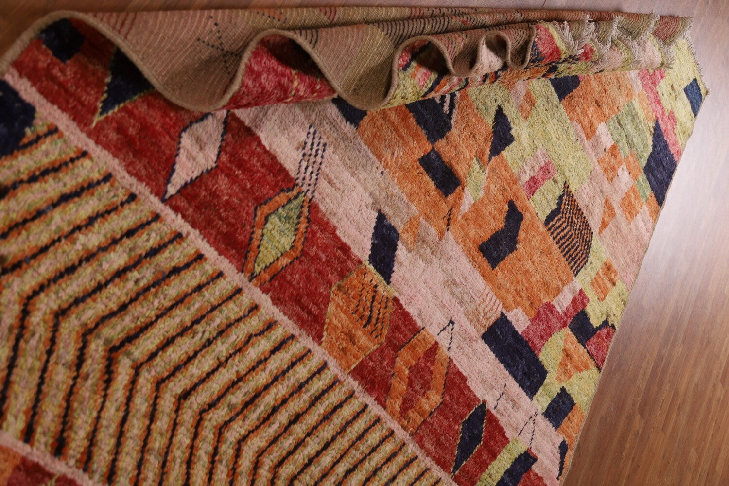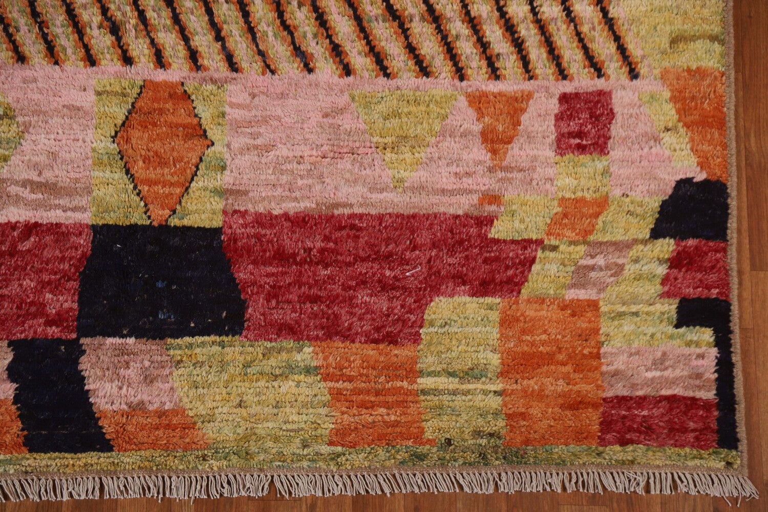 A Beautiful Genuine Pakistan Moroccan rug is Hand Knotted by skillful weavers in Pakistan with 100% Wool Material. This rug is in condition. dimensions are 9' 8'' X 6' 8'' in foot and 295 X 203 in centimeter. the primary color is Multi-Colored.