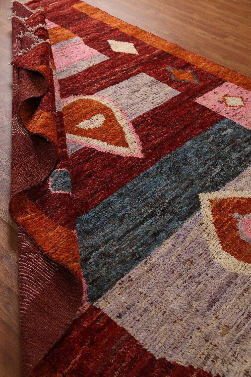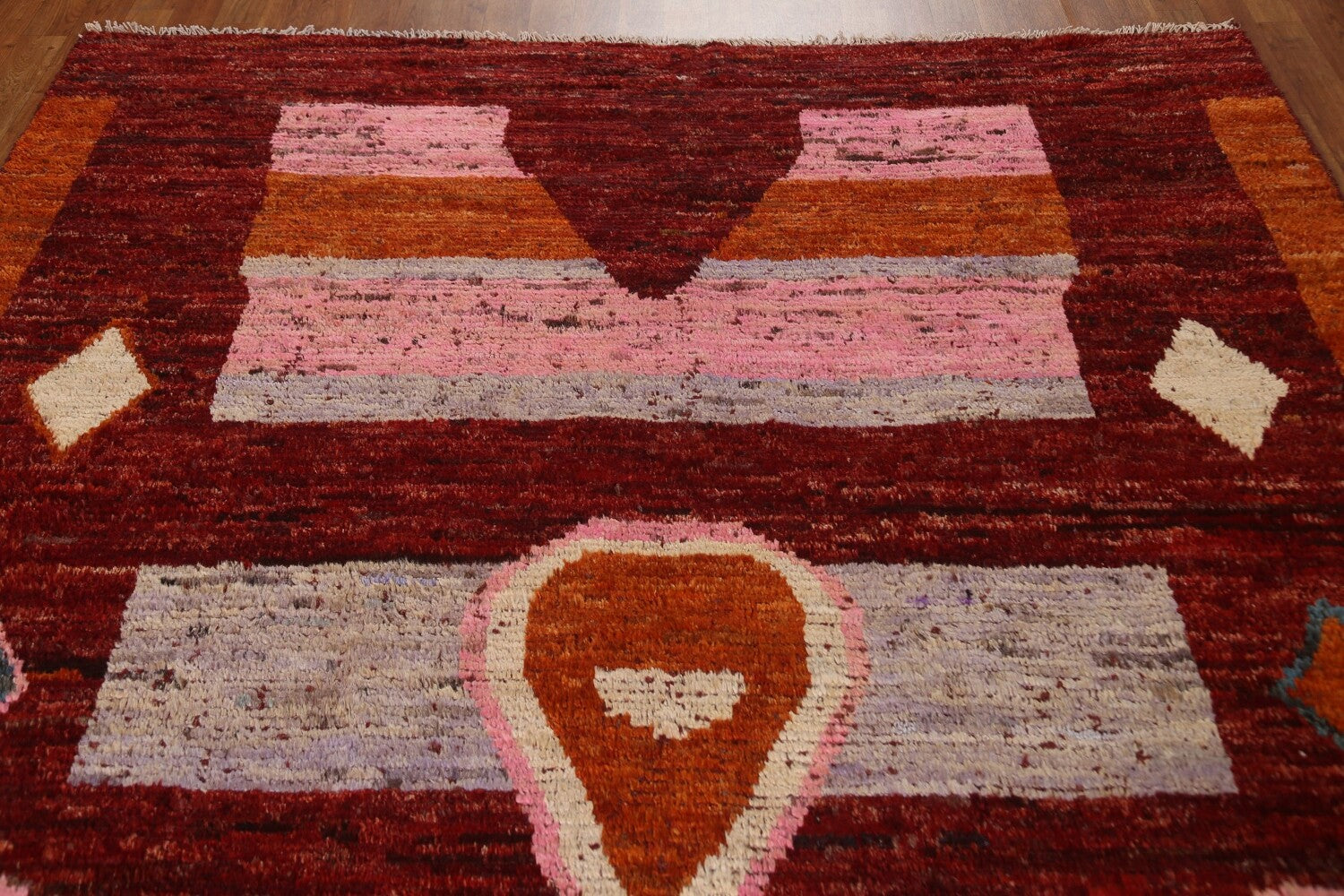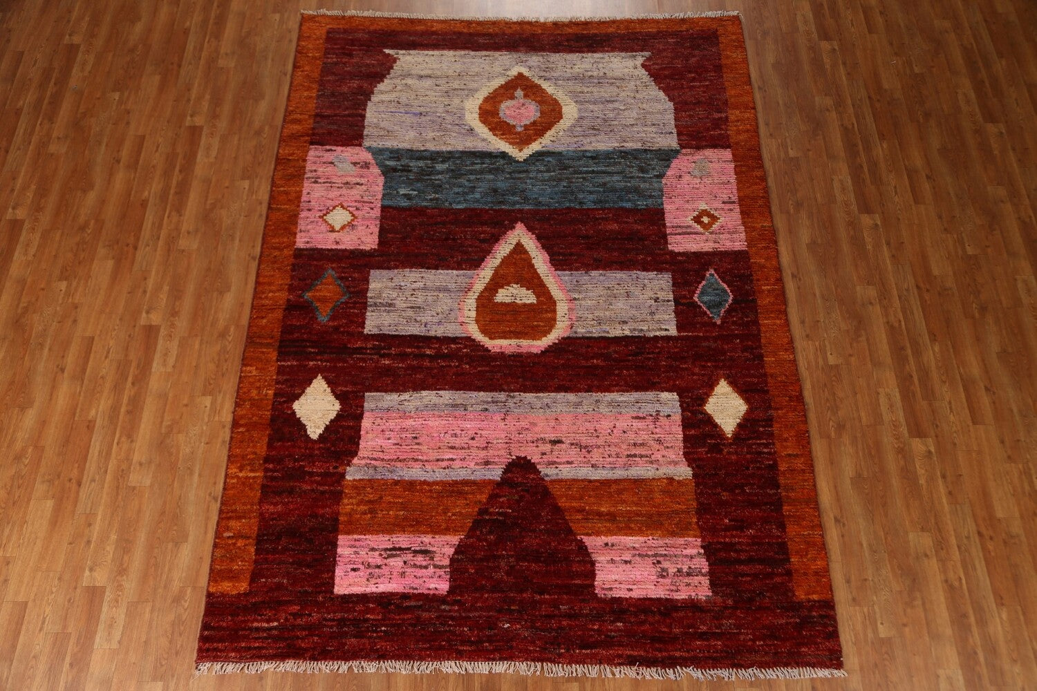 A Beautiful Genuine Pakistan Moroccan rug is Hand Knotted by skillful weavers in Pakistan with 100% Wool Material. This rug is in condition. dimensions are 9' 5'' X 6' 11'' in foot and 287 X 211 in centimeter. the primary color is Red.