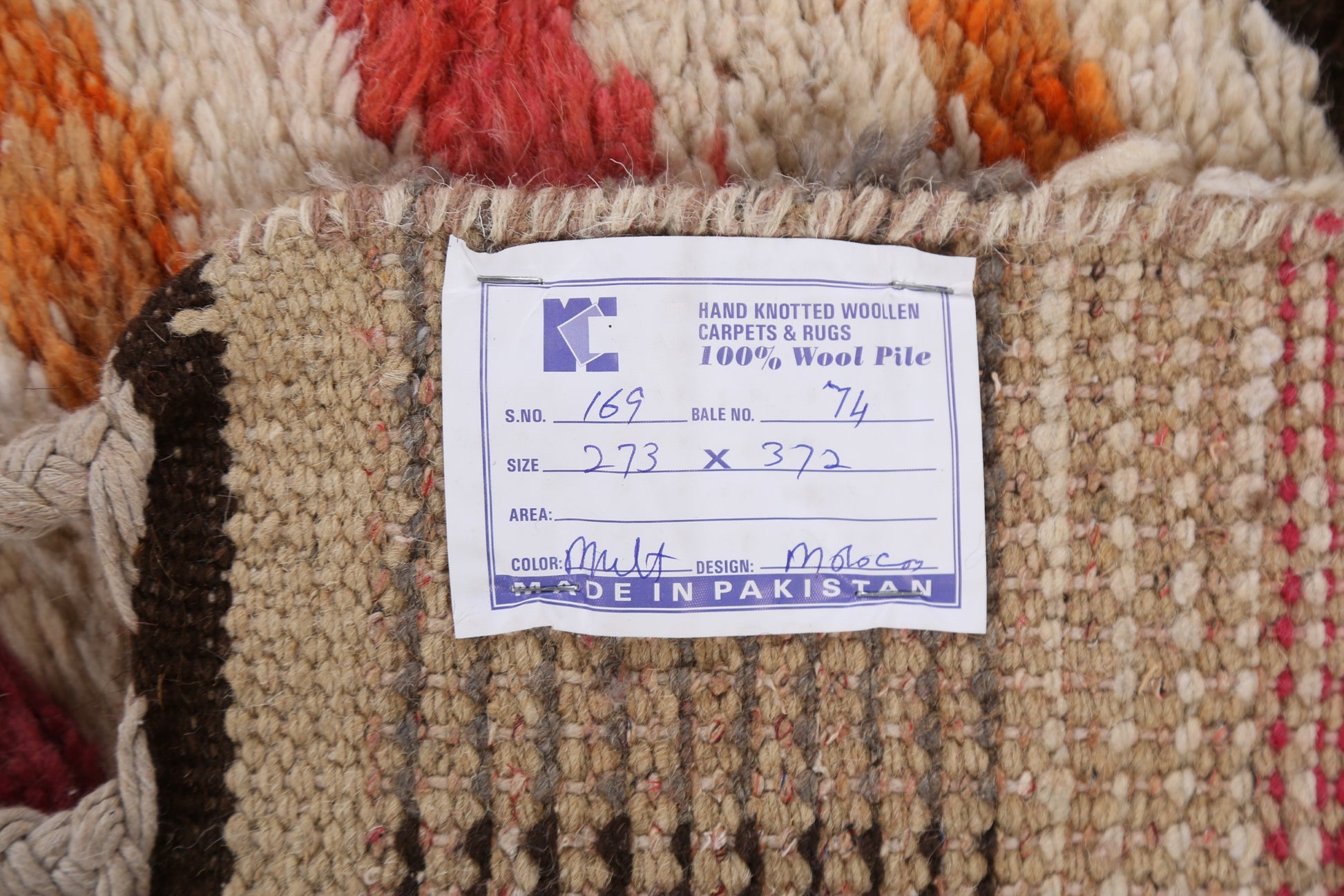 A Beautiful Genuine Pakistan Moroccan rug is Hand Knotted by skillful weavers in Pakistan with 100% Wool Material. This rug is in New, First Quality condition. dimensions are 12' 5'' X 8' 11'' in foot and 378 X 272 in centimeter. the primary color is Multi-Colored.