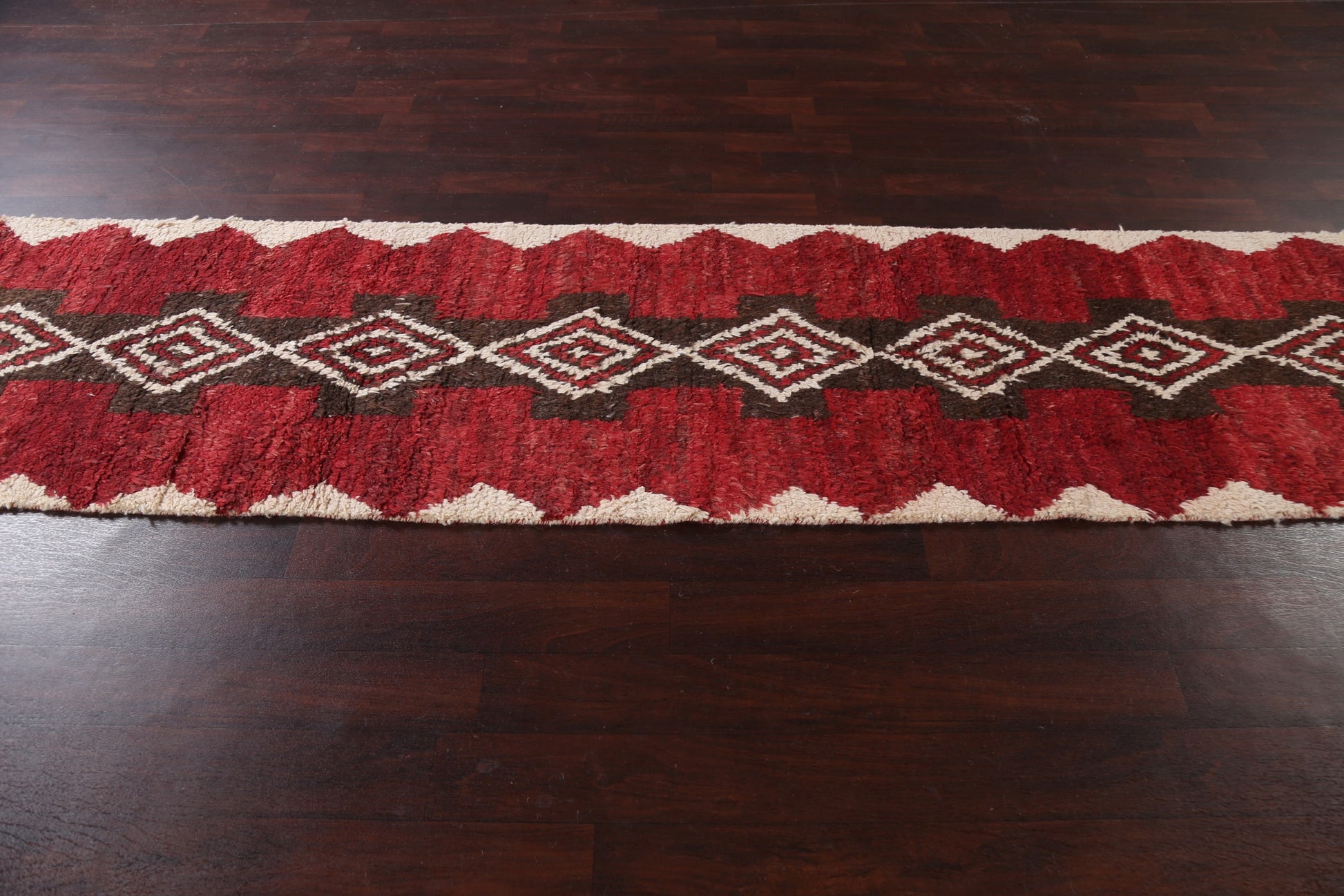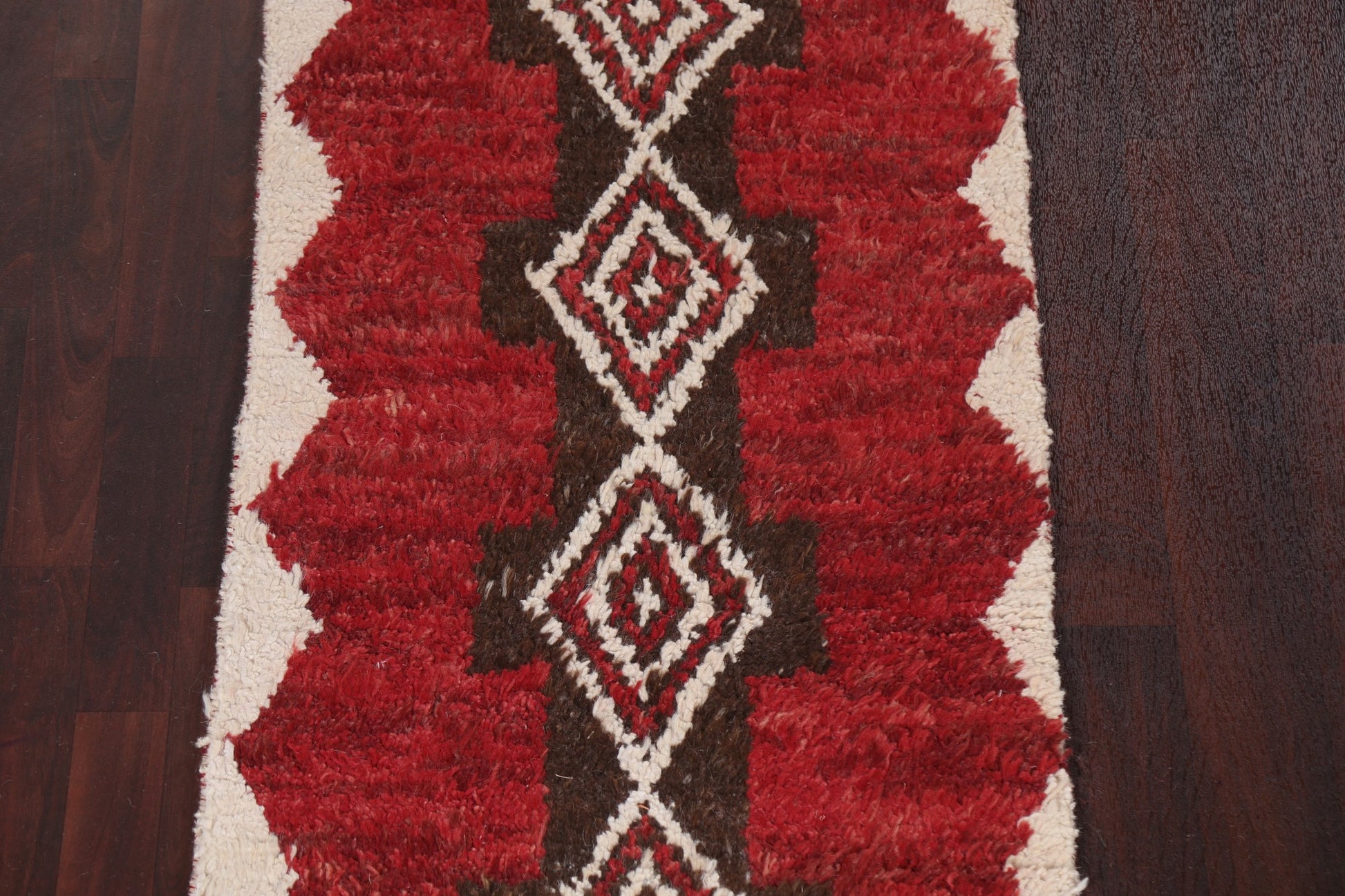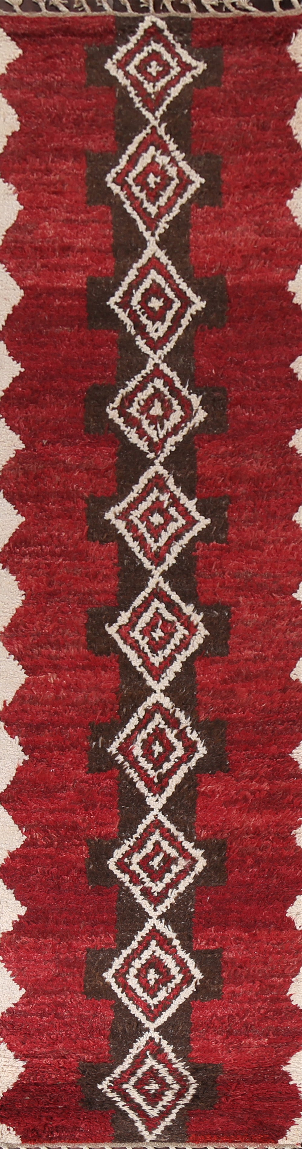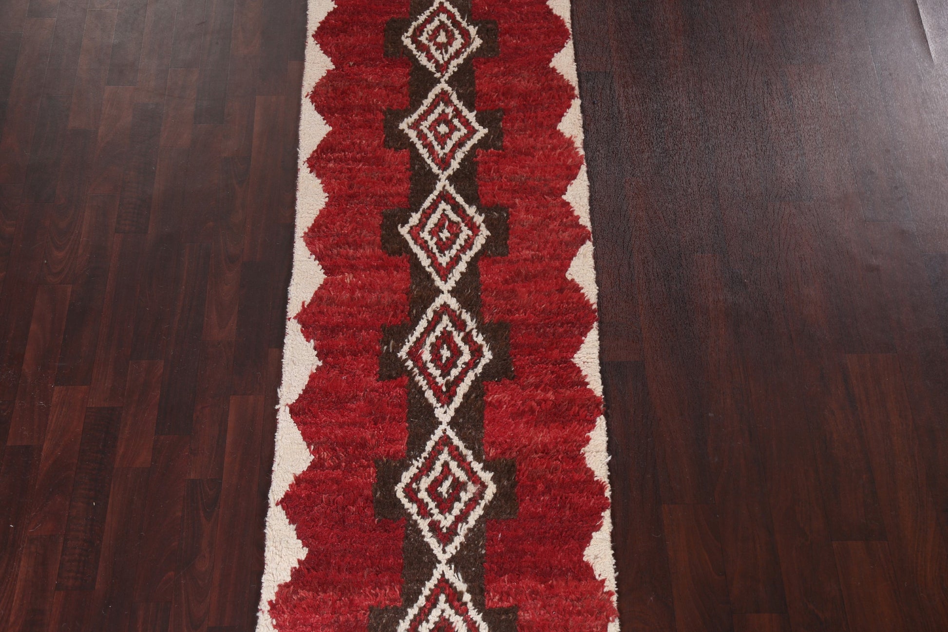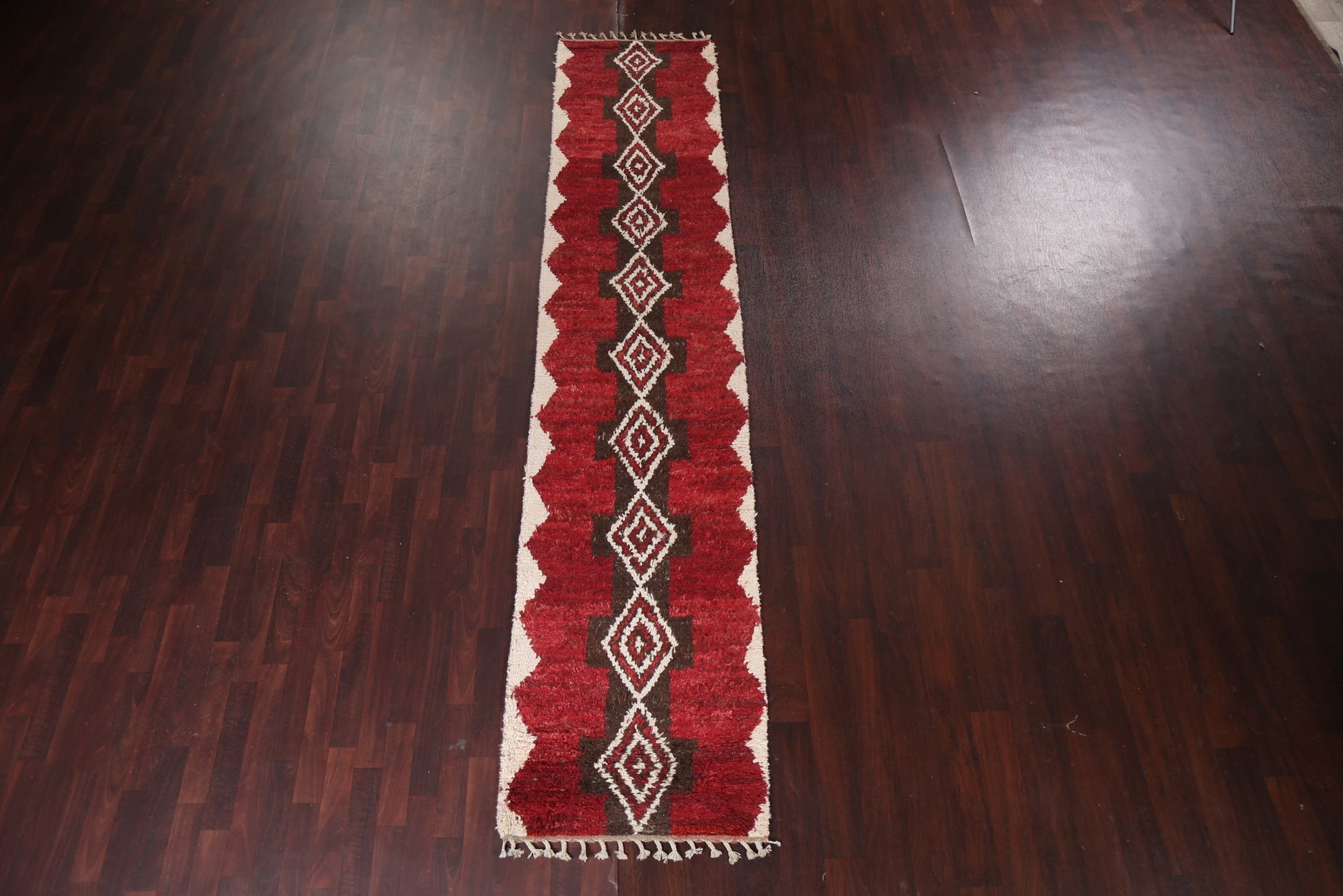 A Beautiful Genuine Morocco Moroccan rug is Hand Knotted by skillful weavers in Morocco with 100% Wool Material. This rug is in New, First Quality condition. dimensions are 12' 3'' X 2' 7'' in foot and 373 X 79 in centimeter. the primary color is Red.