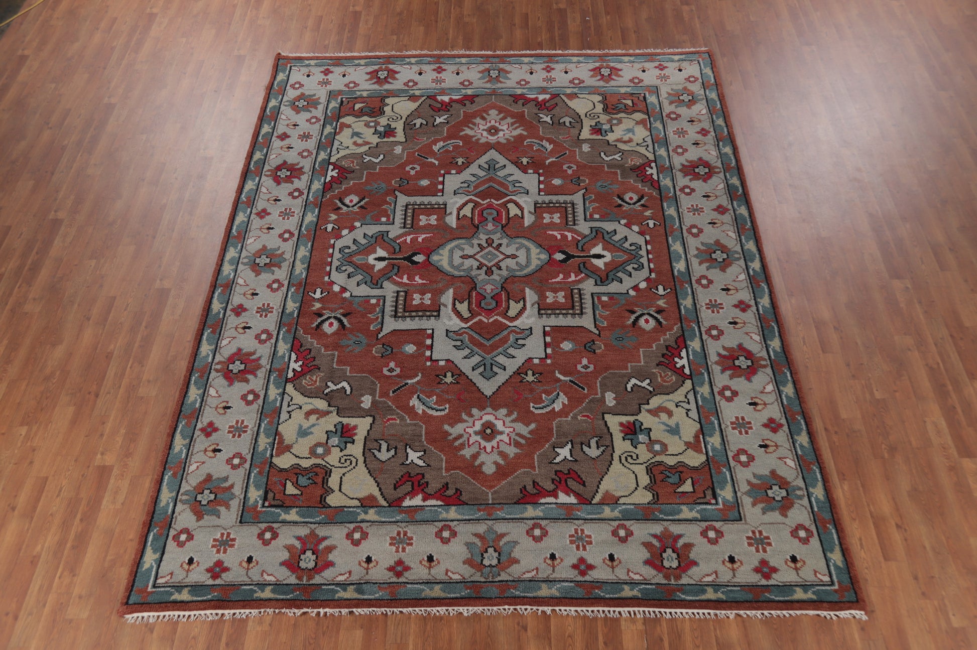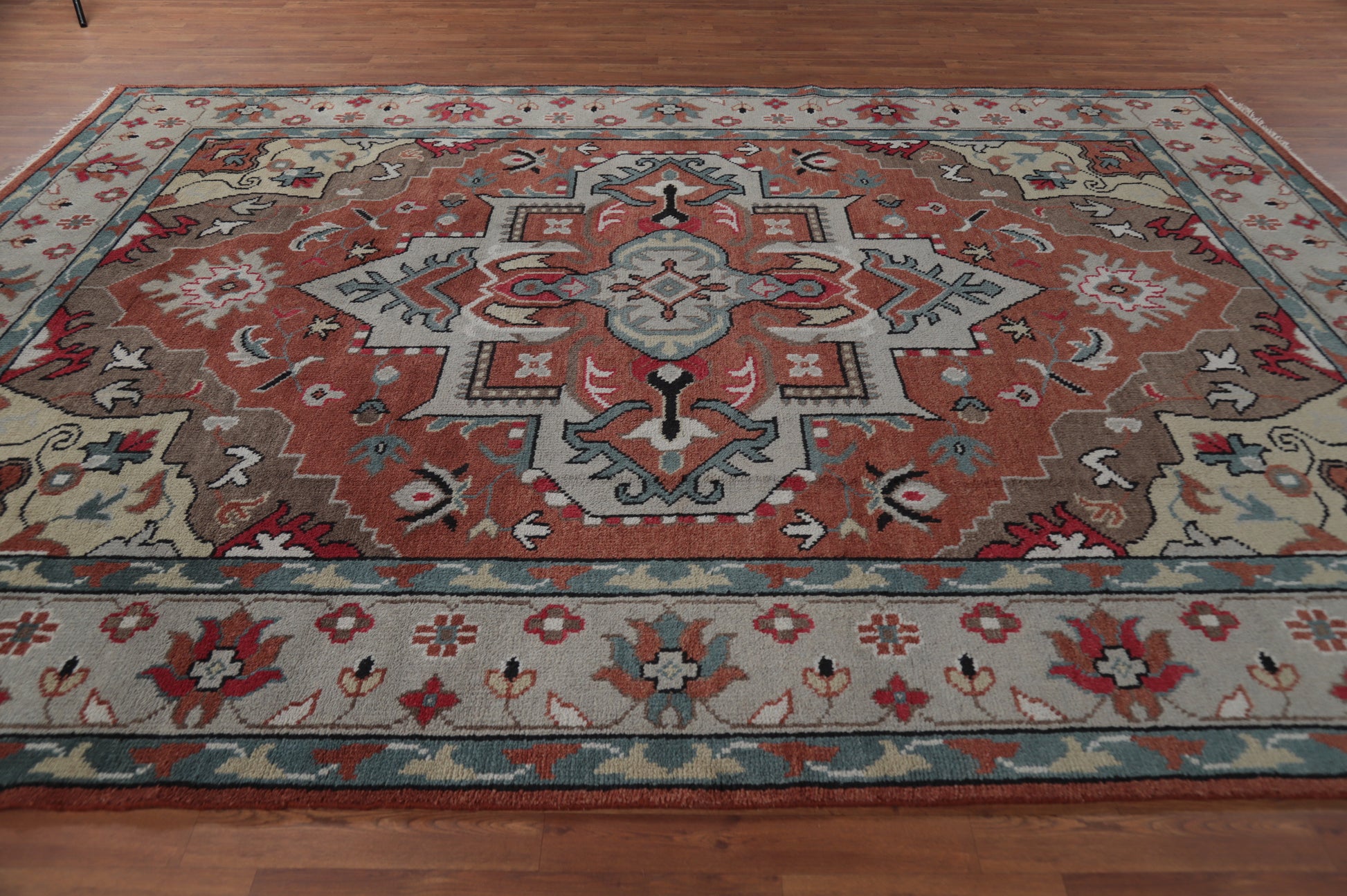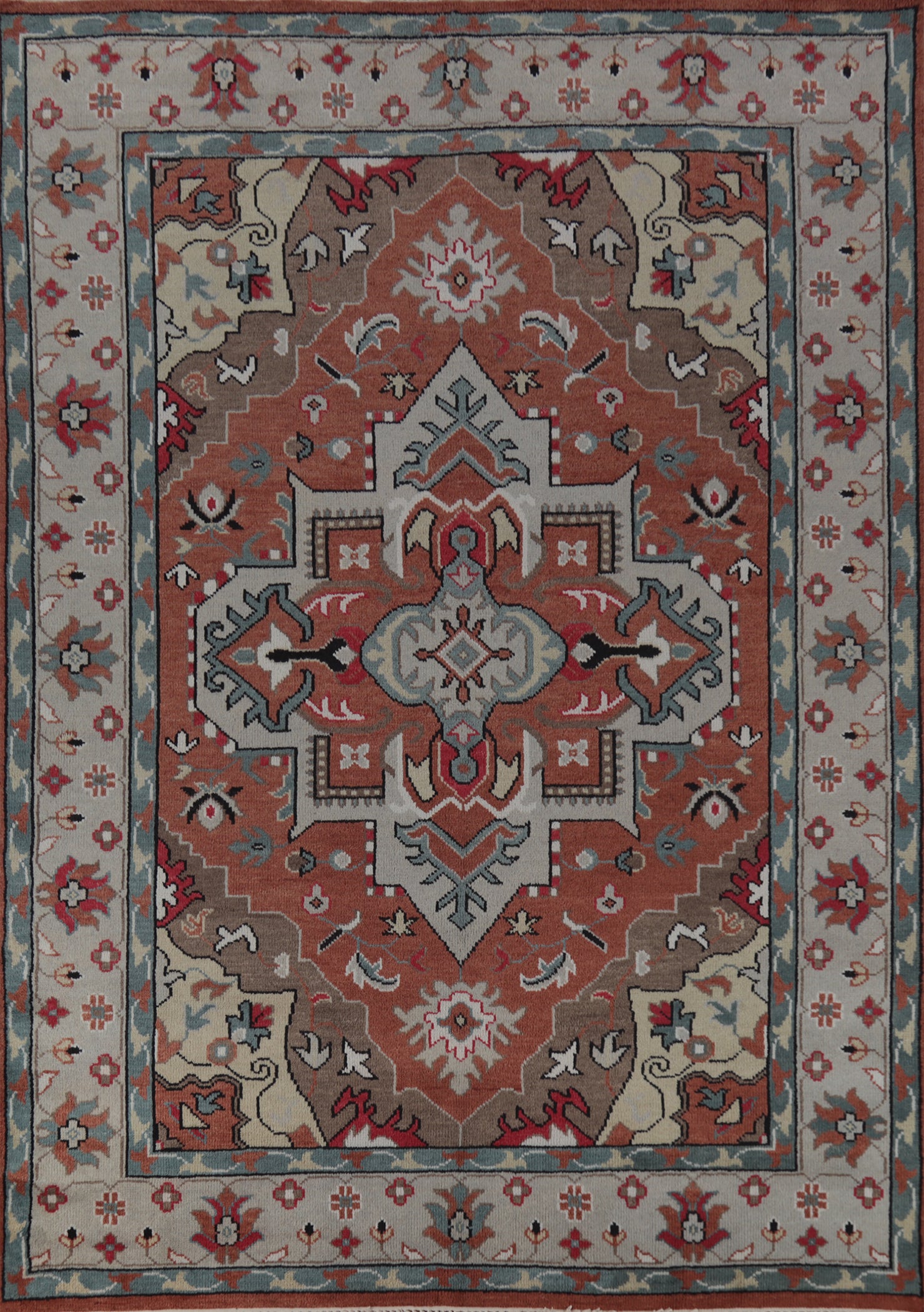 A Beautiful Genuine India Oushak rug is Hand Knotted by skillful weavers in India with 100% Wool Material. This rug is in New, First Quality condition. dimensions are 11' 9'' X 8' 10'' in foot and 358 X 269 in centimeter. the primary color is Oranges & Rust.