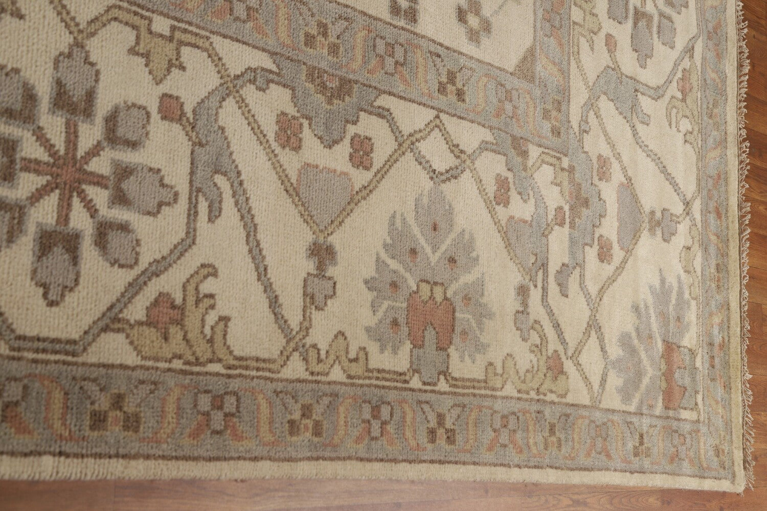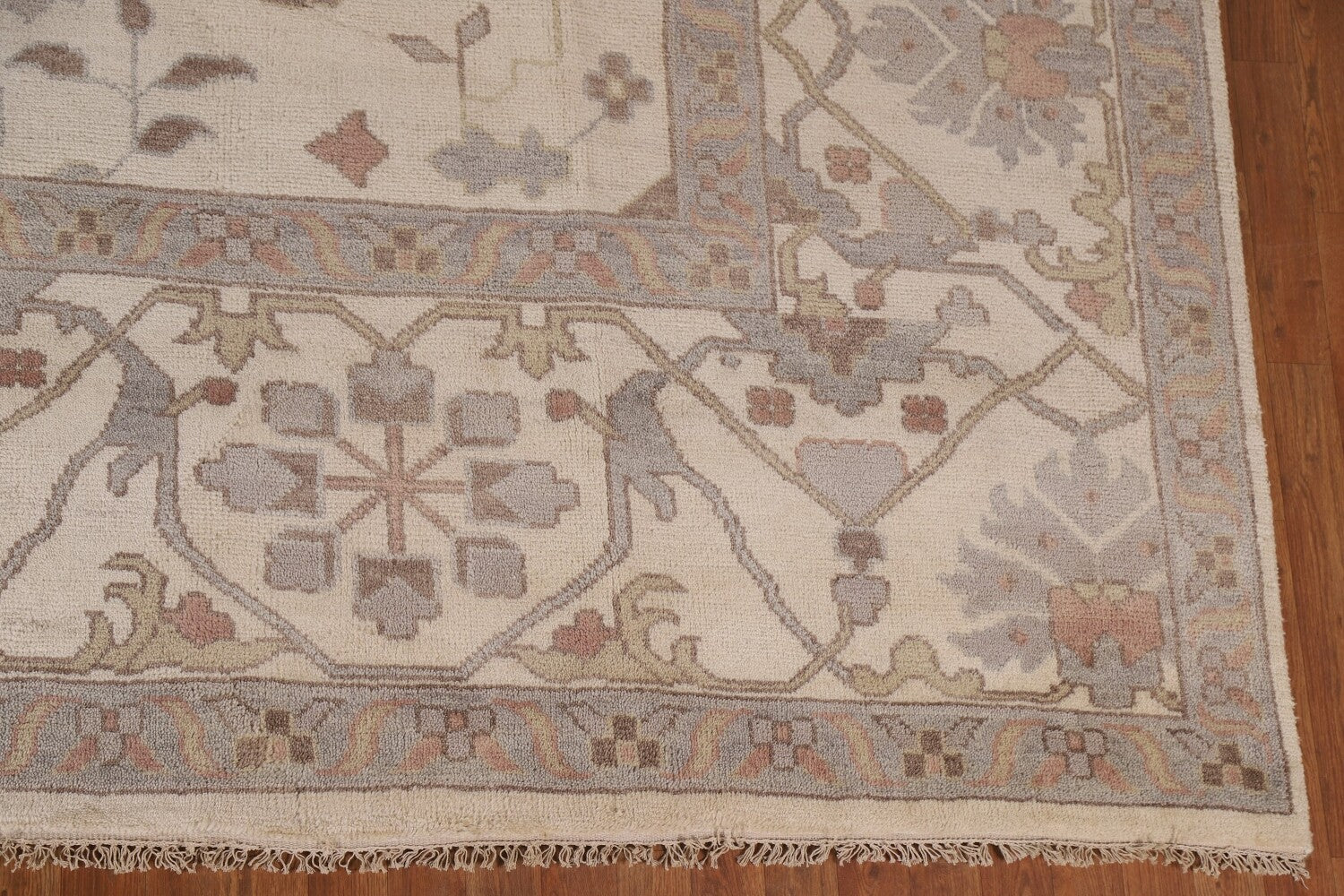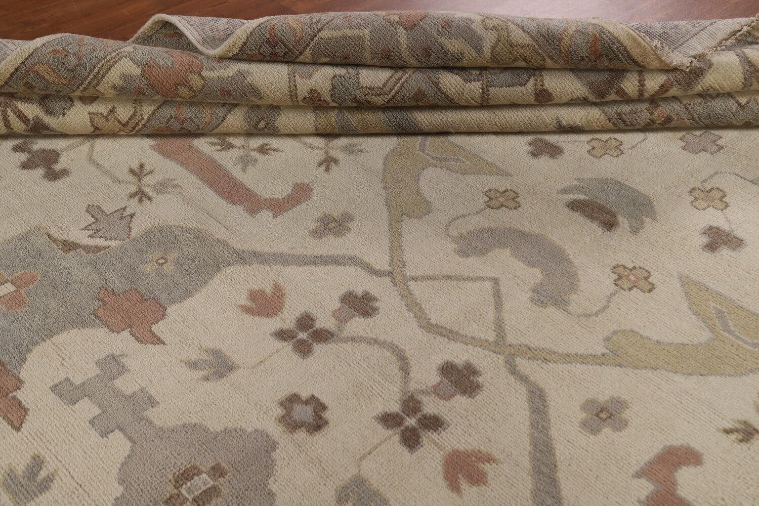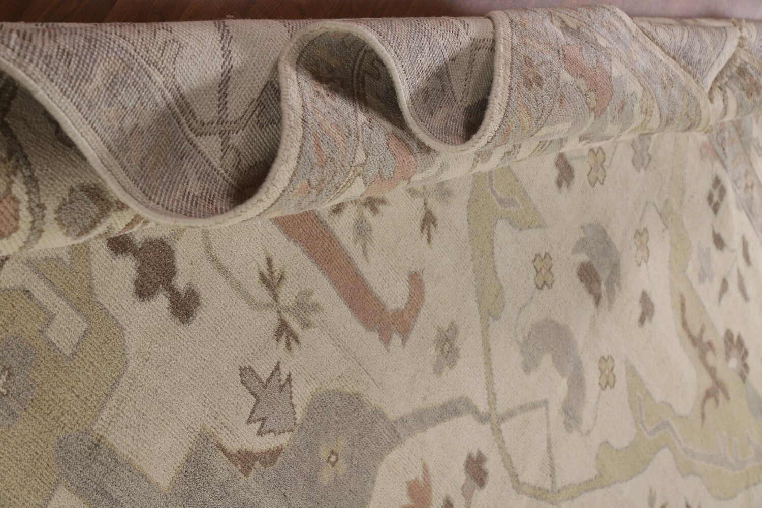 A Beautiful Genuine India Oushak rug is Hand Knotted by skillful weavers in India with 100% Wool Material. This rug is in condition. dimensions are 14' 11'' X 12' 0'' in foot and 455 X 366 in centimeter. the primary color is Beige & Ivories.