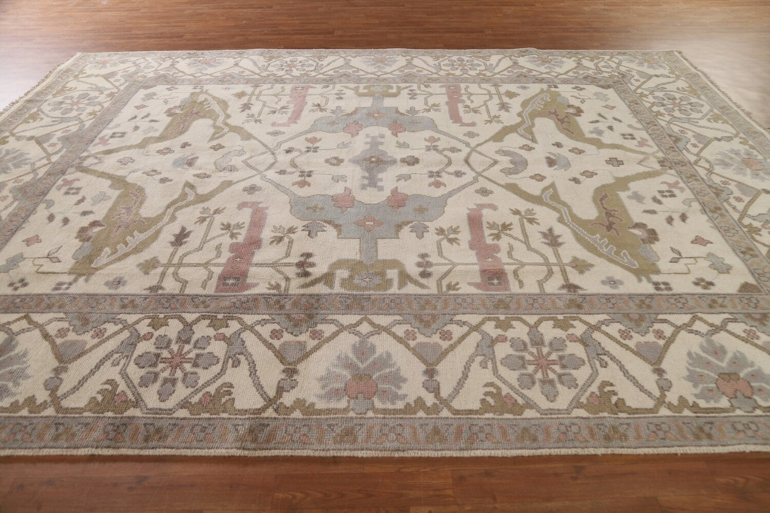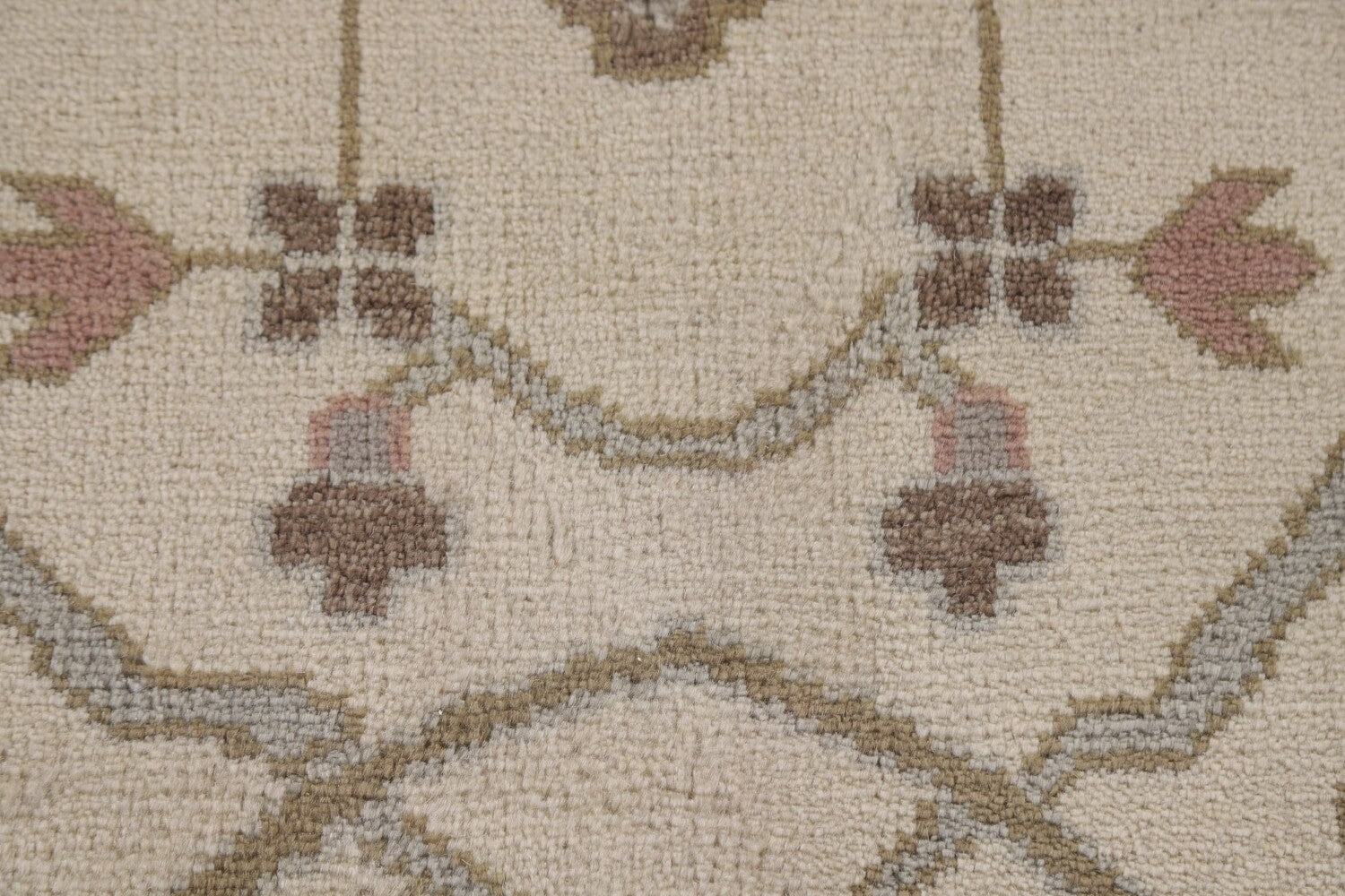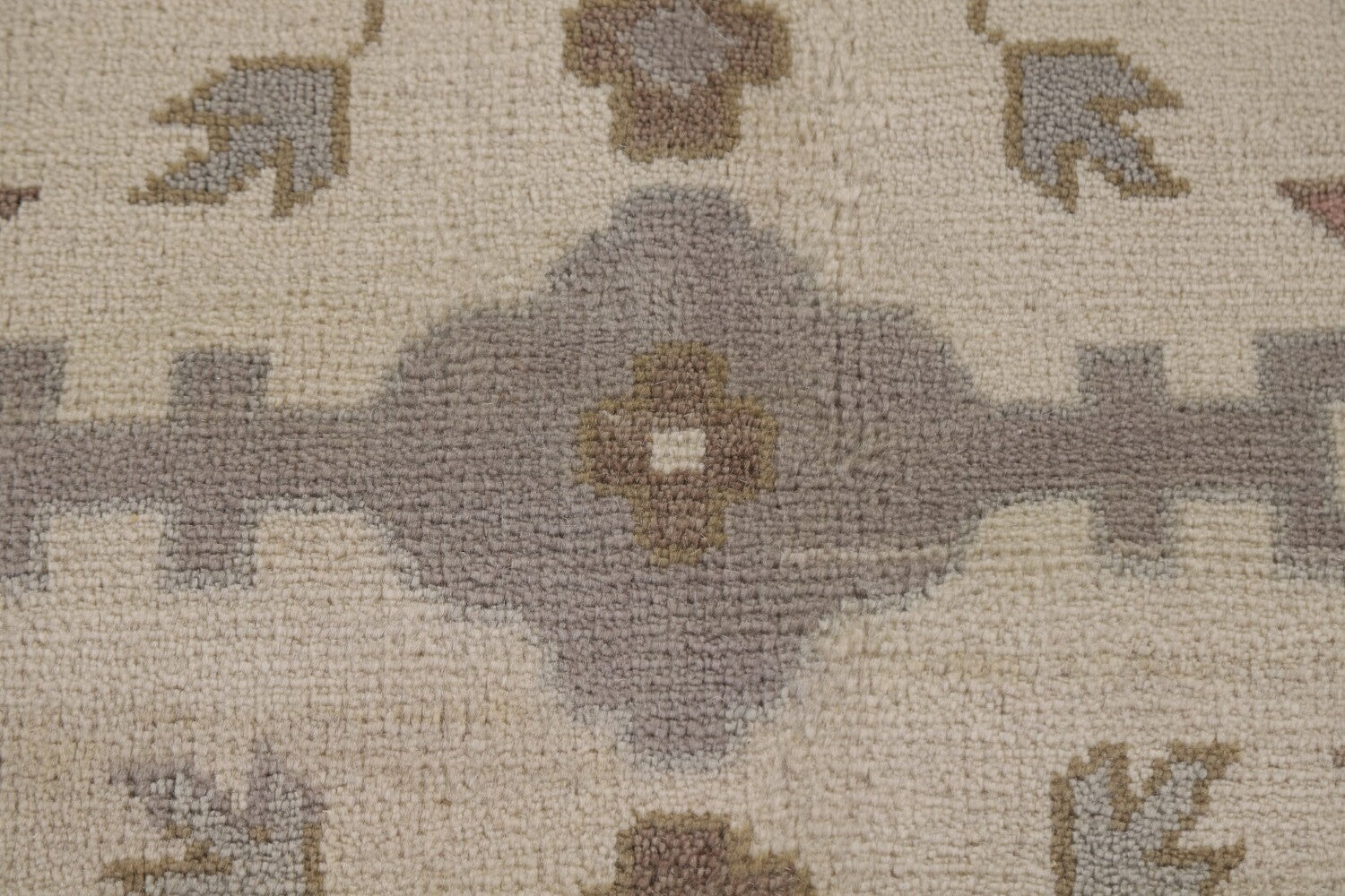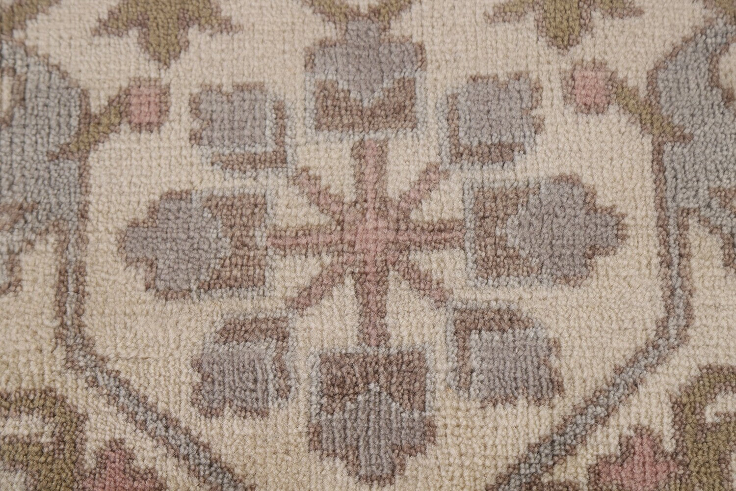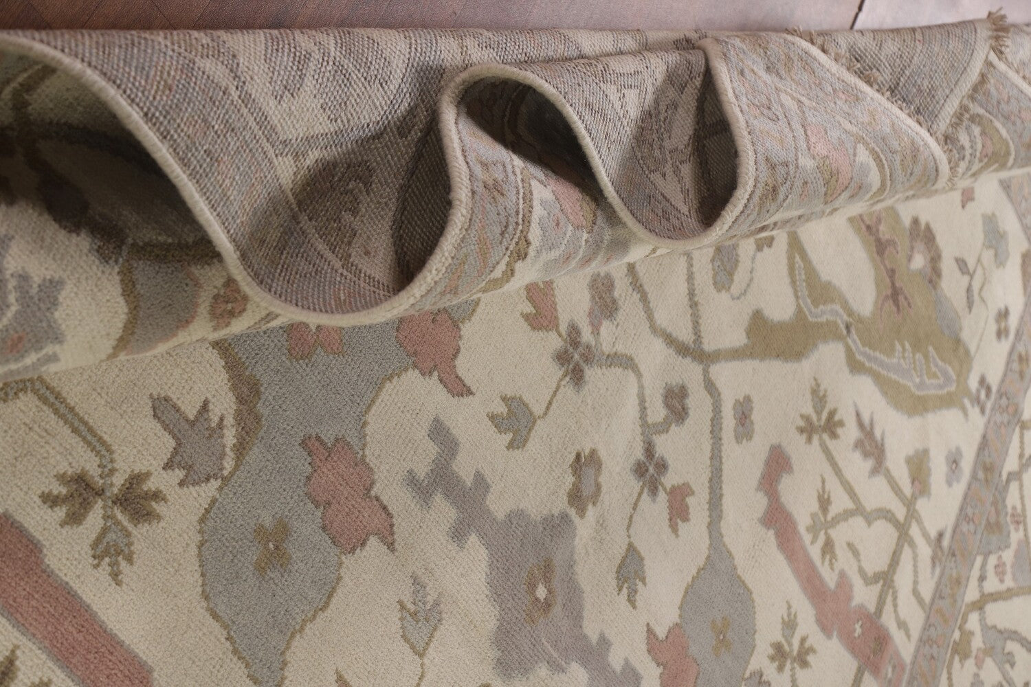 A Beautiful Genuine India Oushak rug is Hand Knotted by skillful weavers in India with 100% Wool Material. This rug is in New, First Quality condition. dimensions are 12' 2'' X 9' 1'' in foot and 371 X 277 in centimeter. the primary color is Beige & Ivories.
