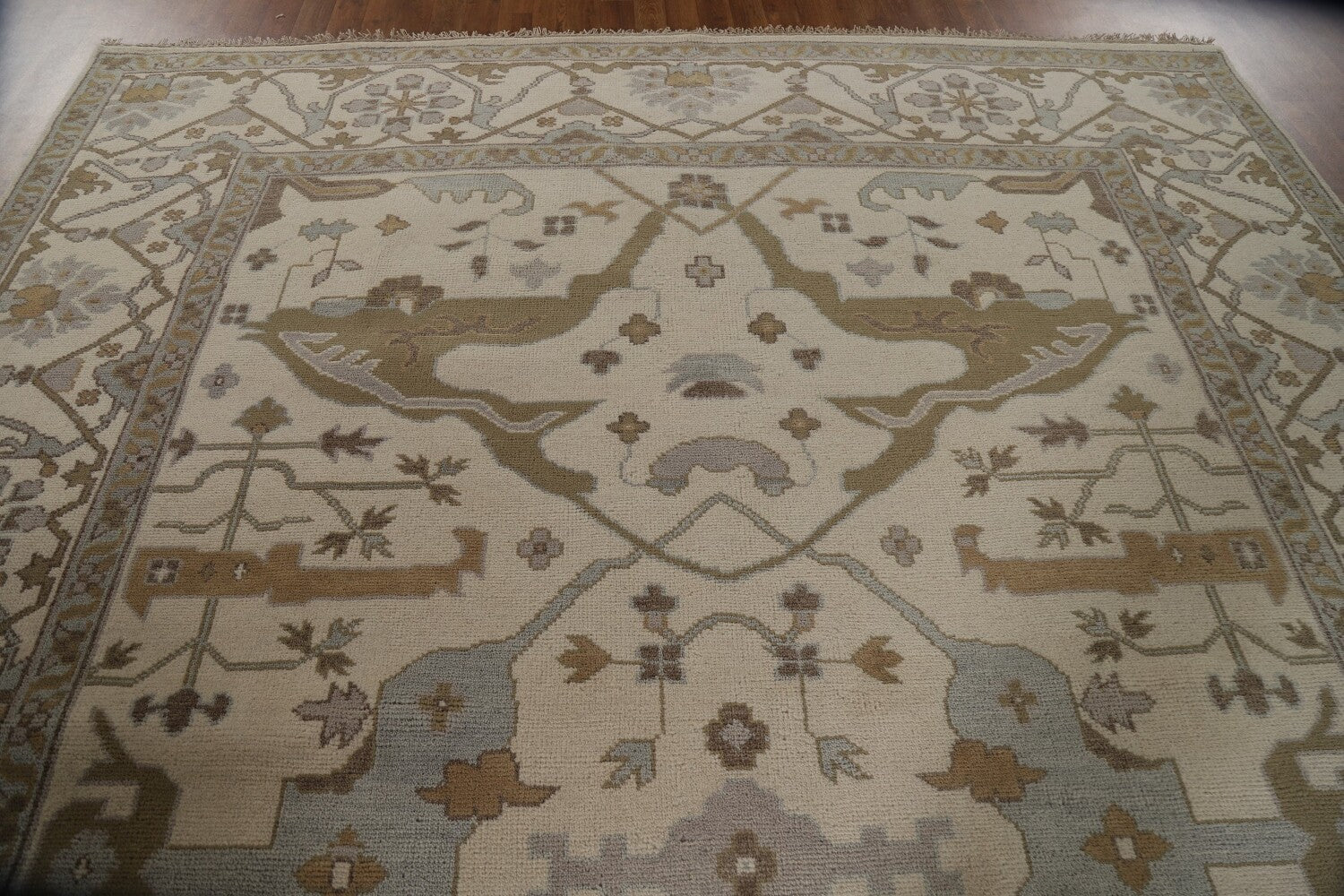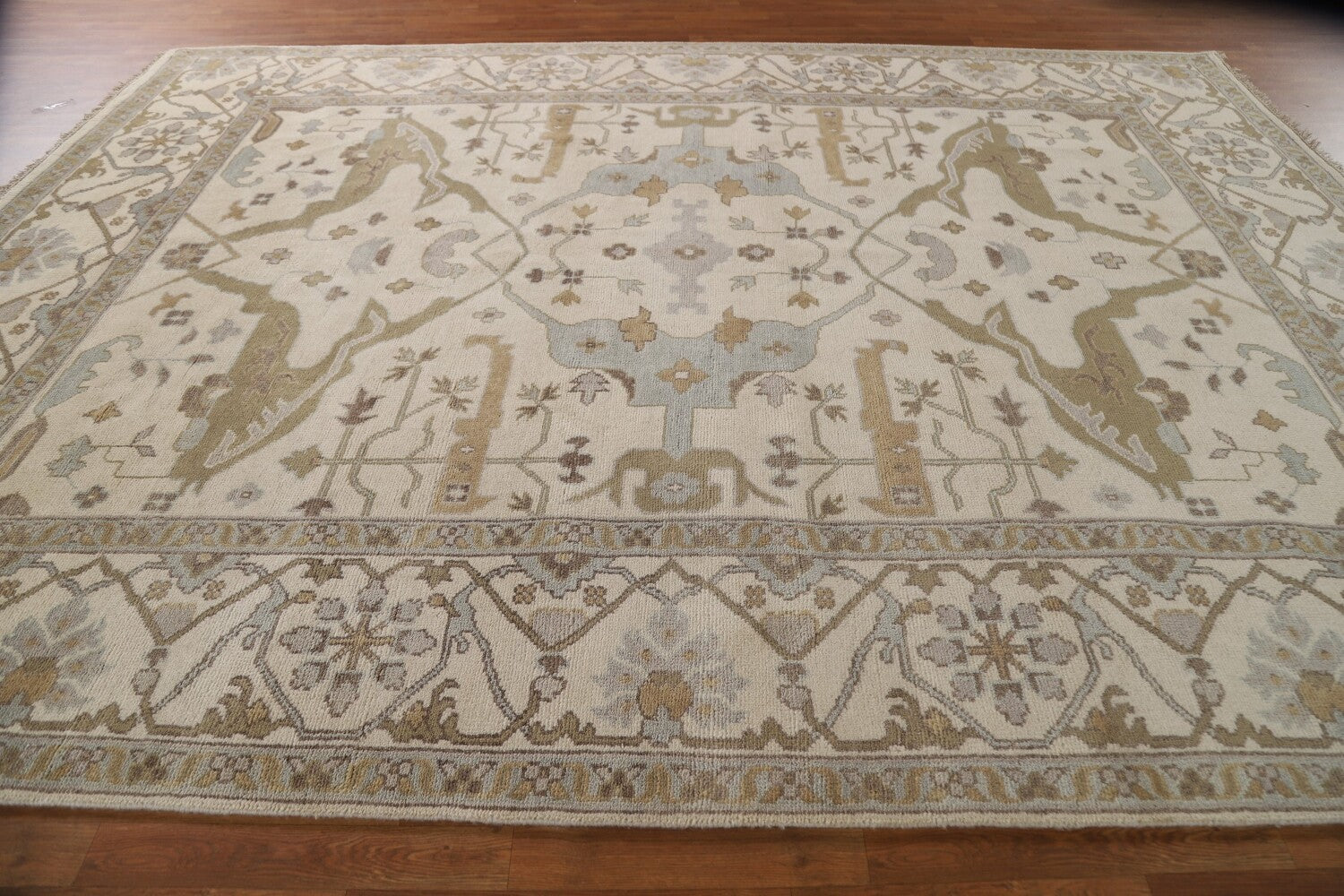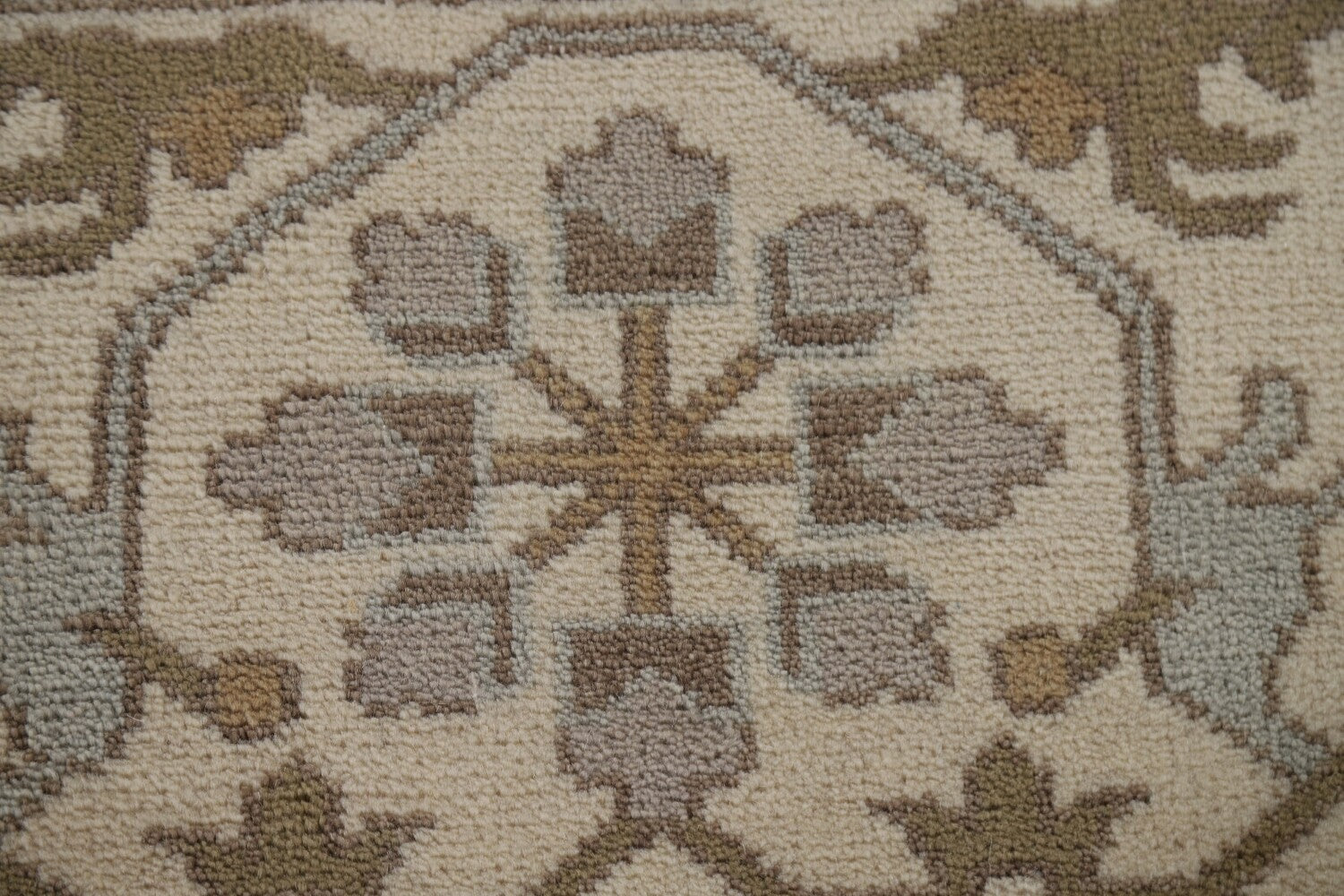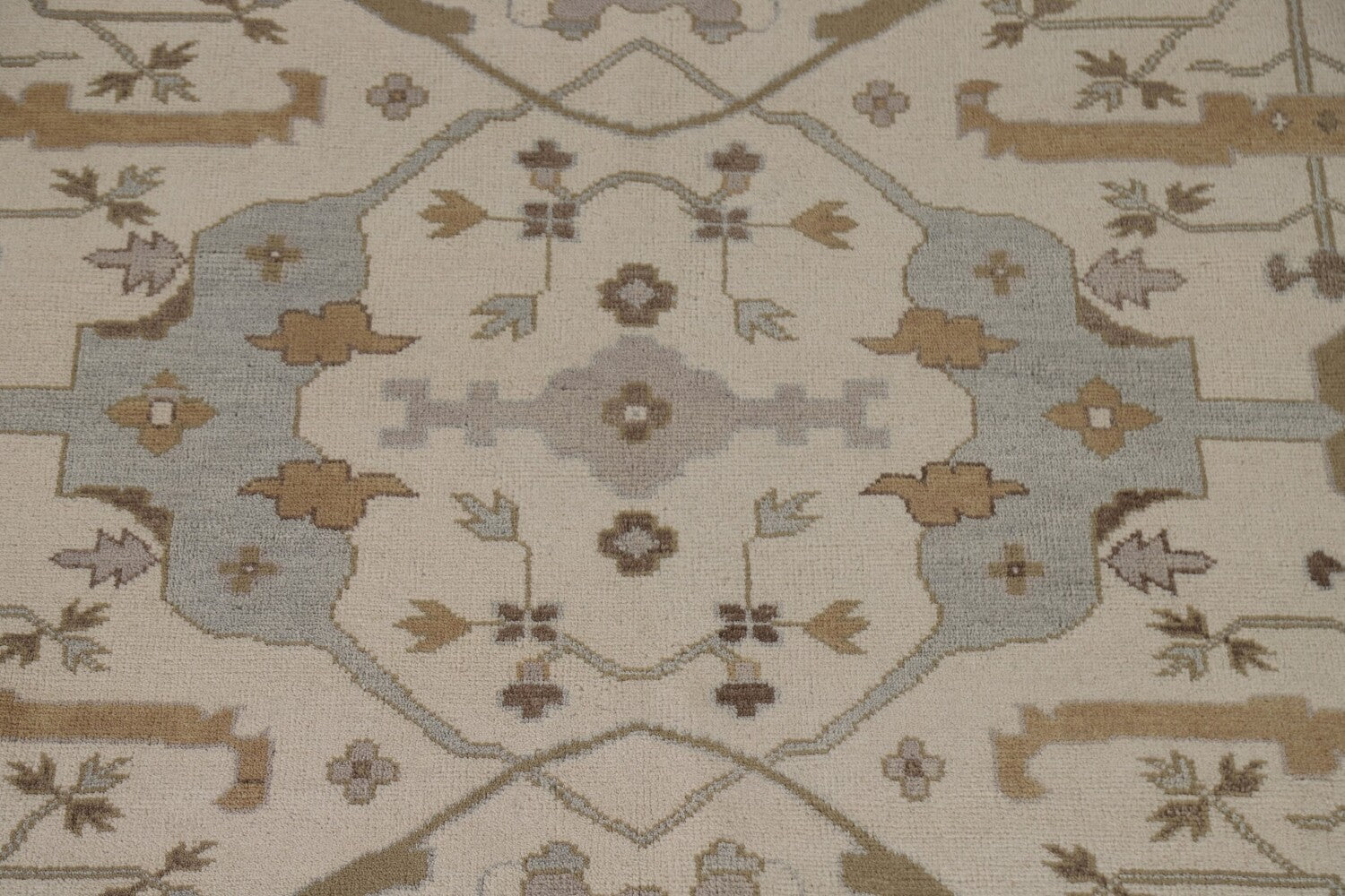 A Beautiful Genuine India Oushak rug is Hand Knotted by skillful weavers in India with 100% Wool Material. This rug is in New, First Quality condition. dimensions are 11' 11'' X 9' 0'' in foot and 363 X 274 in centimeter. the primary color is Beige & Ivories.