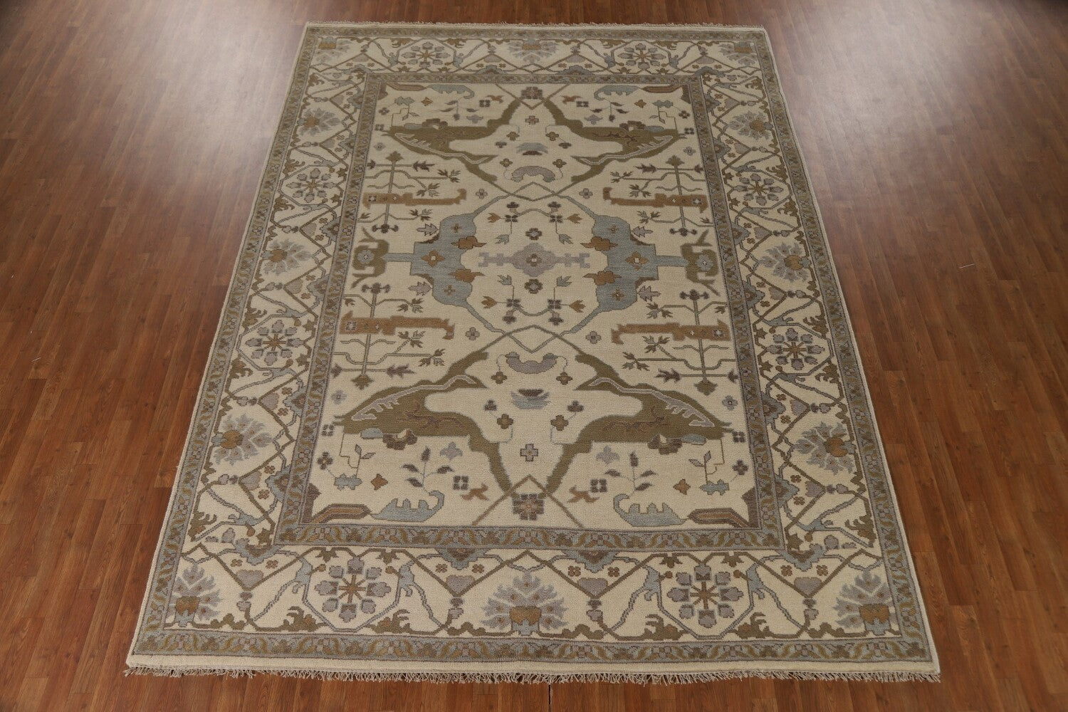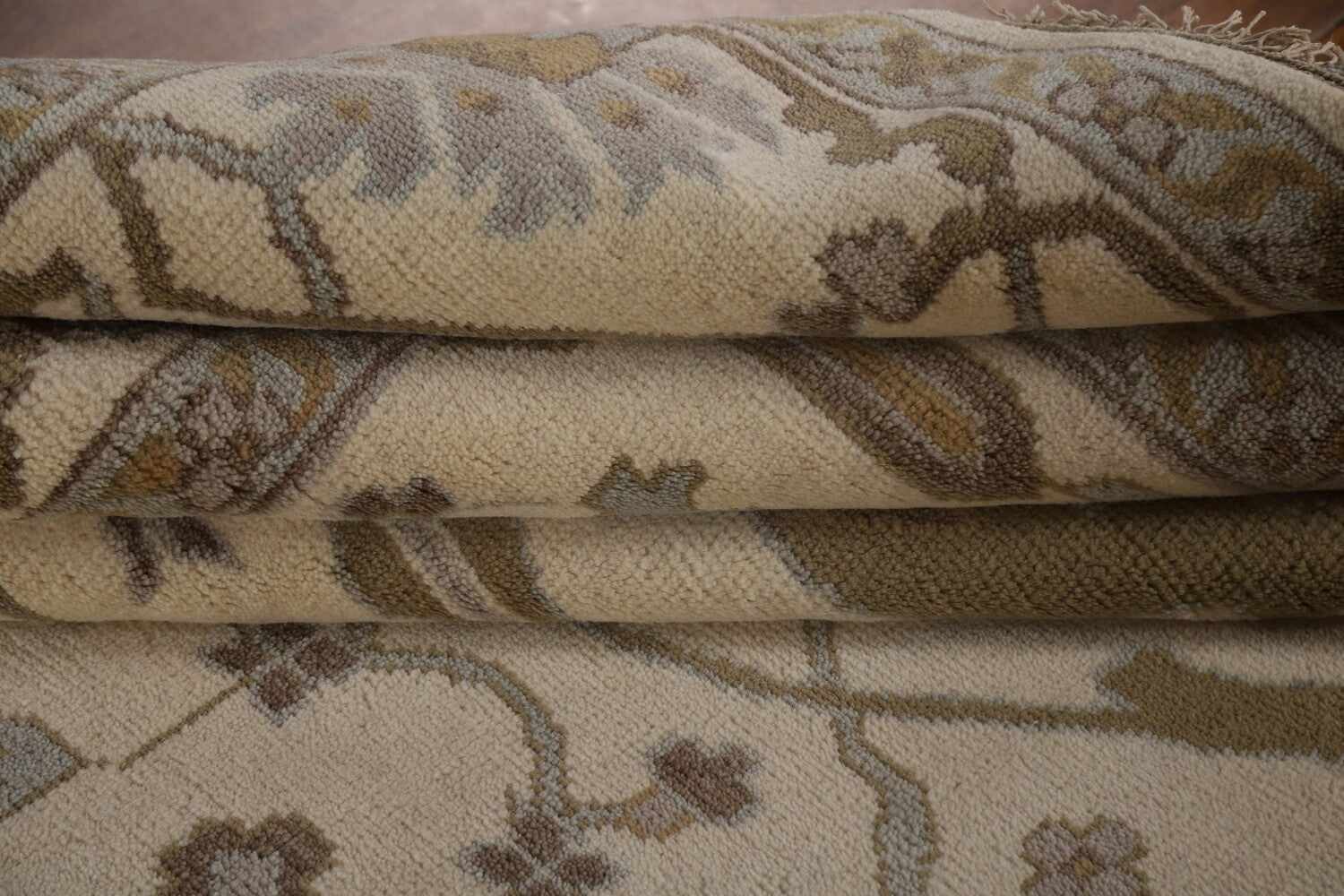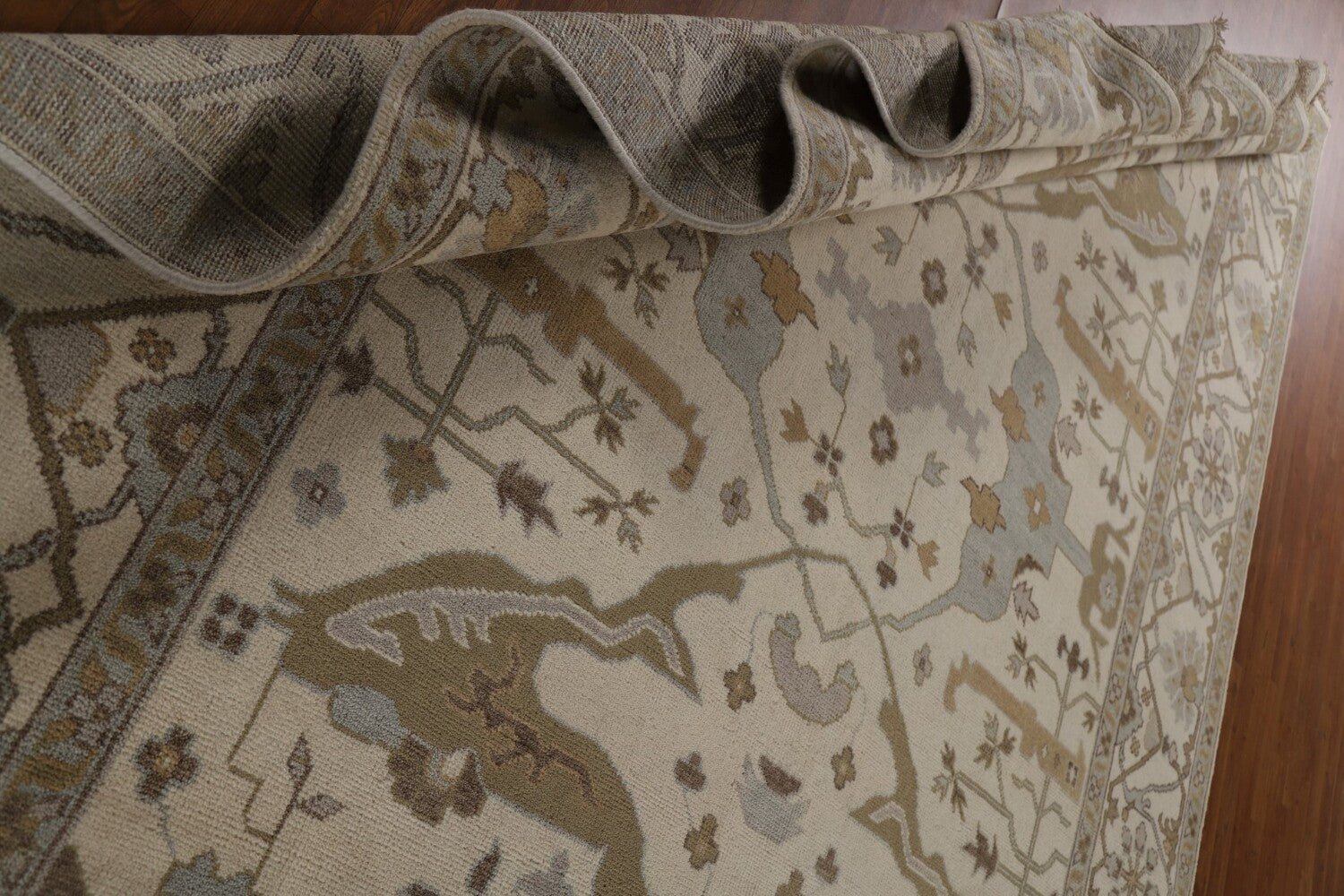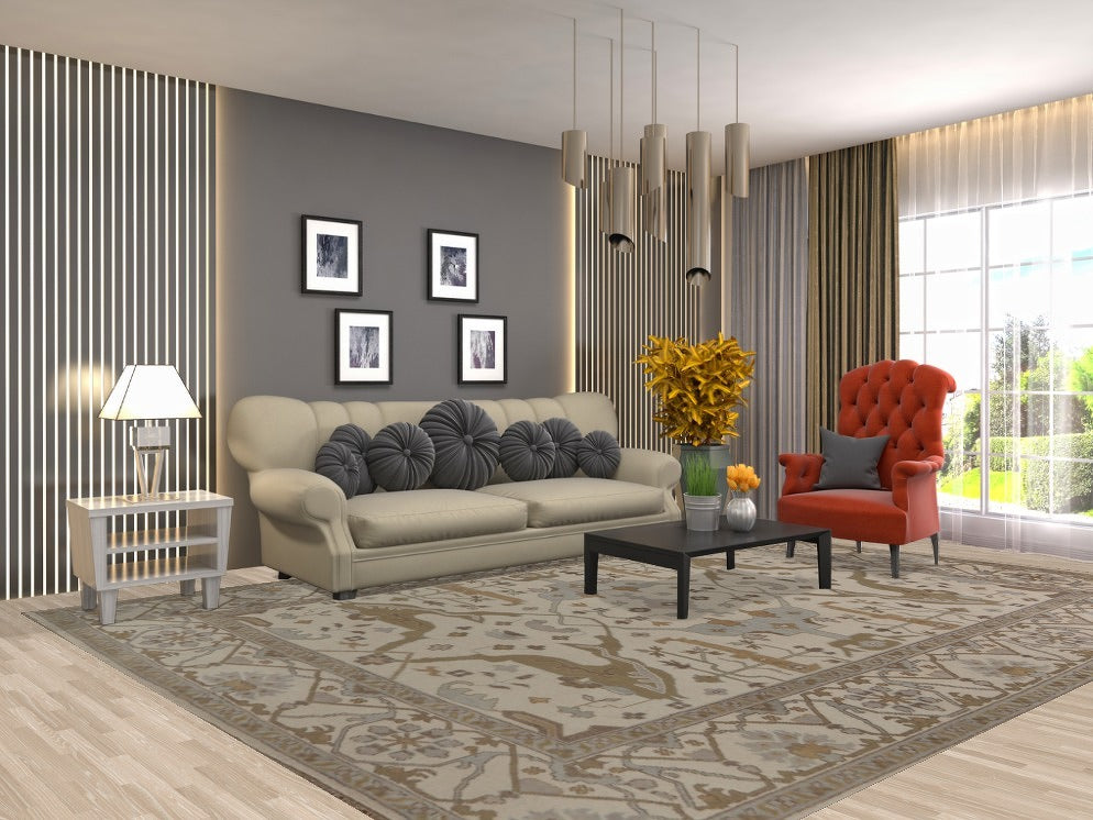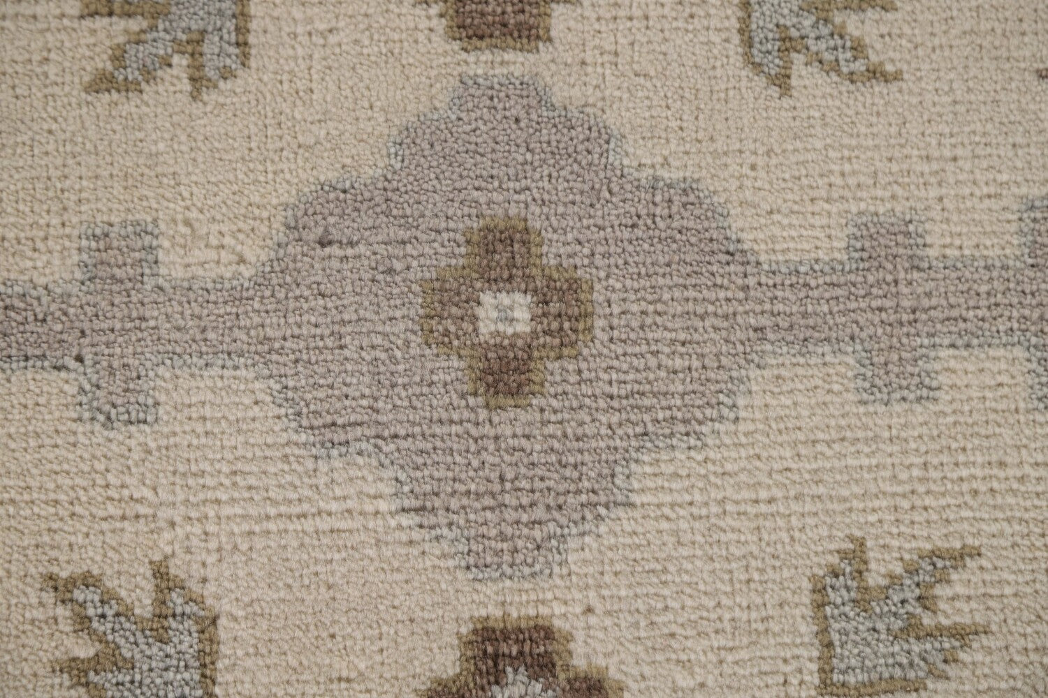 A Beautiful Genuine India Oushak rug is Hand Knotted by skillful weavers in India with 100% Wool Material. This rug is in New, First Quality condition. dimensions are 11' 11'' X 9' 0'' in foot and 363 X 274 in centimeter. the primary color is Beige & Ivories.