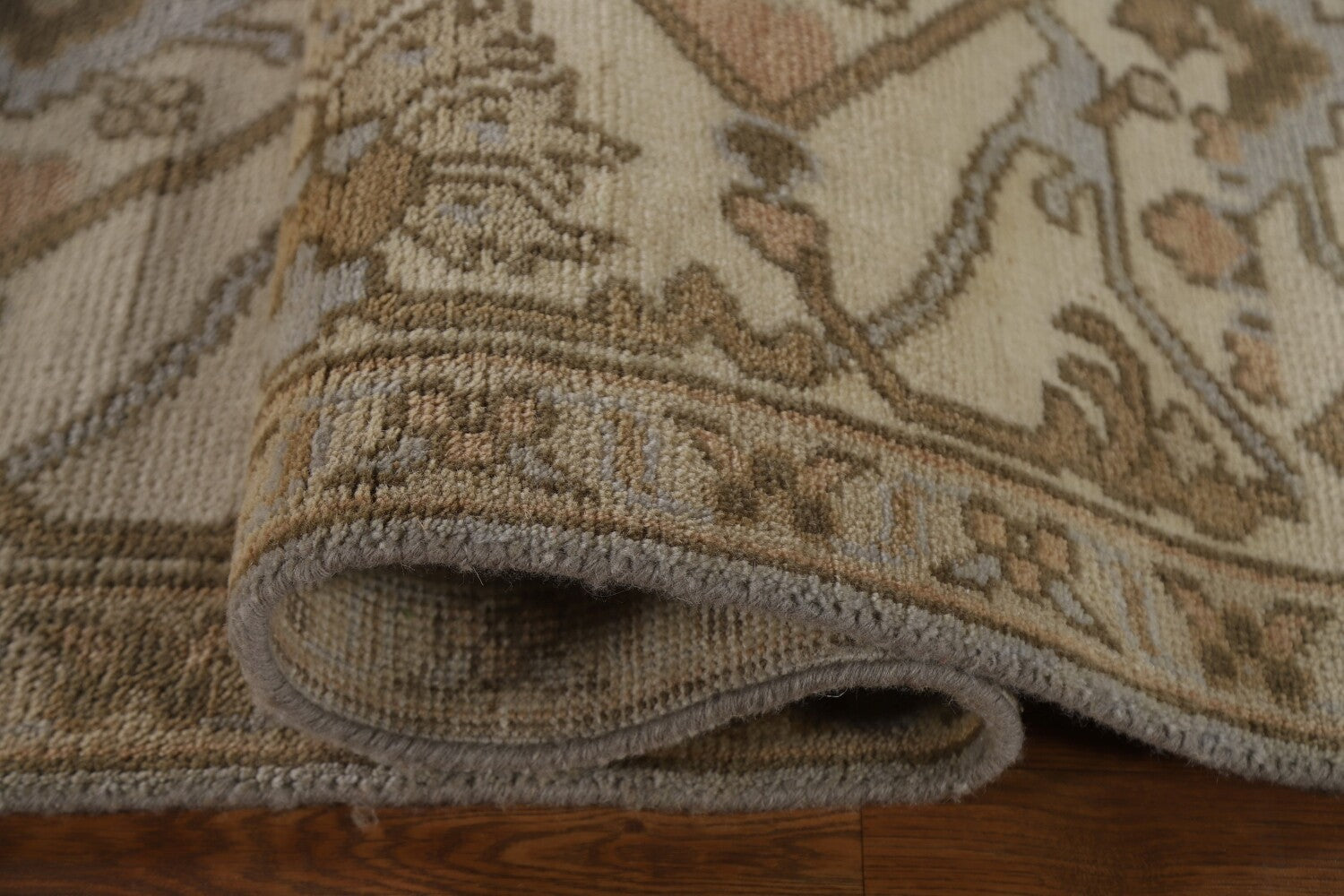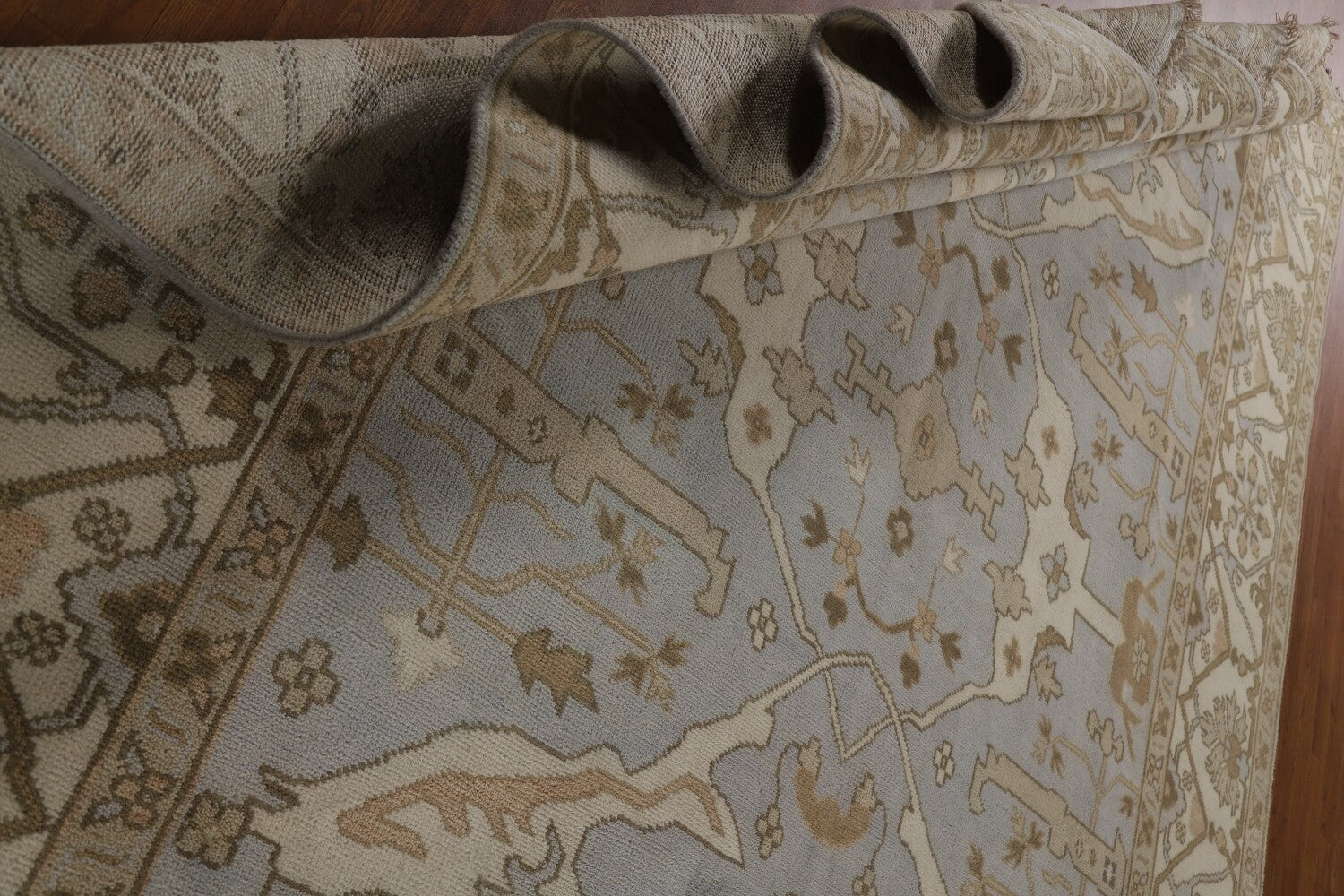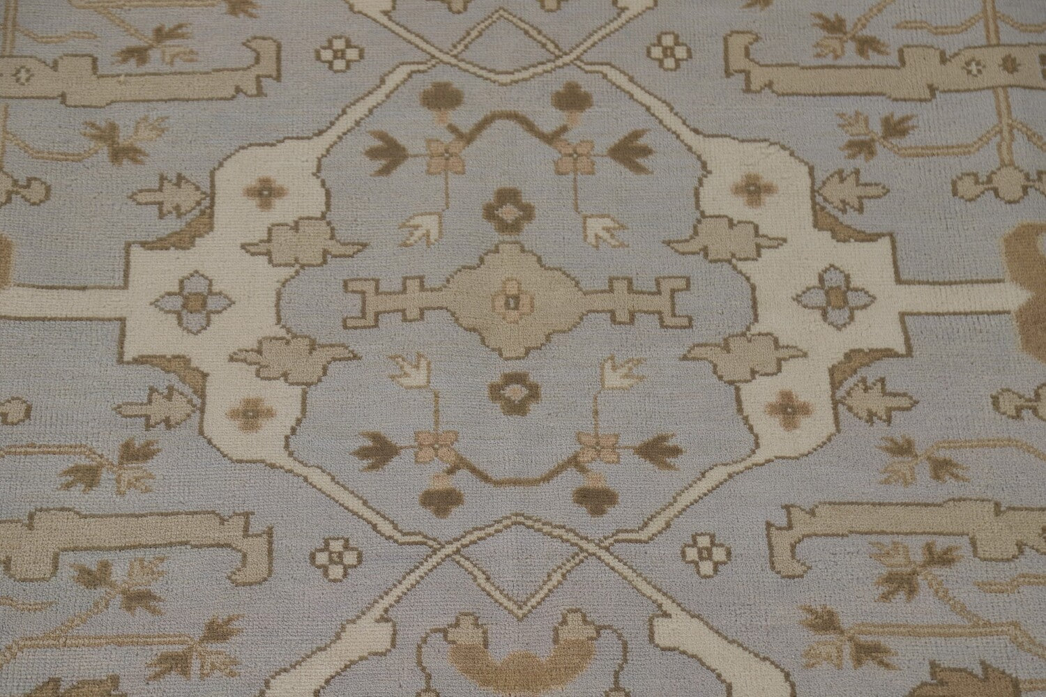 A Beautiful Genuine India Oushak rug is Hand Knotted by skillful weavers in India with 100% Wool Material. This rug is in condition. dimensions are 11' 10'' X 9' 0'' in foot and 361 X 274 in centimeter. the primary color is Greys & Charcoal.