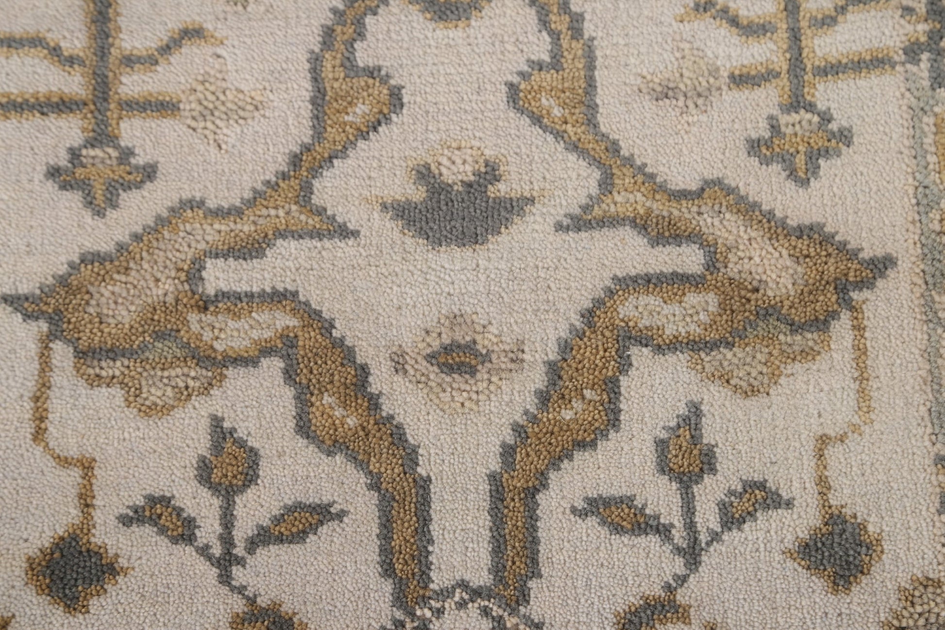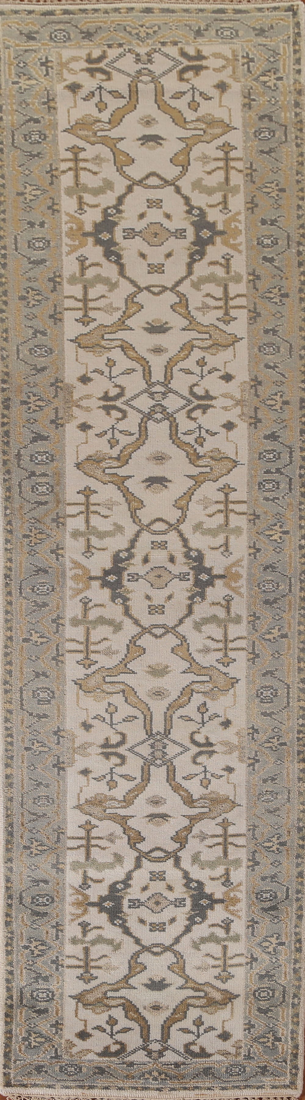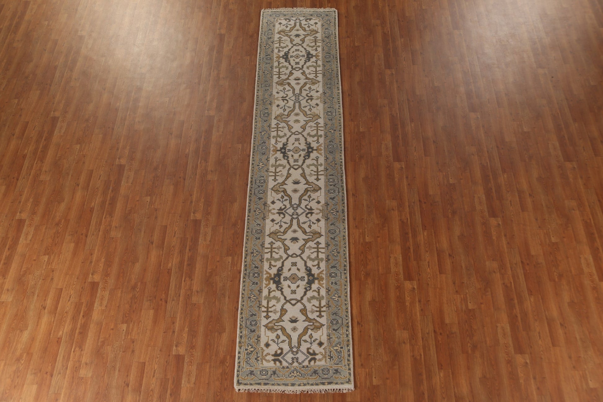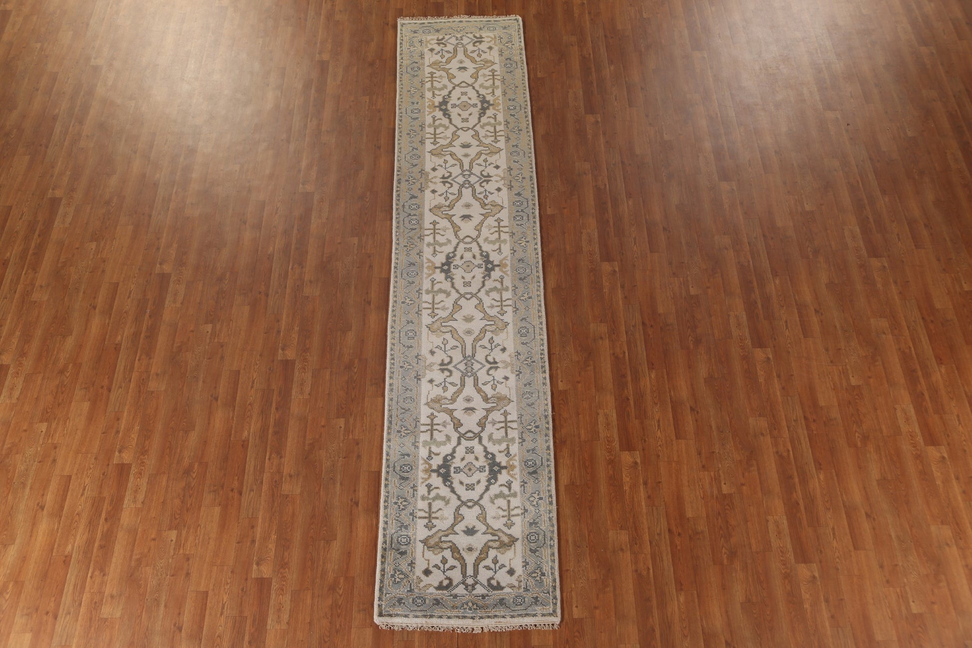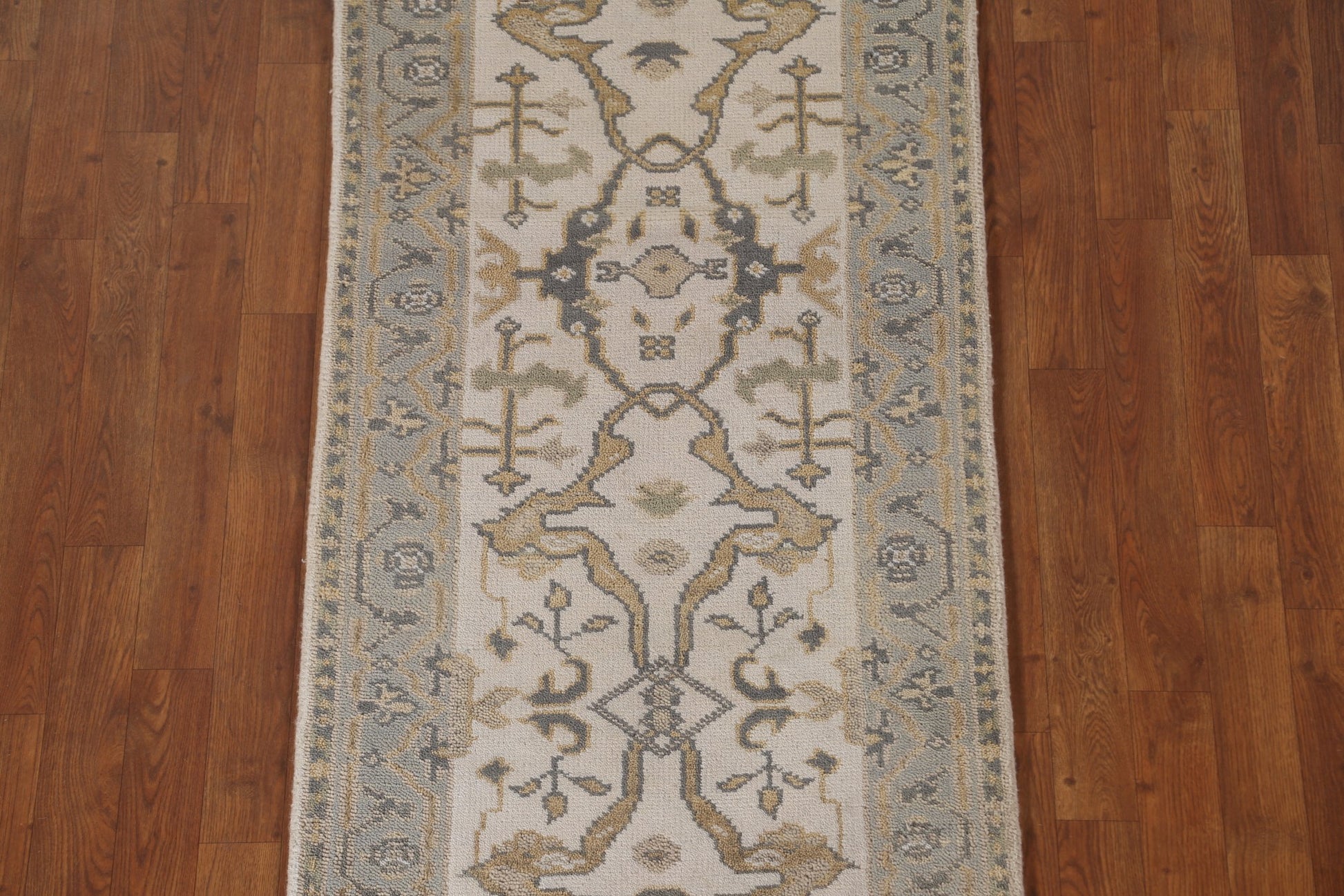 A Beautiful Genuine India Oushak rug is Hand Knotted by skillful weavers in India with 100% Wool Material. This rug is in New, First Quality condition. dimensions are 11' 6'' X 2' 5'' in foot and 351 X 74 in centimeter. the primary color is Beige & Ivories.