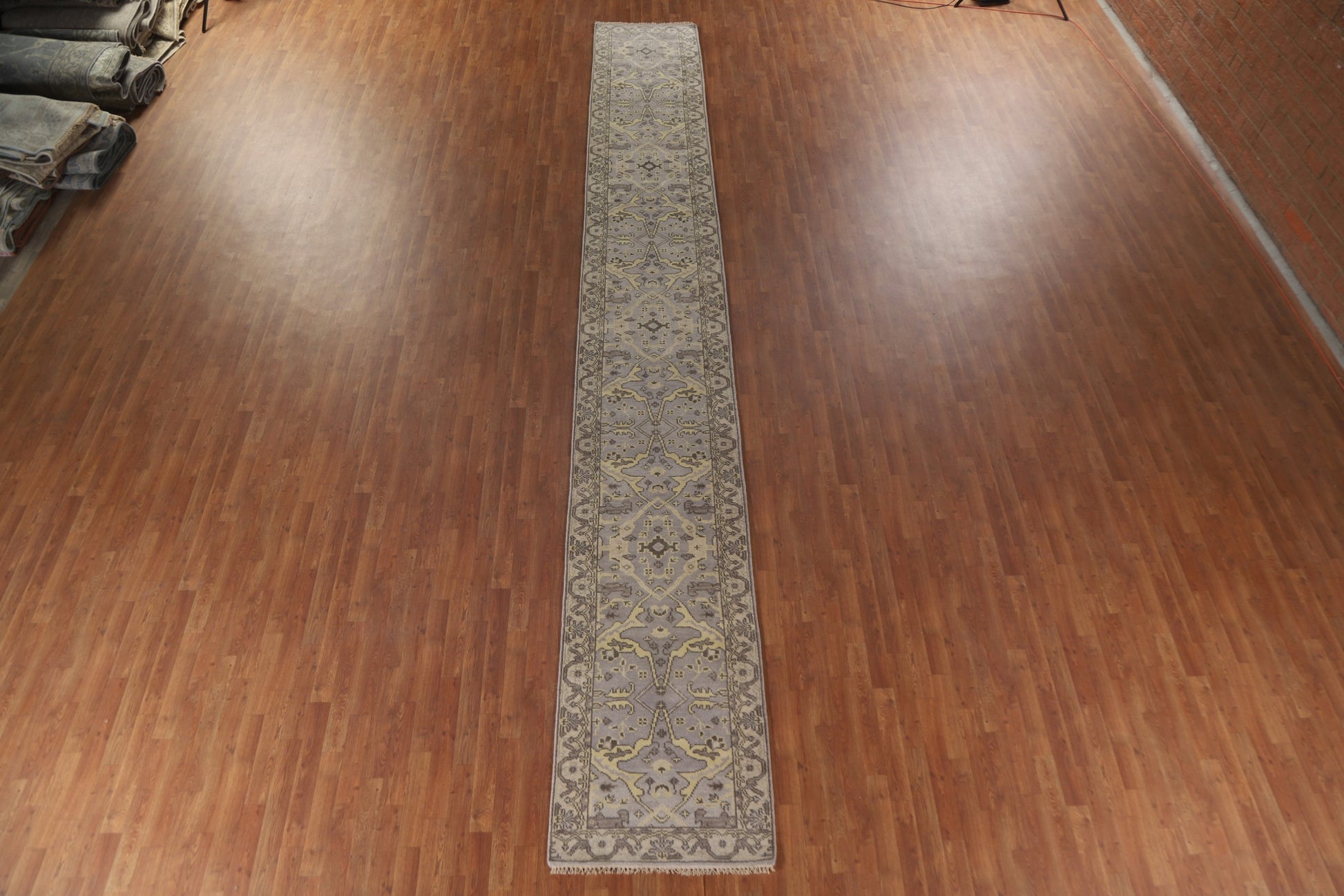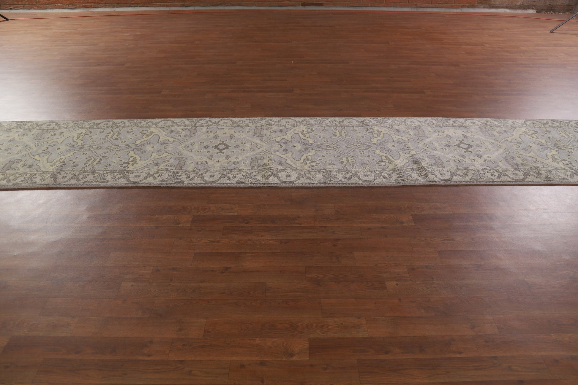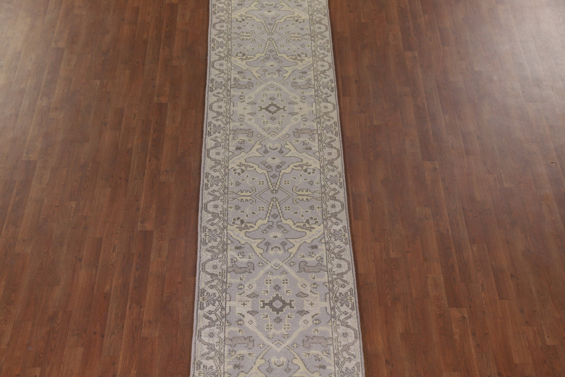 A Beautiful Genuine India Oushak rug is Hand Knotted by skillful weavers in India with 100% Wool Material. This rug is in condition. dimensions are 19' 6'' X 2' 7'' in foot and 594 X 79 in centimeter. the primary color is Greys & Charcoal.