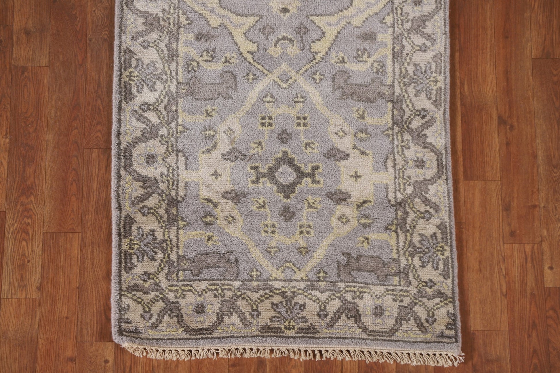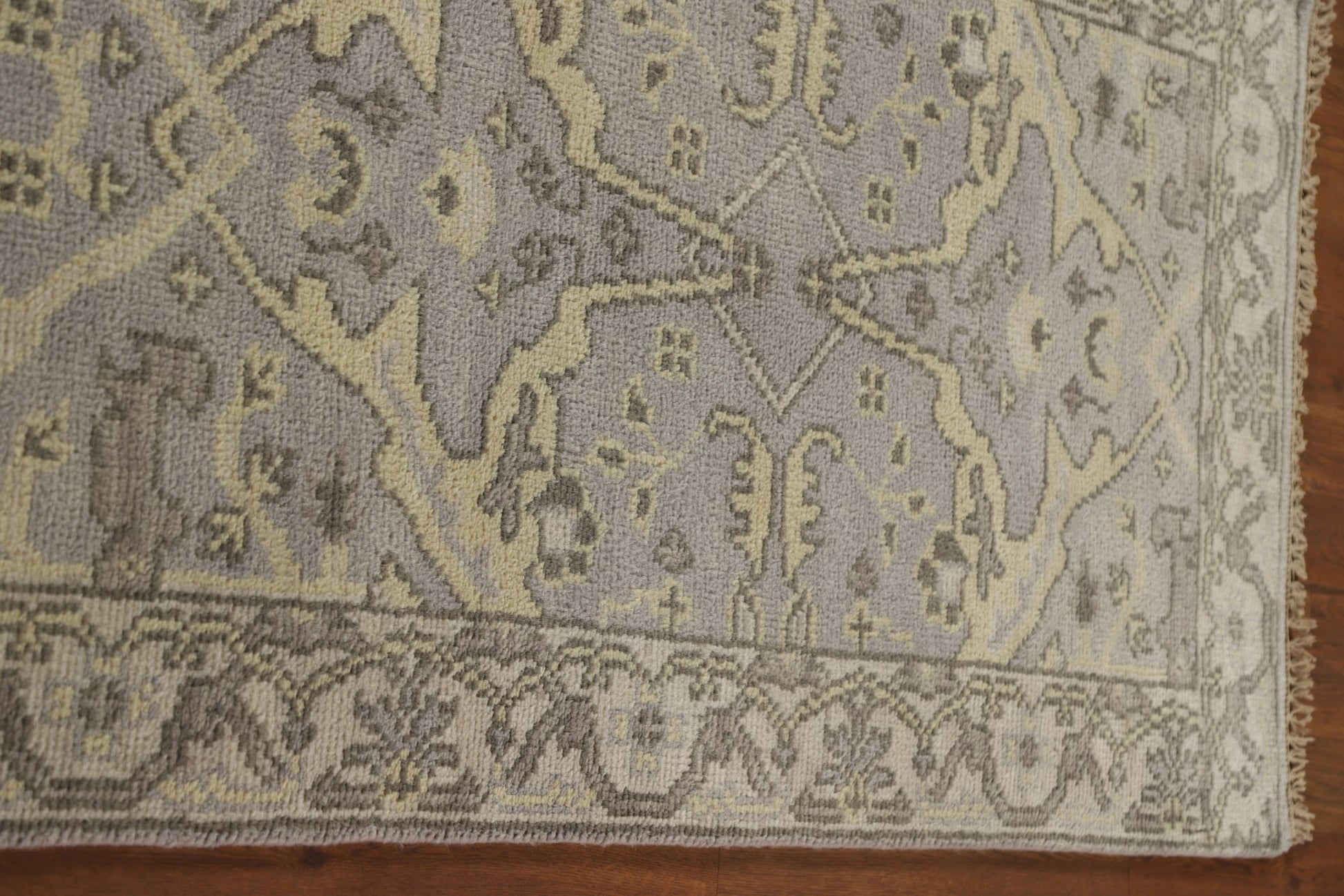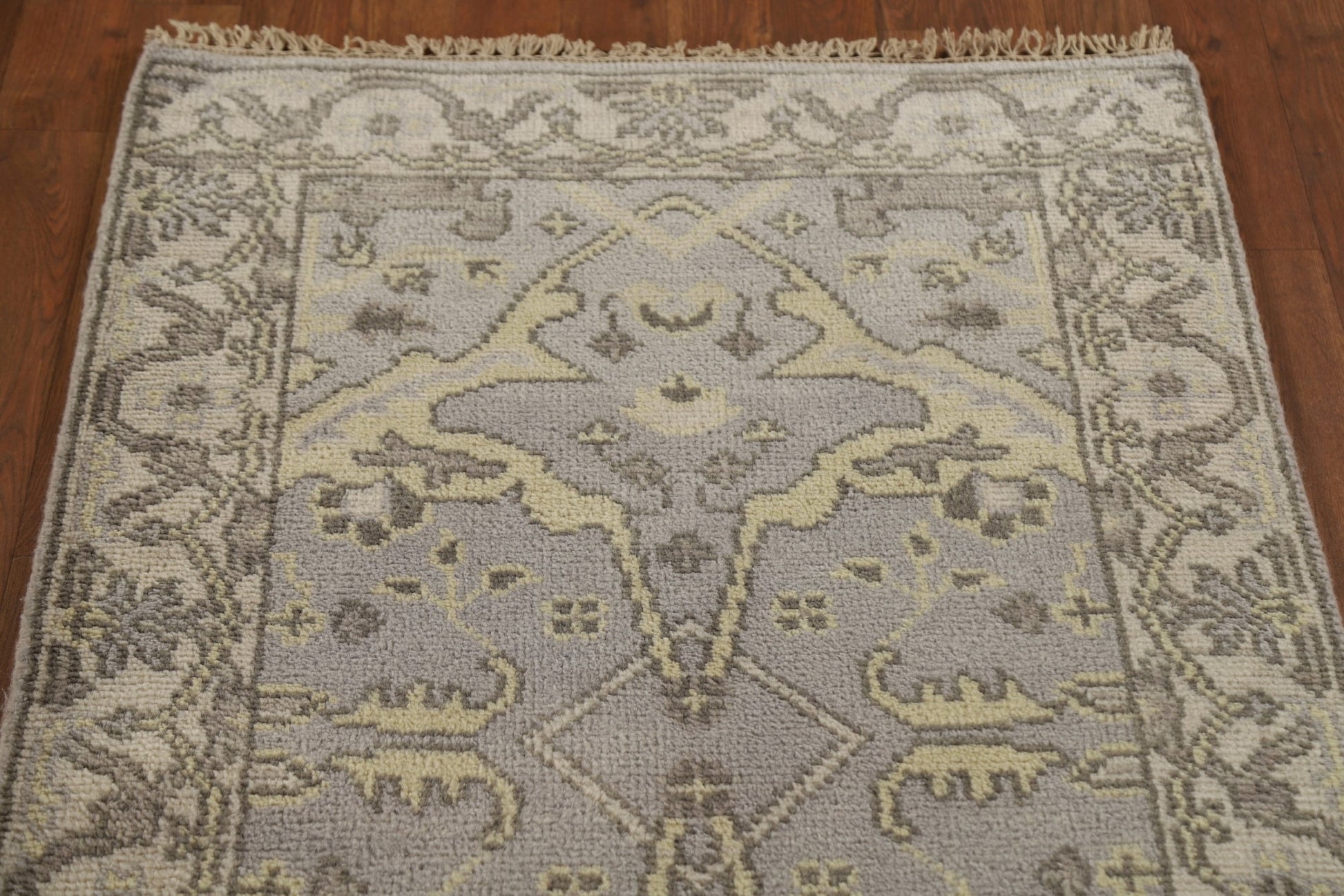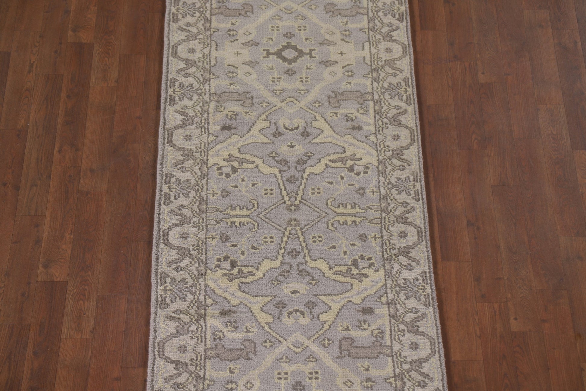 A Beautiful Genuine India Oushak rug is Hand Knotted by skillful weavers in India with 100% Wool Material. This rug is in condition. dimensions are 19' 6'' X 2' 7'' in foot and 594 X 79 in centimeter. the primary color is Greys & Charcoal.