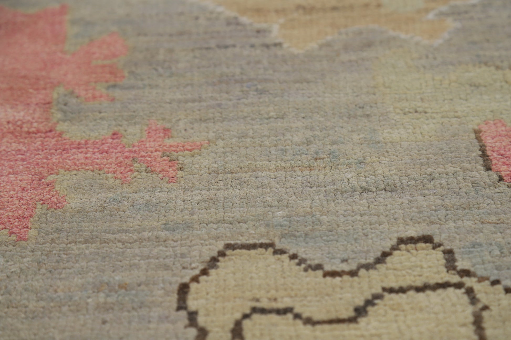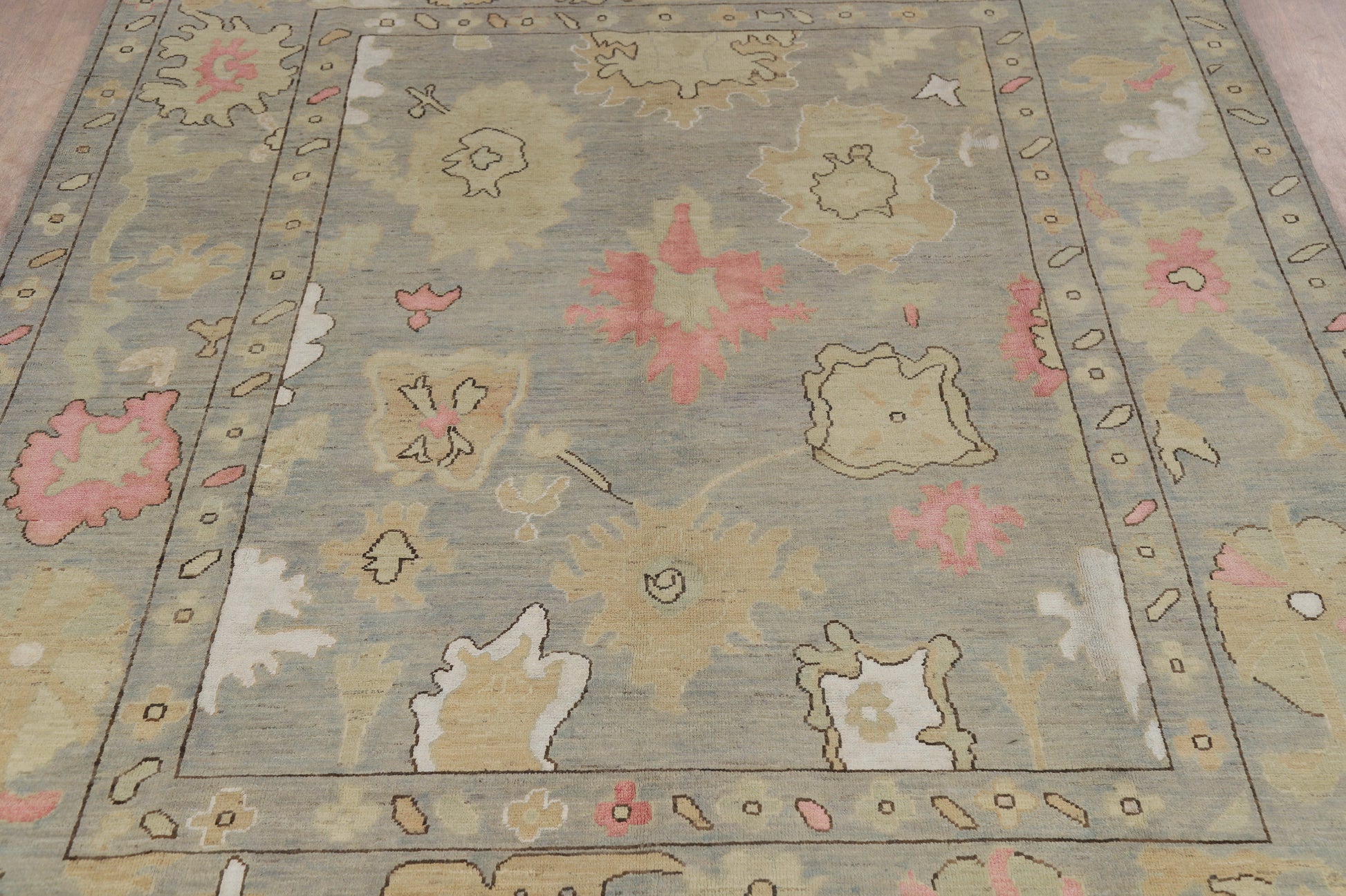 A Beautiful Genuine Turkey Oushak rug is Hand Knotted by skillful weavers in Turkey with 100% Wool Material. This rug is in New, First Quality condition. dimensions are 10' 0'' X 7' 11'' in foot and 305 X 241 in centimeter. the primary color is Greys & Charcoal.