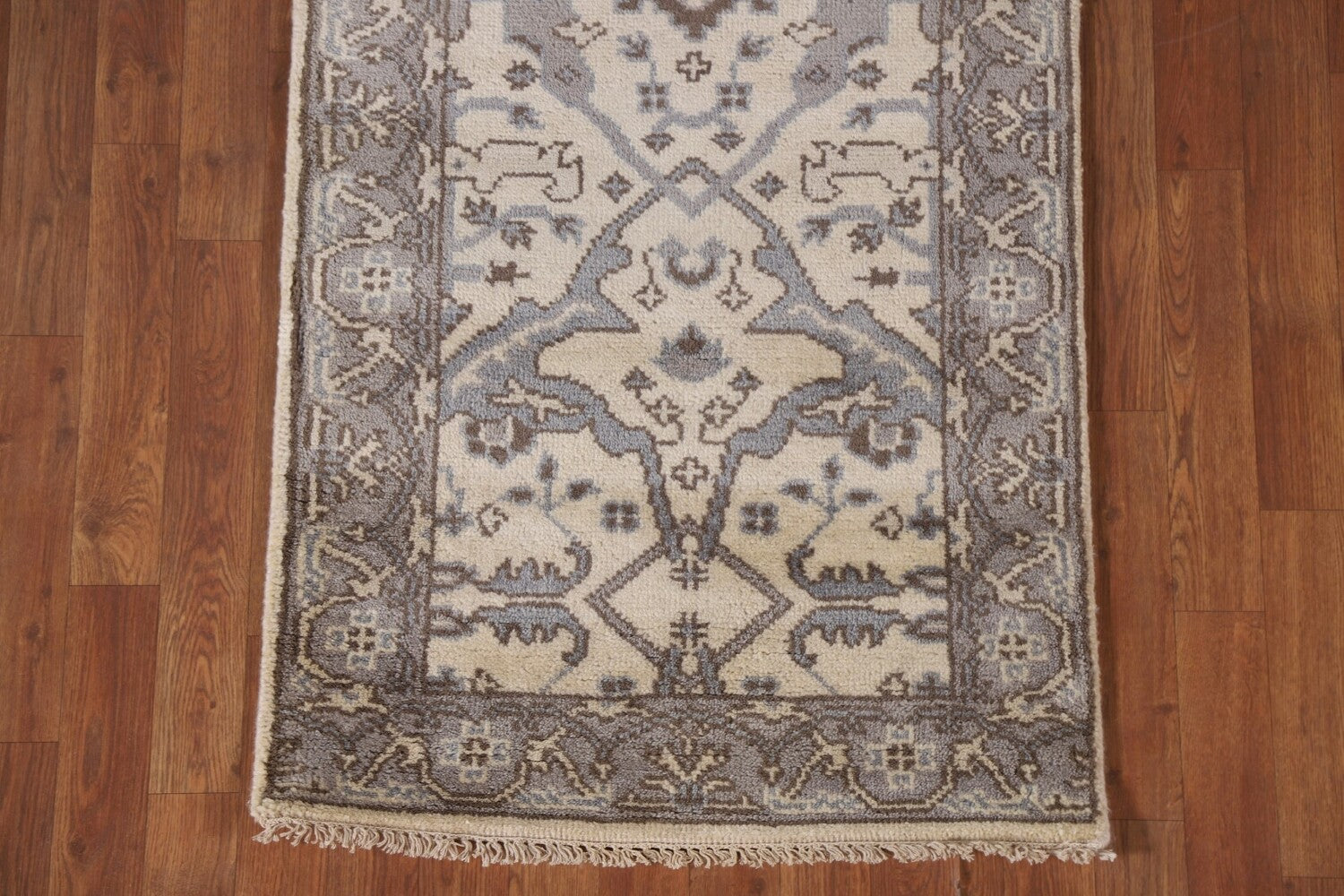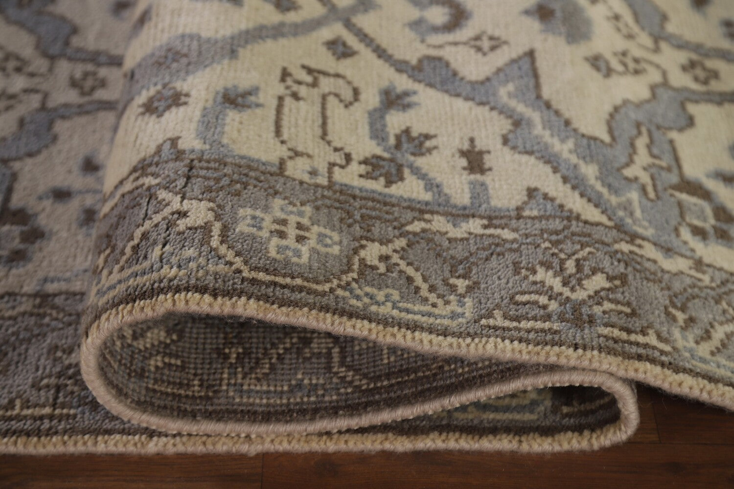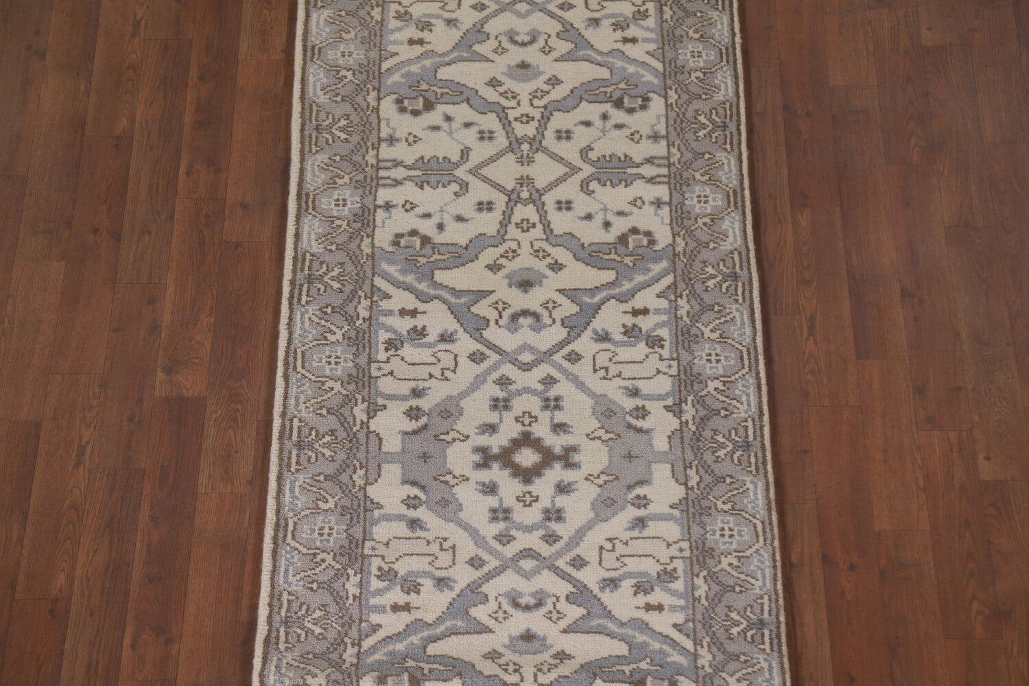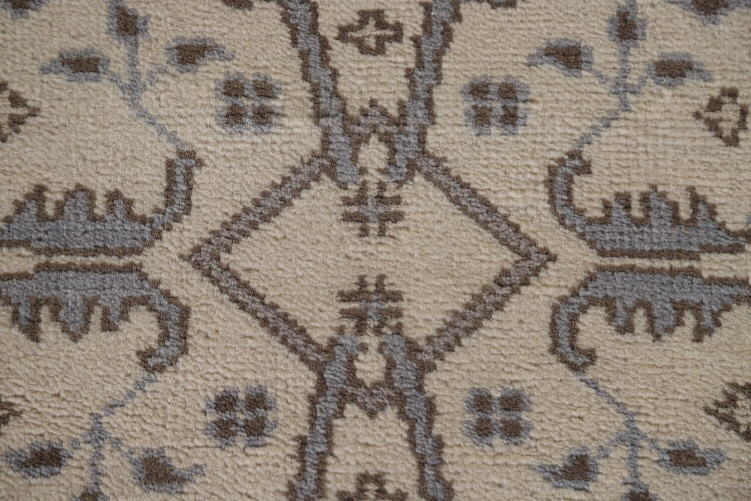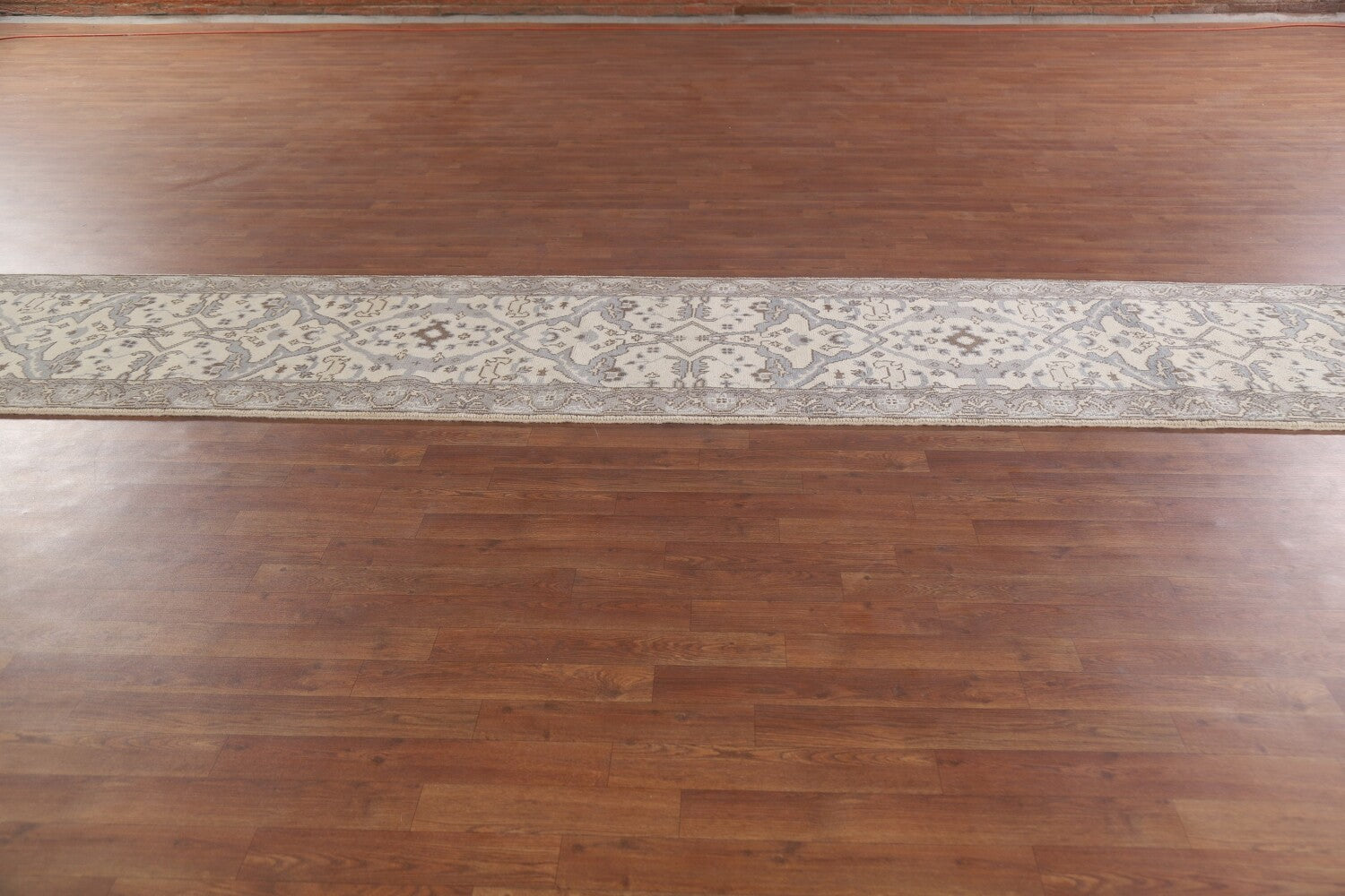 A Beautiful Genuine India Oushak rug is Hand Knotted by skillful weavers in India with 100% Wool Material. This rug is in New, First Quality condition. dimensions are 19' 6'' X 2' 7'' in foot and 594 X 79 in centimeter. the primary color is Beige & Ivories.
