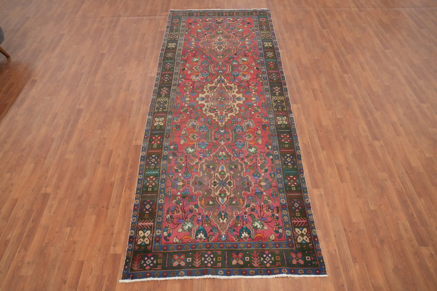 A Beautiful Genuine Persia ( Persia ) Heriz rug is Hand Knotted by skillful weavers in Persia ( Persia ) with 100% Wool Material. This rug is in Very Good condition. dimensions are 12' 1'' X 4' 8'' in foot and 368 X 142 in centimeter. the primary color is Pink.