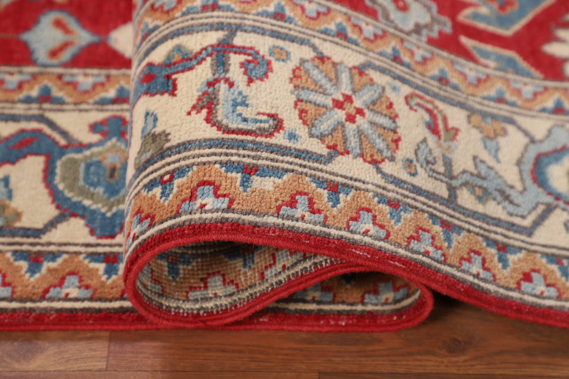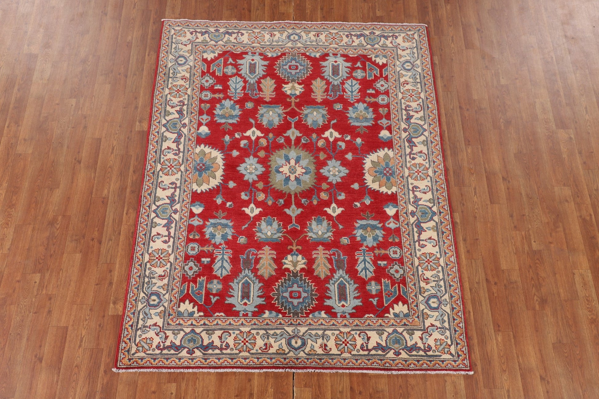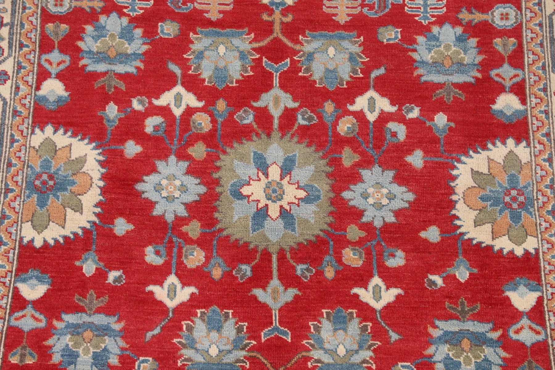 A Beautiful Genuine Pakistan Kazak rug is Hand Knotted by skillful weavers in Pakistan with 100% Wool Material. This rug is in New, First Quality condition. dimensions are 6' 7'' X 5' 1'' in foot and 201 X 155 in centimeter. the primary color is Red.