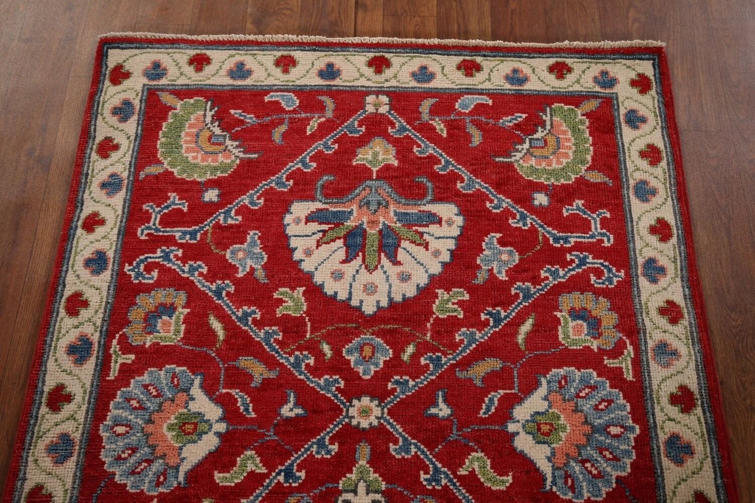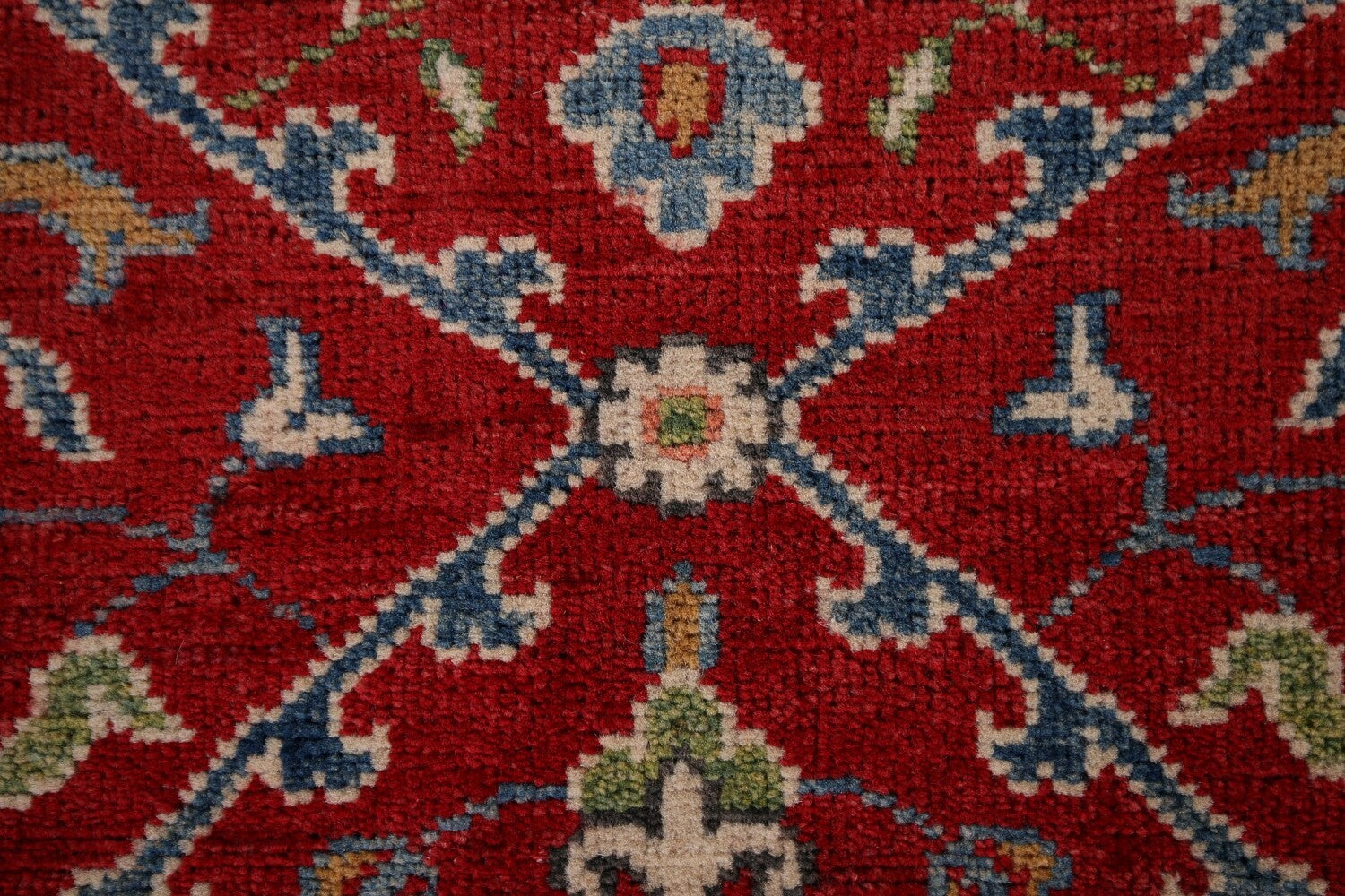 A Beautiful Genuine Pakistan Kazak rug is Hand Knotted by skillful weavers in Pakistan with 100% Wool Material. This rug is in New, First Quality condition. dimensions are 9' 8'' X 2' 9'' in foot and 295 X 84 in centimeter. the primary color is Red.