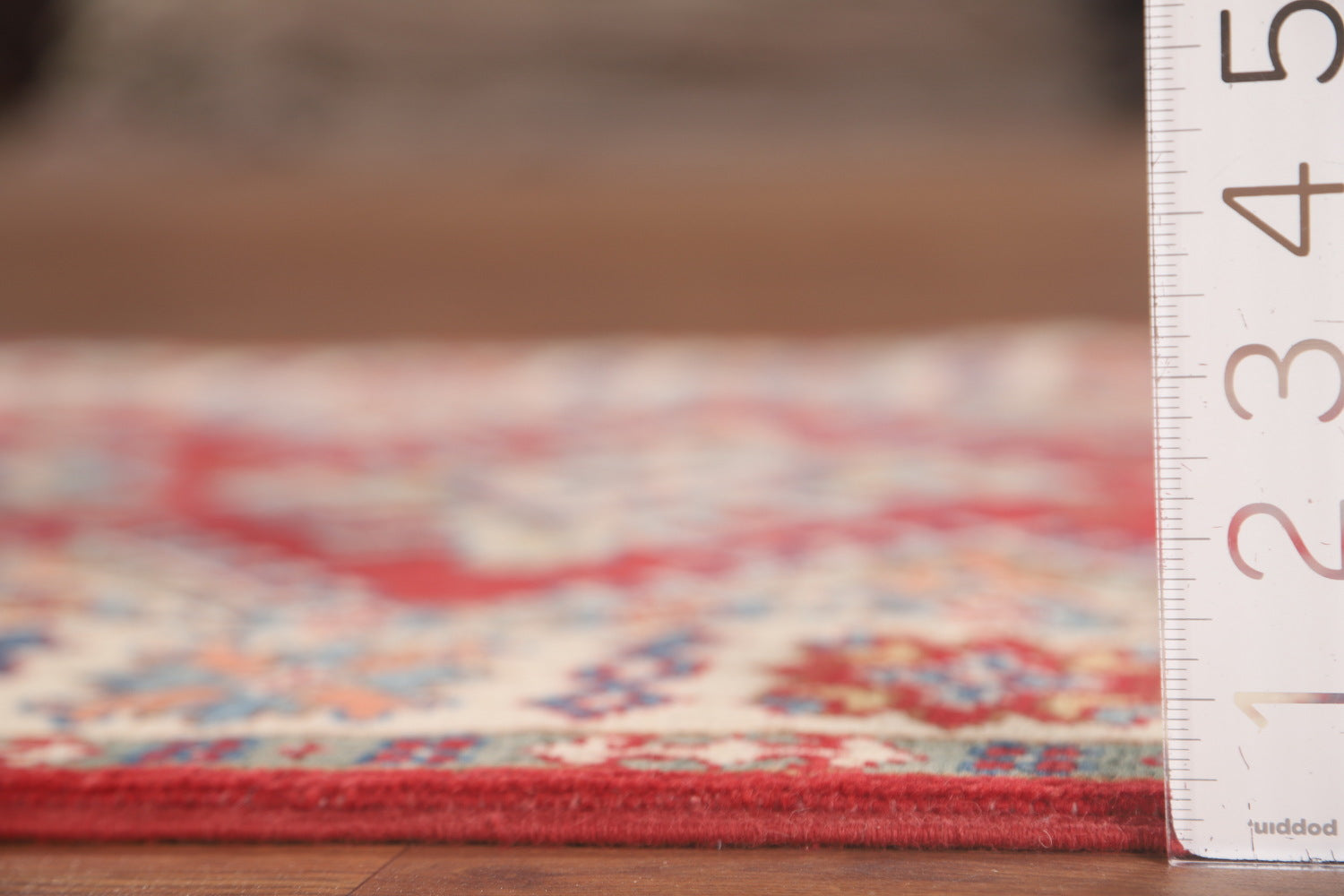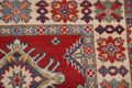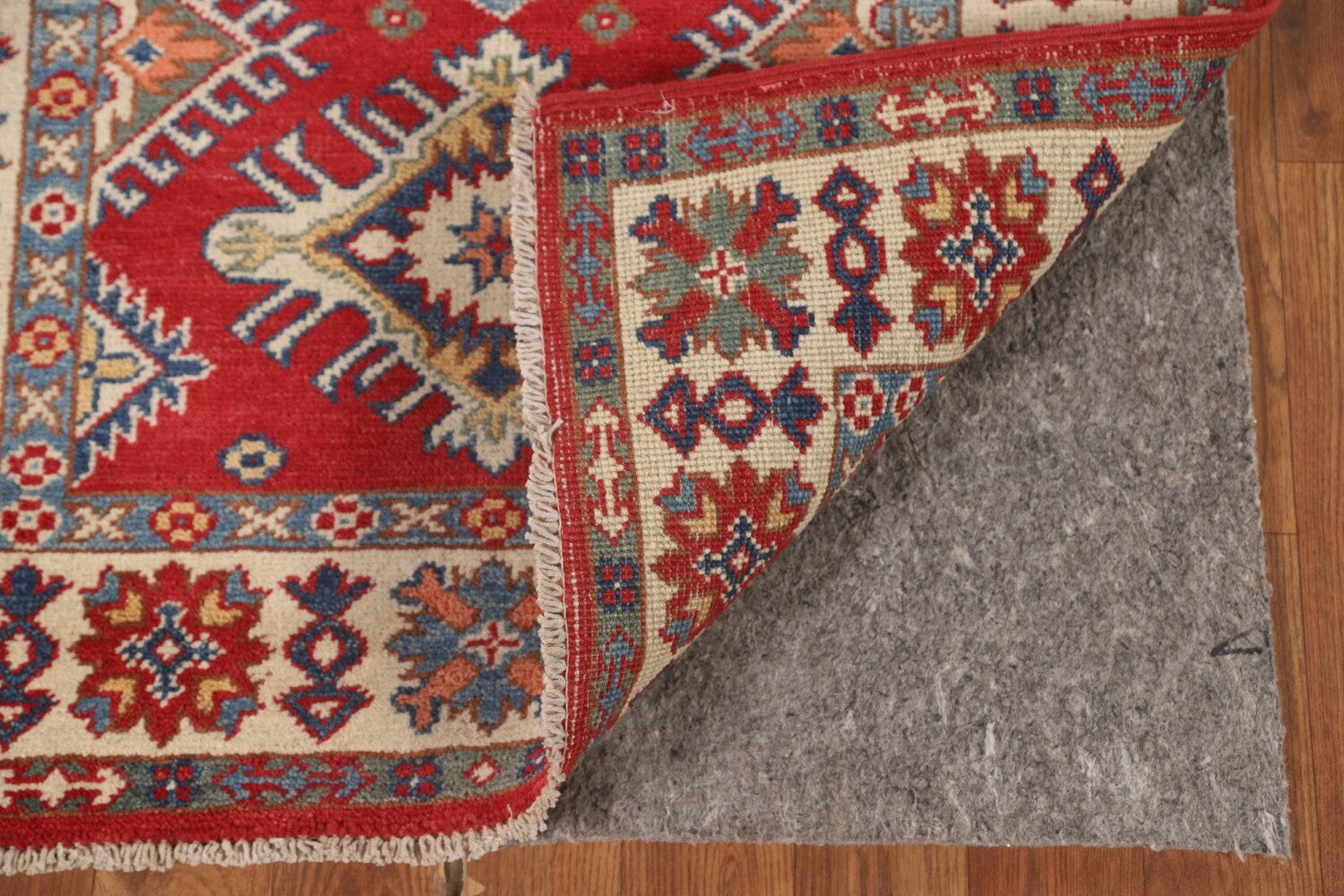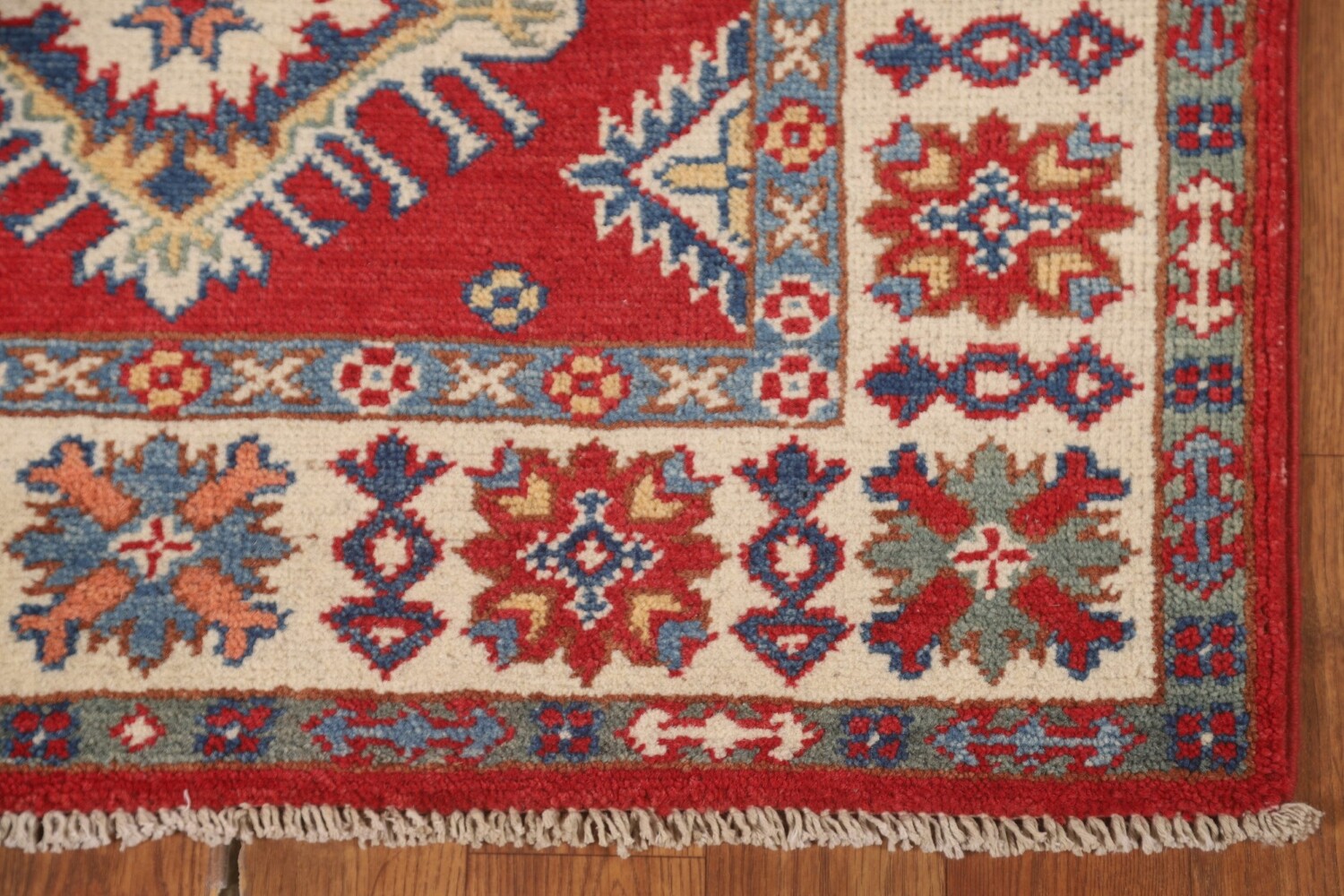 A Beautiful Genuine Pakistan Kazak rug is Hand Knotted by skillful weavers in Pakistan with 100% Wool Material. This rug is in New, First Quality condition. dimensions are 7' 10'' X 2' 8'' in foot and 239 X 81 in centimeter. the primary color is Red.