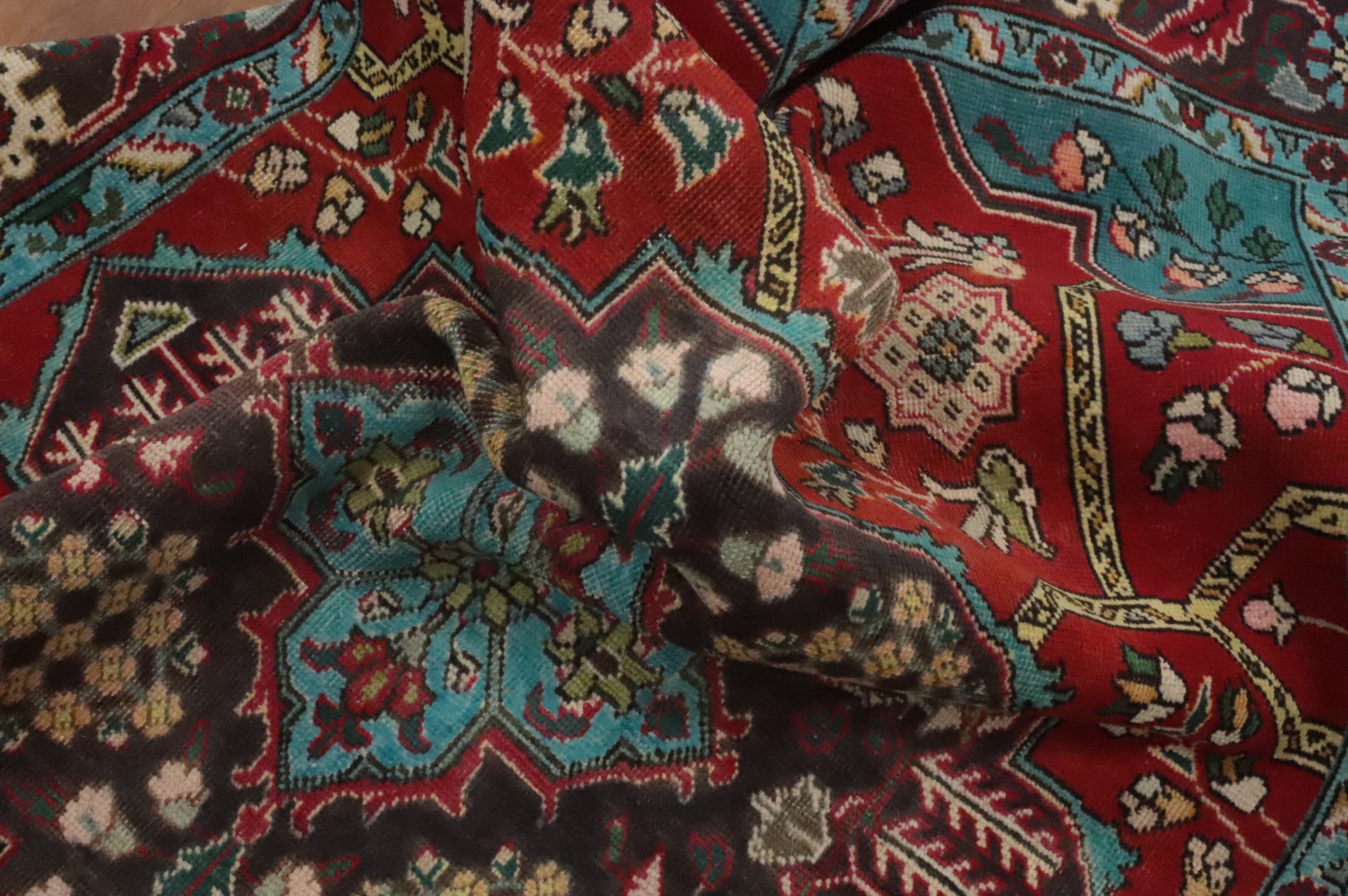 A Beautiful Genuine Persia ( Persia ) Tabriz rug is Hand Knotted by skillful weavers in Persia ( Persia ) with 100% Wool Material. This rug is in Very Good (Evenly Low Pile) condition. dimensions are 5' 11'' X 4' 6'' in foot and 180 X 137 in centimeter. the primary color is Red.