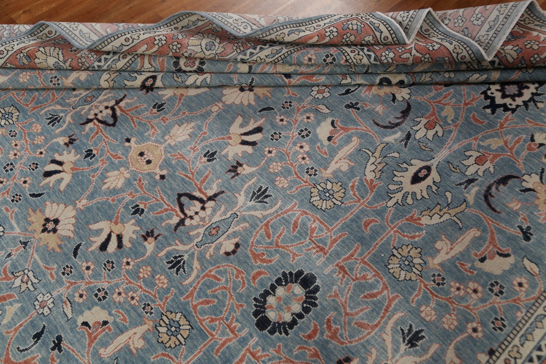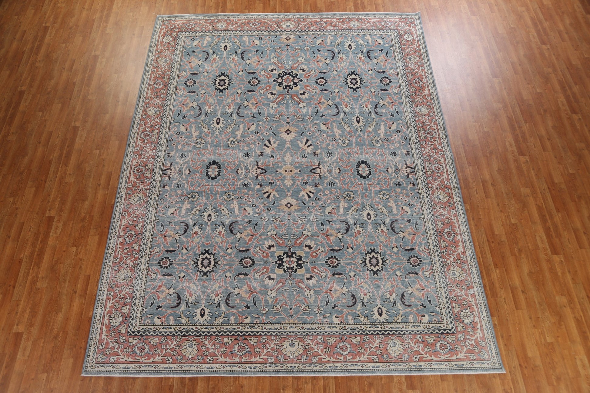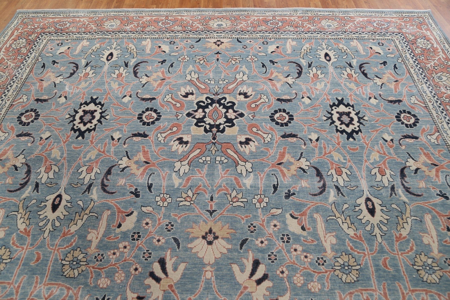 A Beautiful Genuine Turkey Sultanabad (Ziegler) rug is Hand Knotted by skillful weavers in Turkey with 100% Wool Material. This rug is in New, First Quality condition. dimensions are 13' 0'' X 9' 9'' in foot and 396 X 297 in centimeter. the primary color is Navy Blue & Blues.