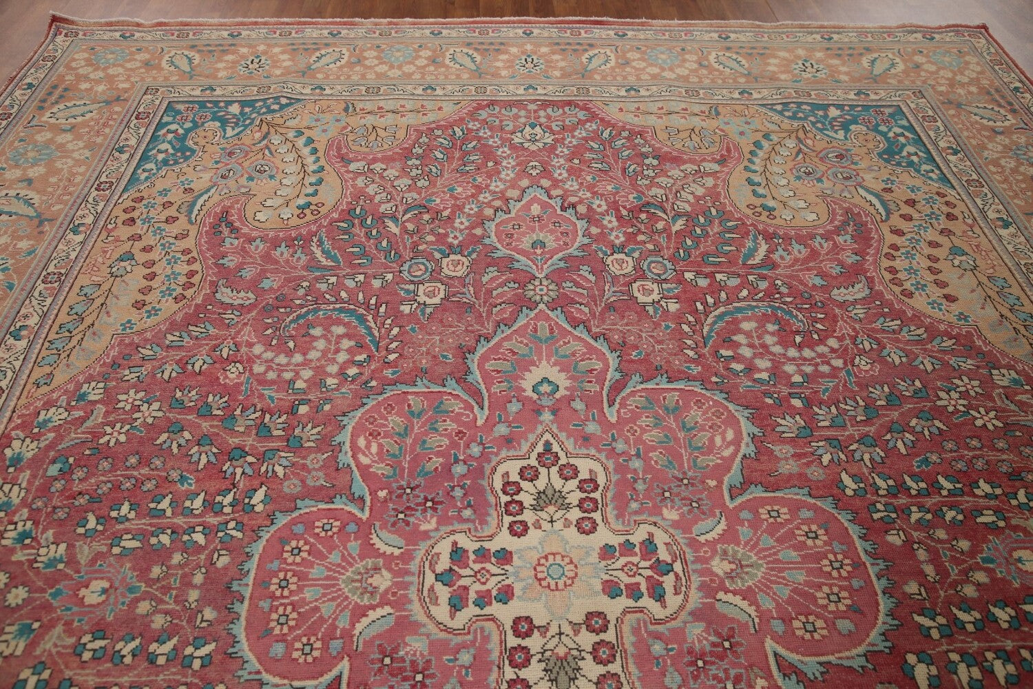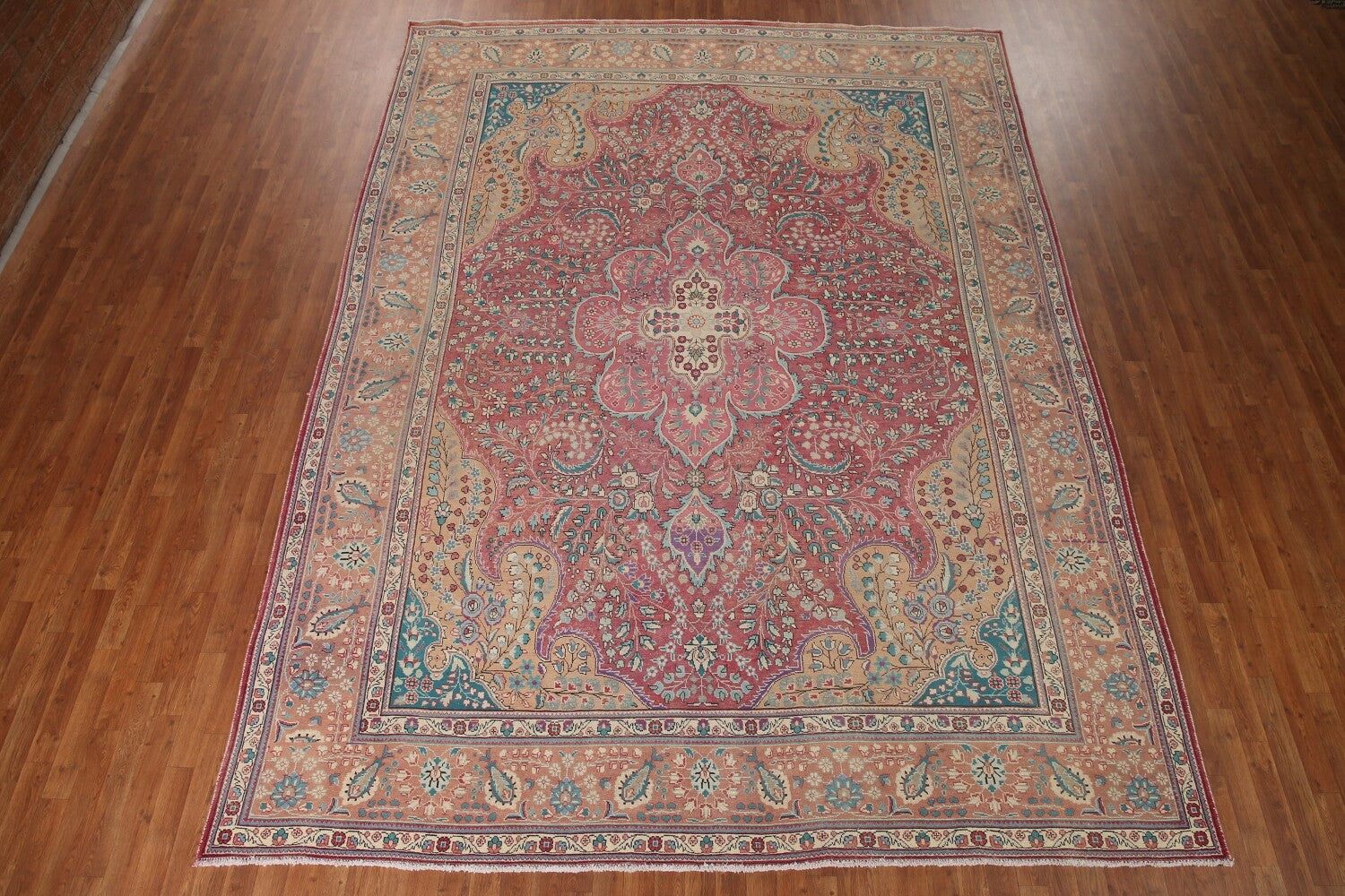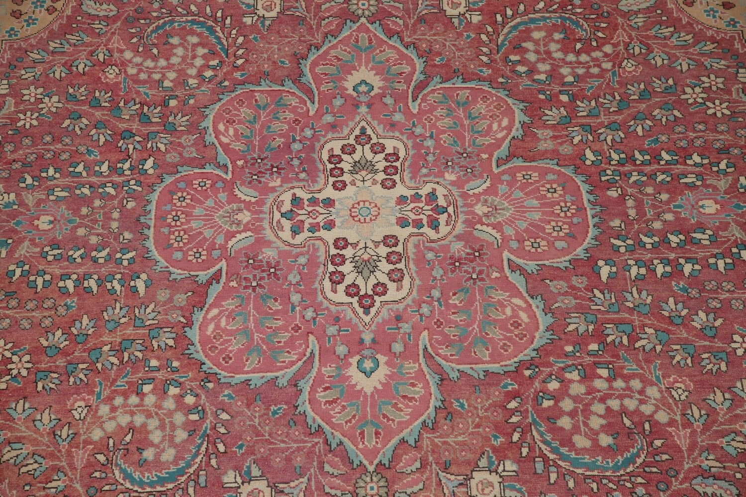 A Beautiful Genuine Persia ( Persia ) Tabriz rug is Hand Knotted by skillful weavers in Persia ( Persia ) with 100% Wool Material. This rug is in Very Good (Evenly Low Pile) condition. dimensions are 12' 11'' X 9' 7'' in foot and 394 X 292 in centimeter. the primary color is Pink.