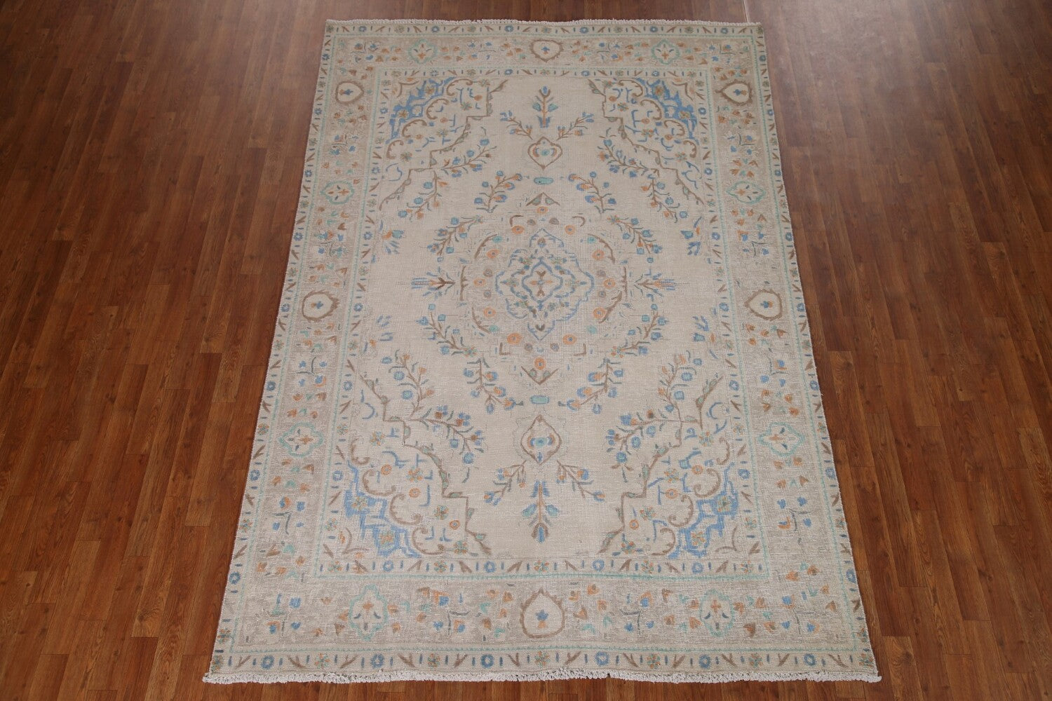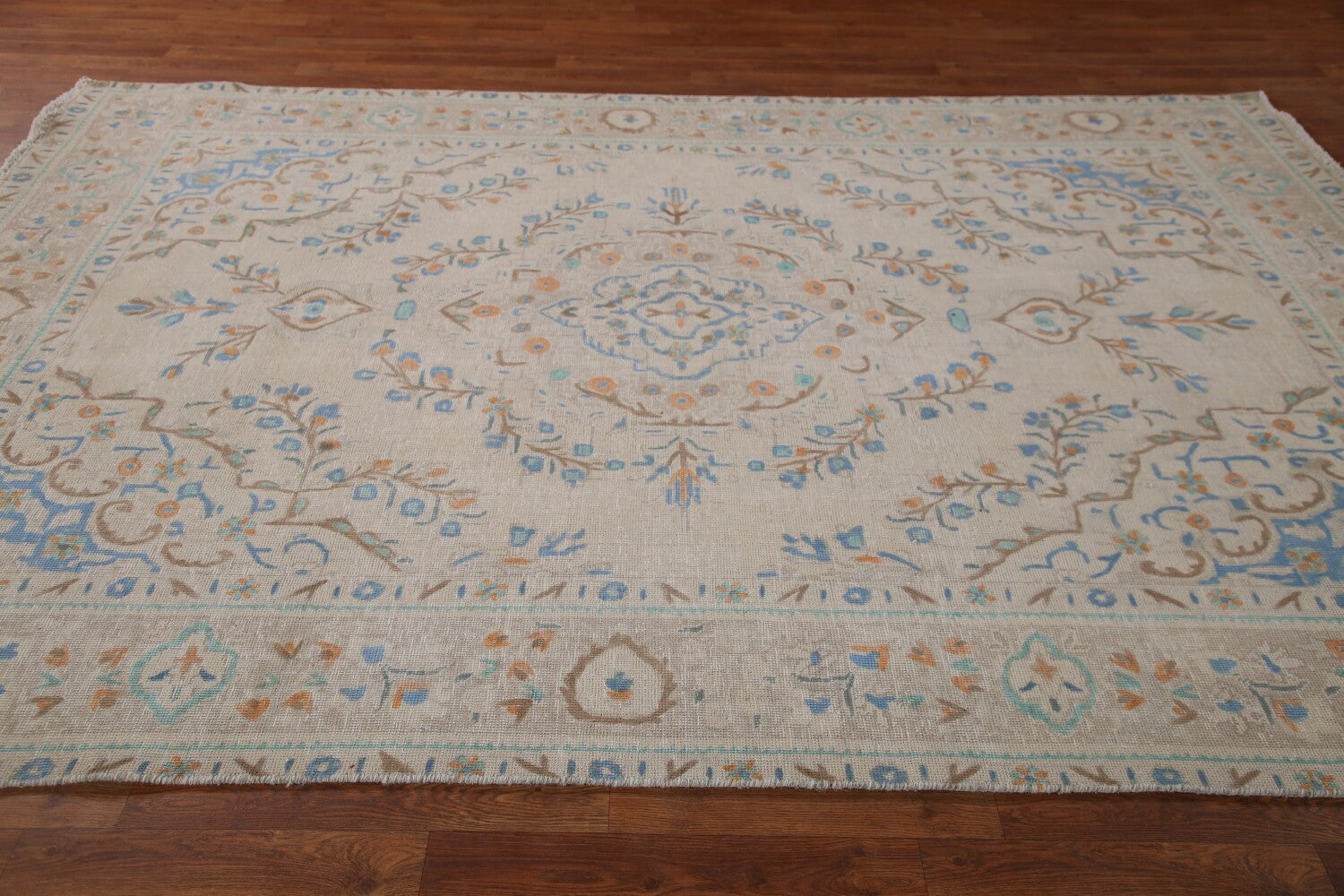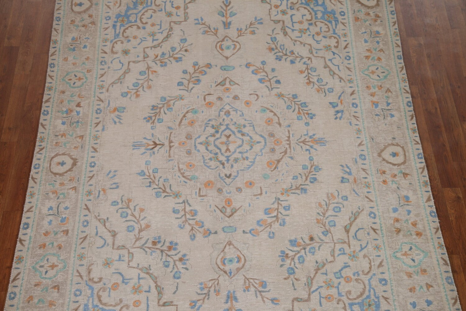 A Beautiful Genuine Persia ( Persia ) Tabriz rug is Hand Knotted by skillful weavers in Persia ( Persia ) with 100% Wool Material. This rug is in Very Good (Evenly Low Pile) condition. dimensions are 9' 5'' X 6' 4'' in foot and 287 X 193 in centimeter. the primary color is Beige & Ivories.