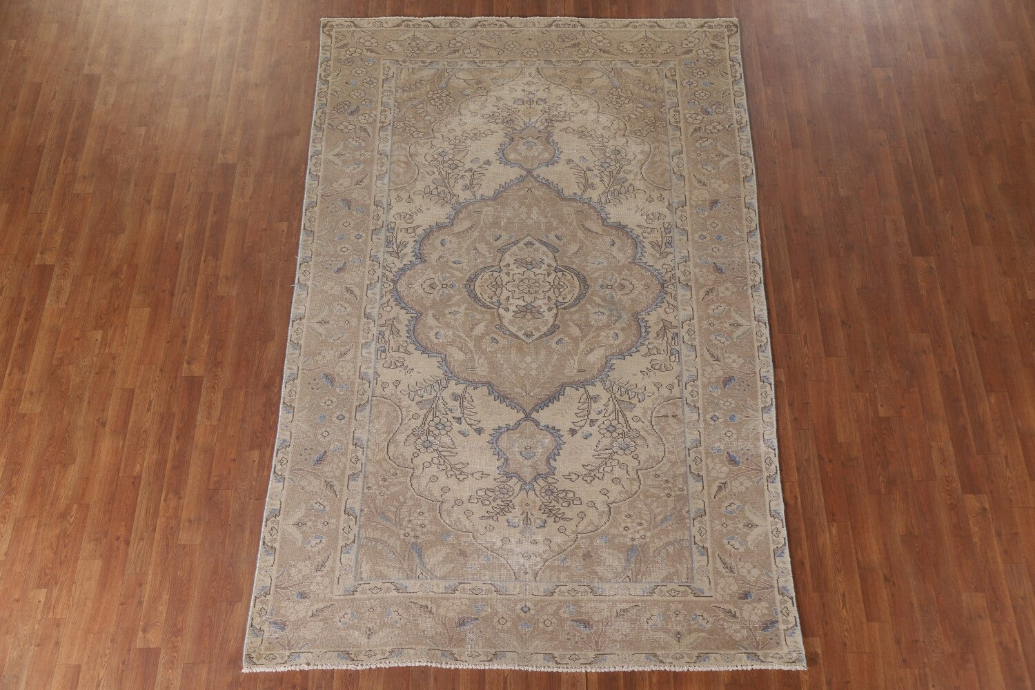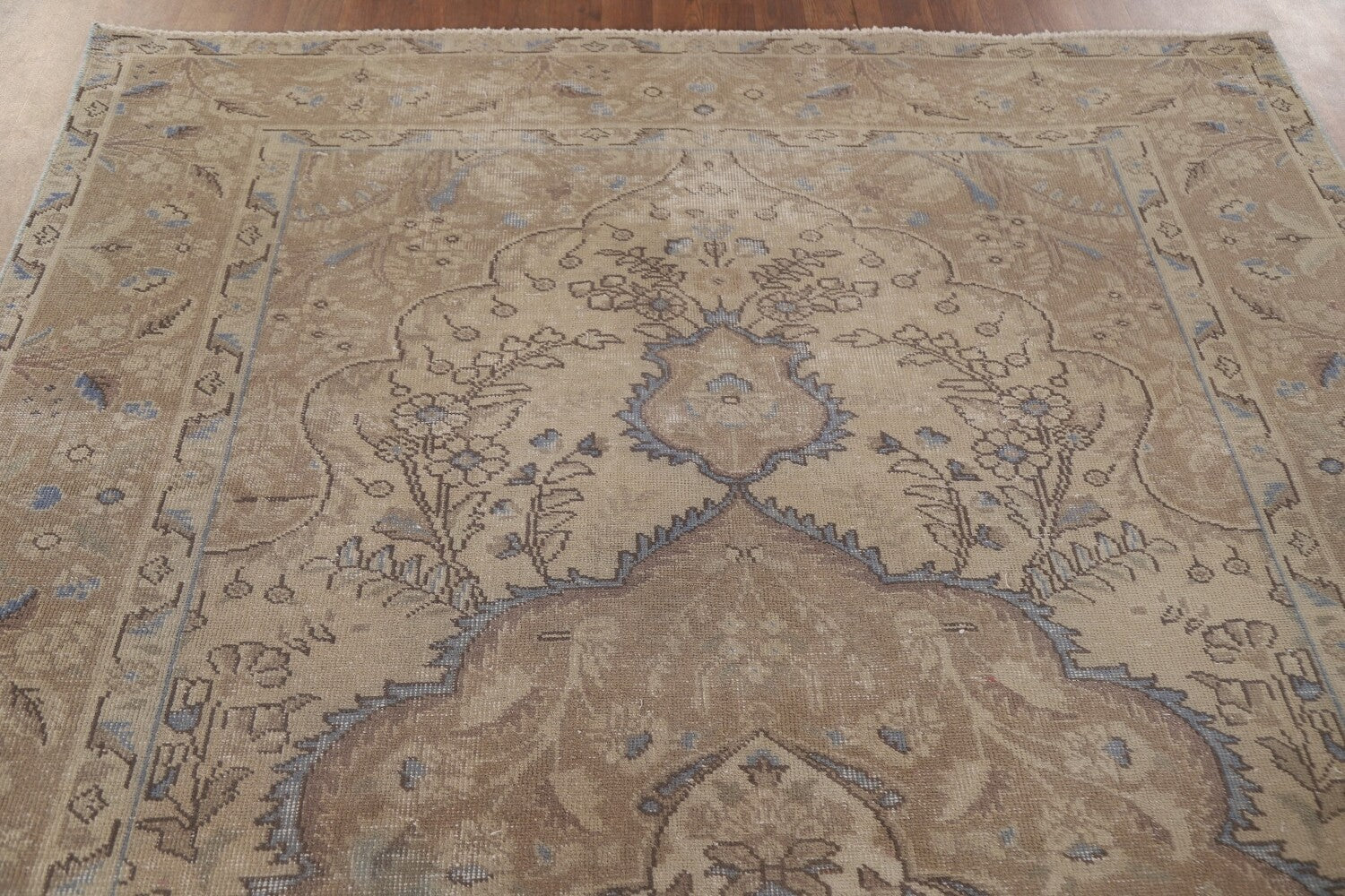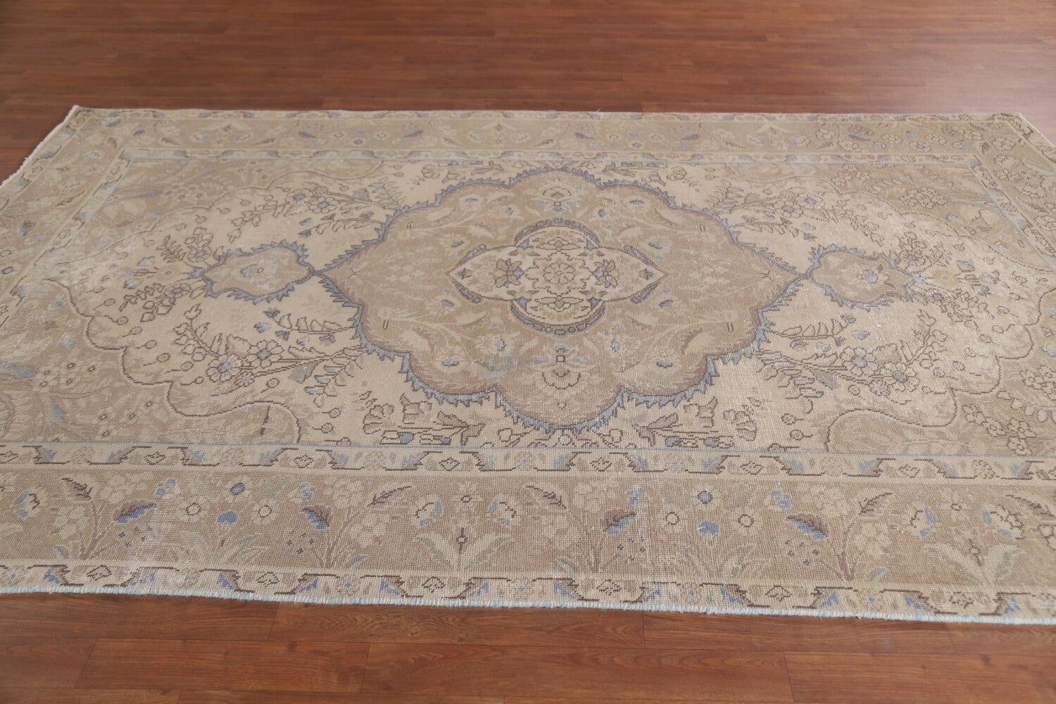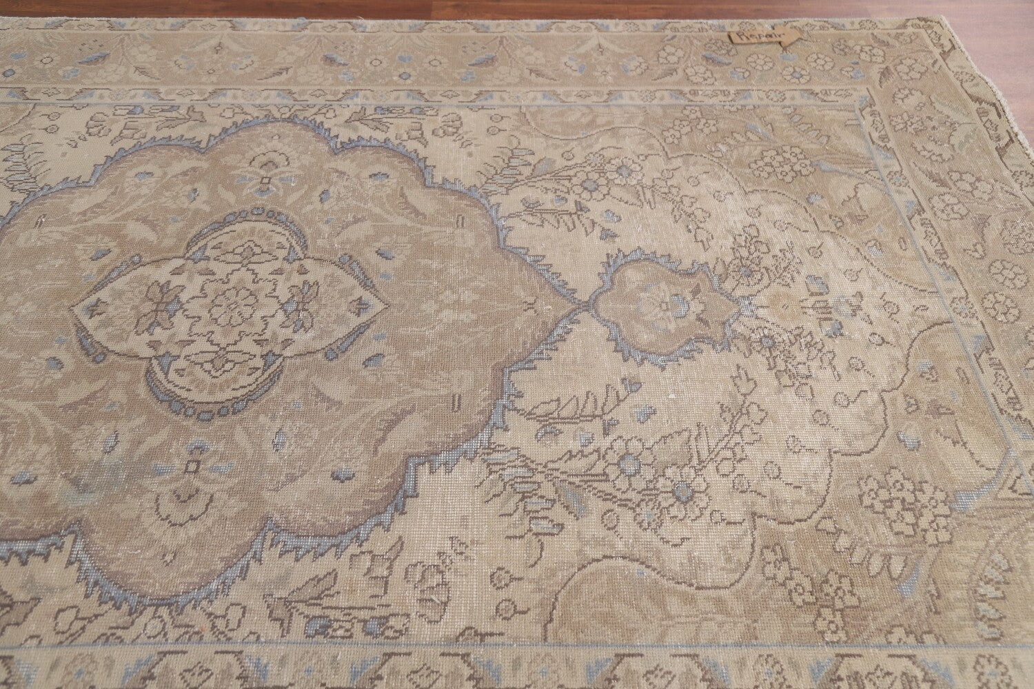 A Beautiful Genuine Persia ( Persia ) Tabriz rug is Hand Knotted by skillful weavers in Persia ( Persia ) with 100% Wool Material. This rug is in Very Good (Evenly Low Pile-Repair) condition. dimensions are 9' 5'' X 6' 1'' in foot and 287 X 185 in centimeter. the primary color is Beige & Ivories.