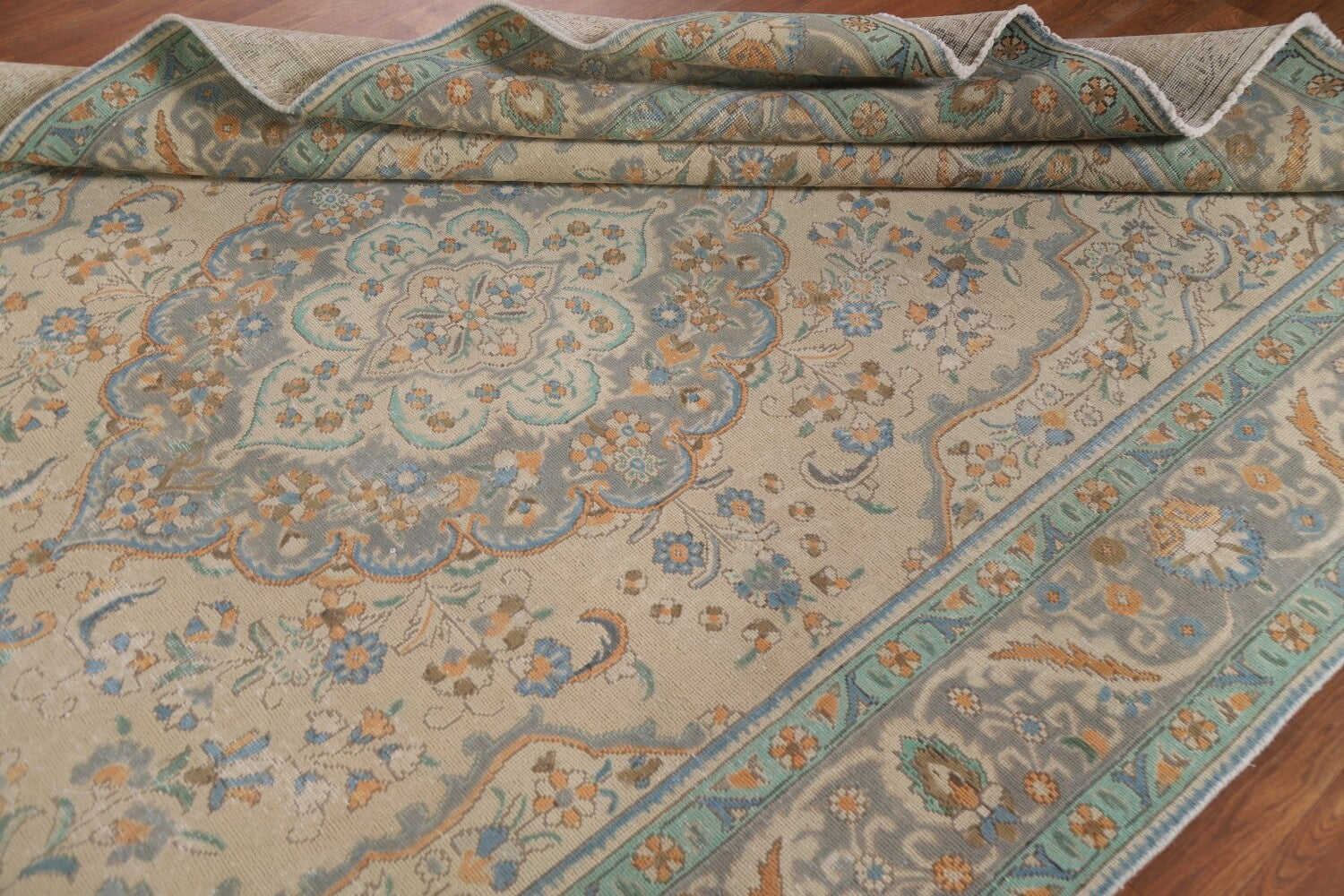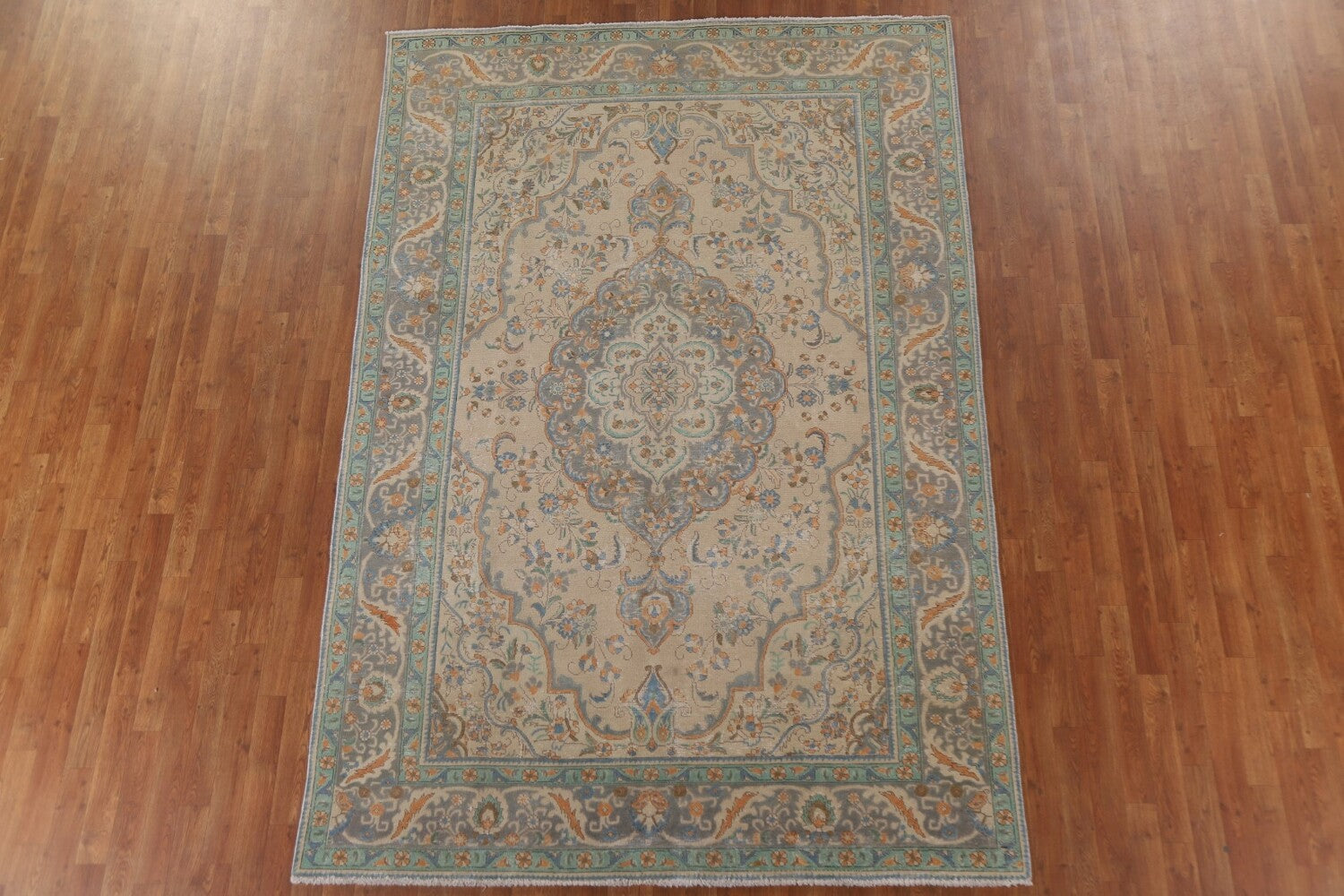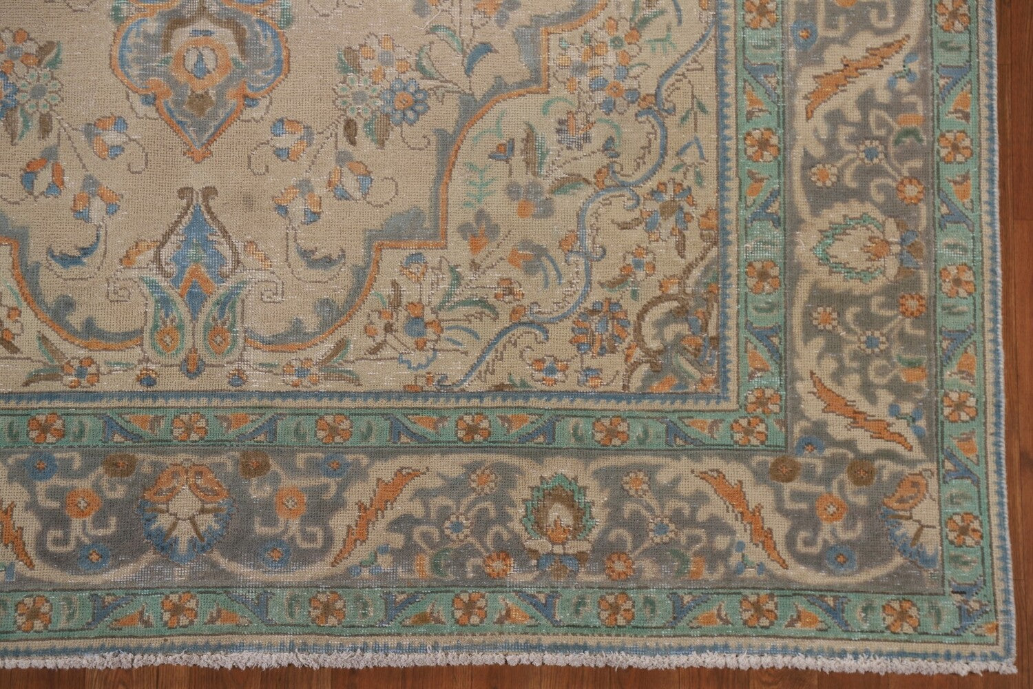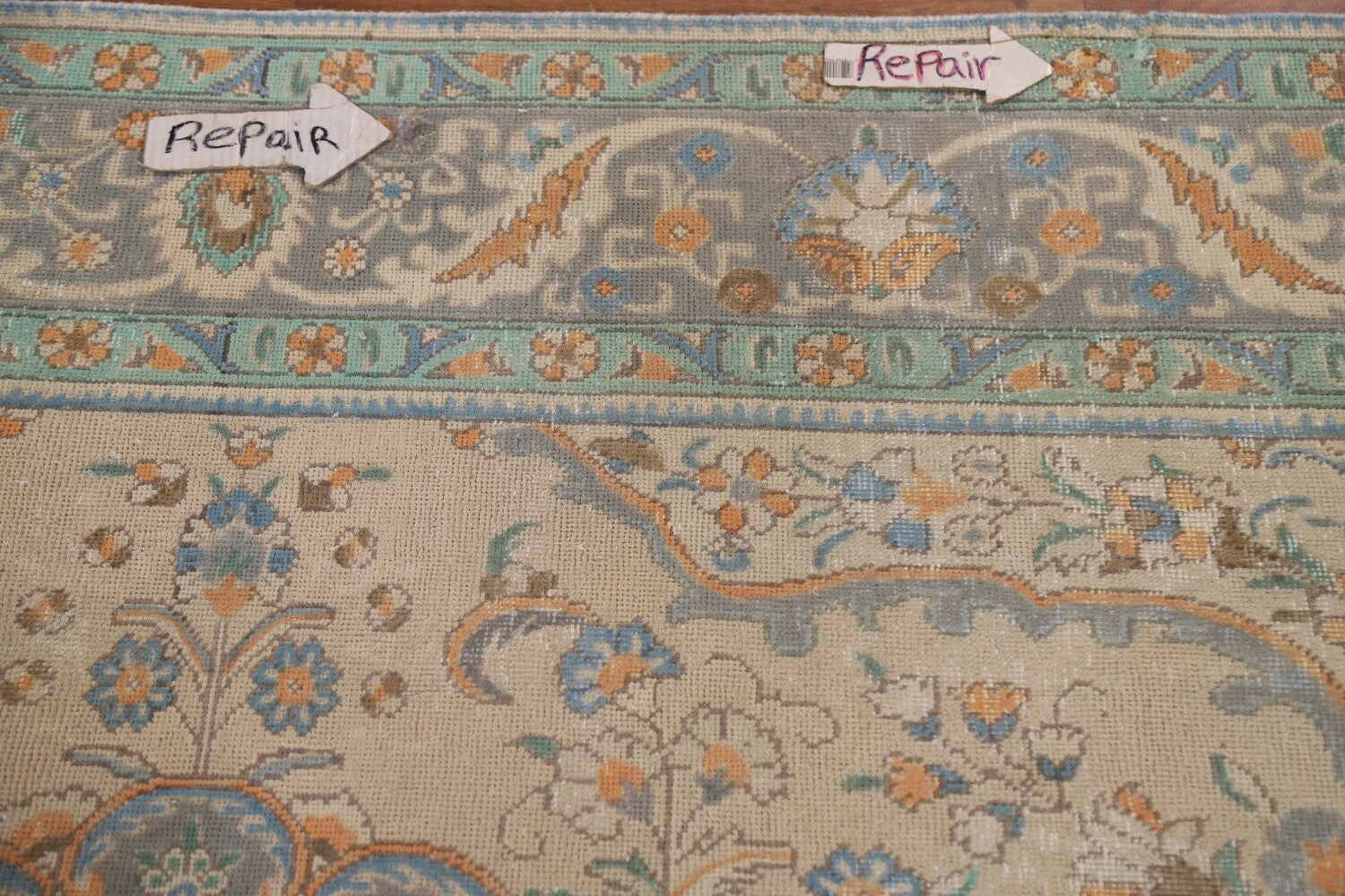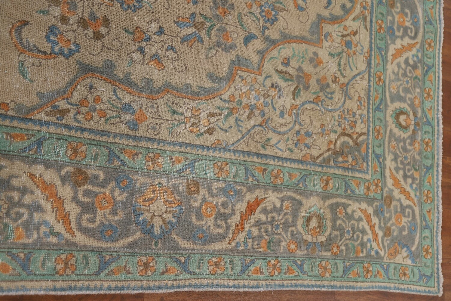 A Beautiful Genuine Persia ( Persia ) Tabriz rug is Hand Knotted by skillful weavers in Persia ( Persia ) with 100% Wool Material. This rug is in Very Good (Evenly Low Pile-Repair) condition. dimensions are 9' 8'' X 6' 7'' in foot and 295 X 201 in centimeter. the primary color is Beige & Ivories.