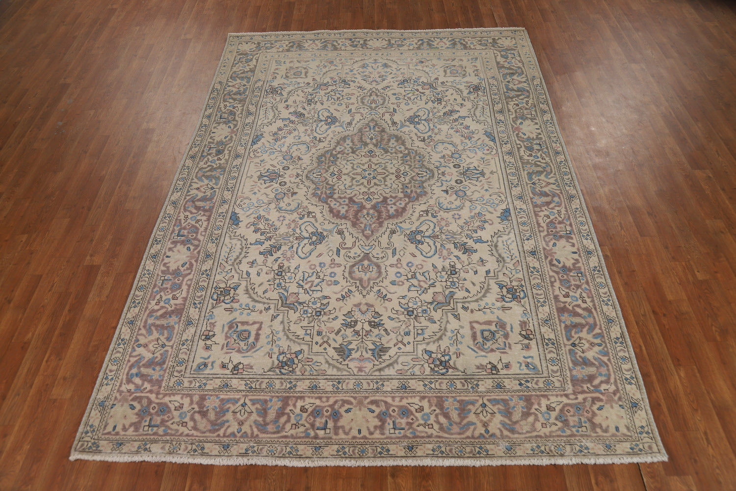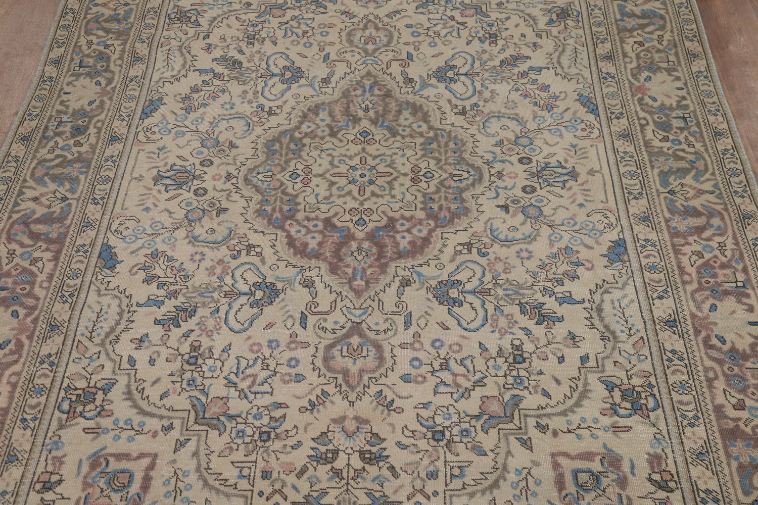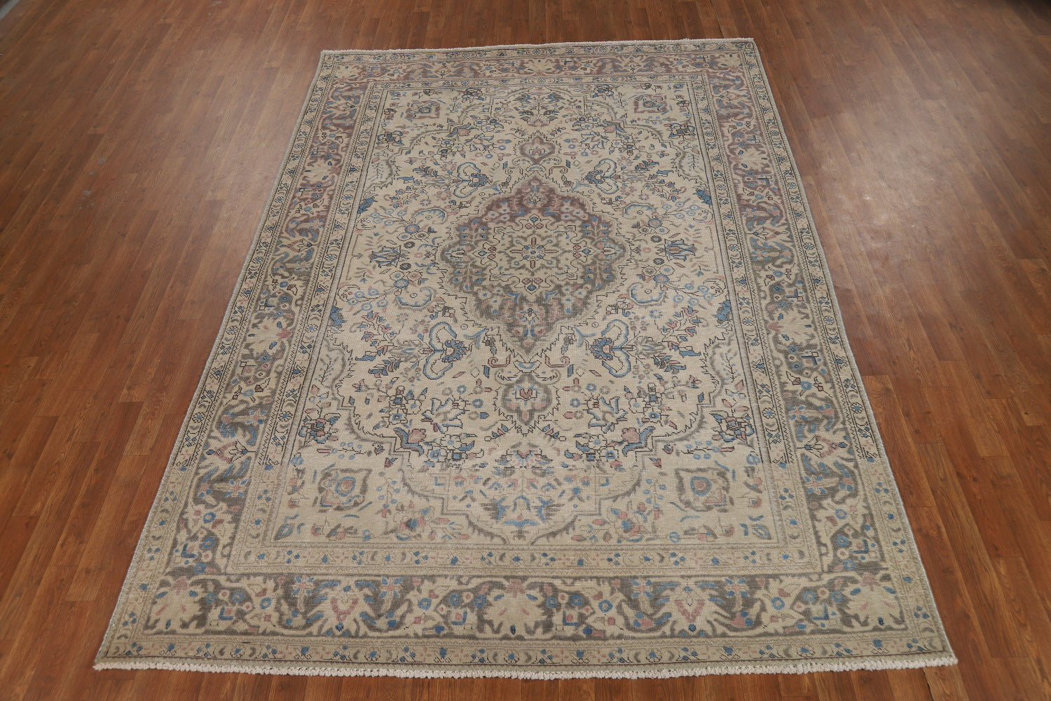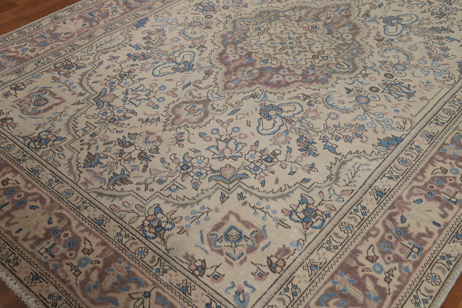 A Beautiful Genuine Persia ( Persia ) Tabriz rug is Hand Knotted by skillful weavers in Persia ( Persia ) with 100% Wool Material. This rug is in Very Good (Evenly Low Pile) condition. dimensions are 9' 7'' X 6' 8'' in foot and 292 X 203 in centimeter. the primary color is Beige & Ivories.