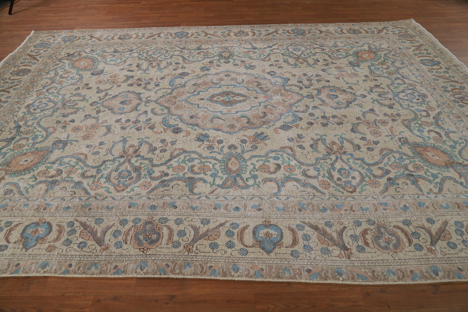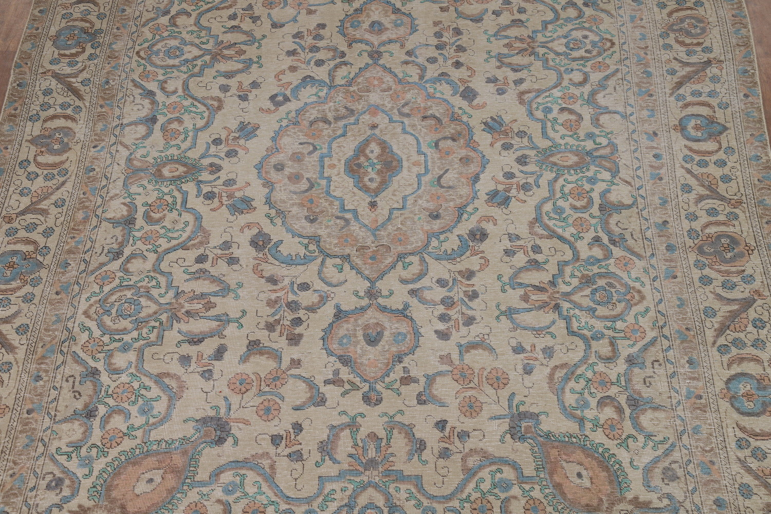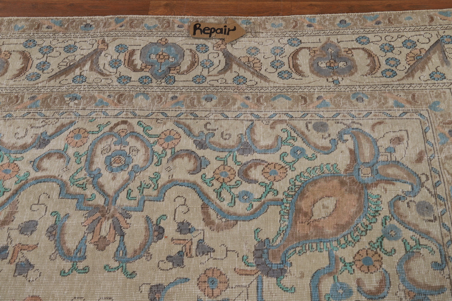 A Beautiful Genuine Persia ( Persia ) Tabriz rug is Hand Knotted by skillful weavers in Persia ( Persia ) with 100% Wool Material. This rug is in Very Good ( Evenly Low Pile-Repair) condition. dimensions are 11' 8'' X 8' 2'' in foot and 356 X 249 in centimeter. the primary color is Beige & Ivories.