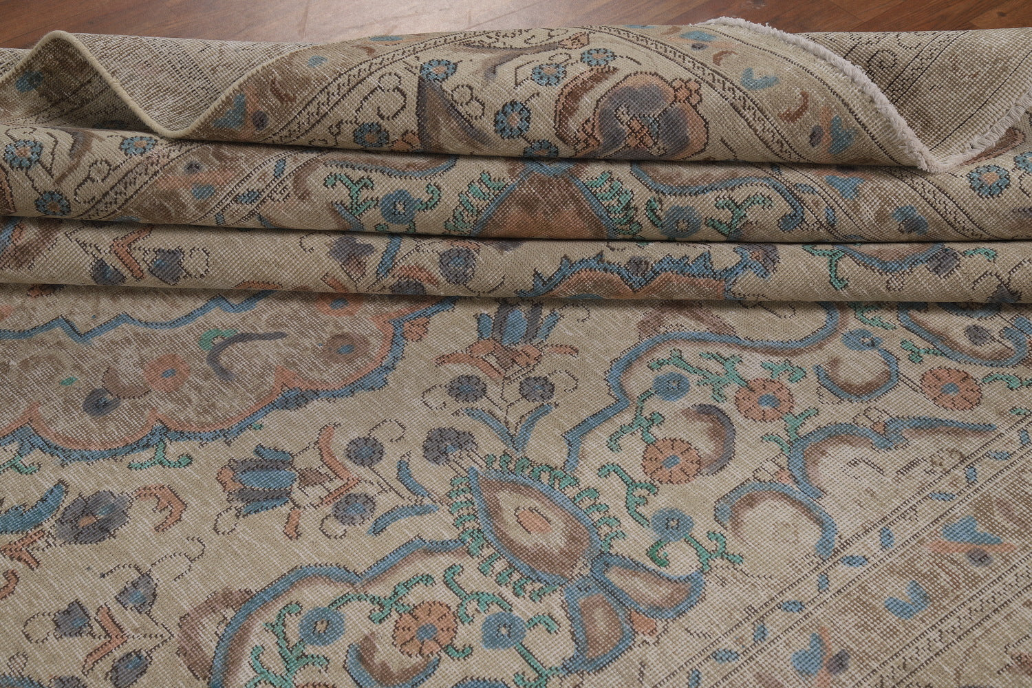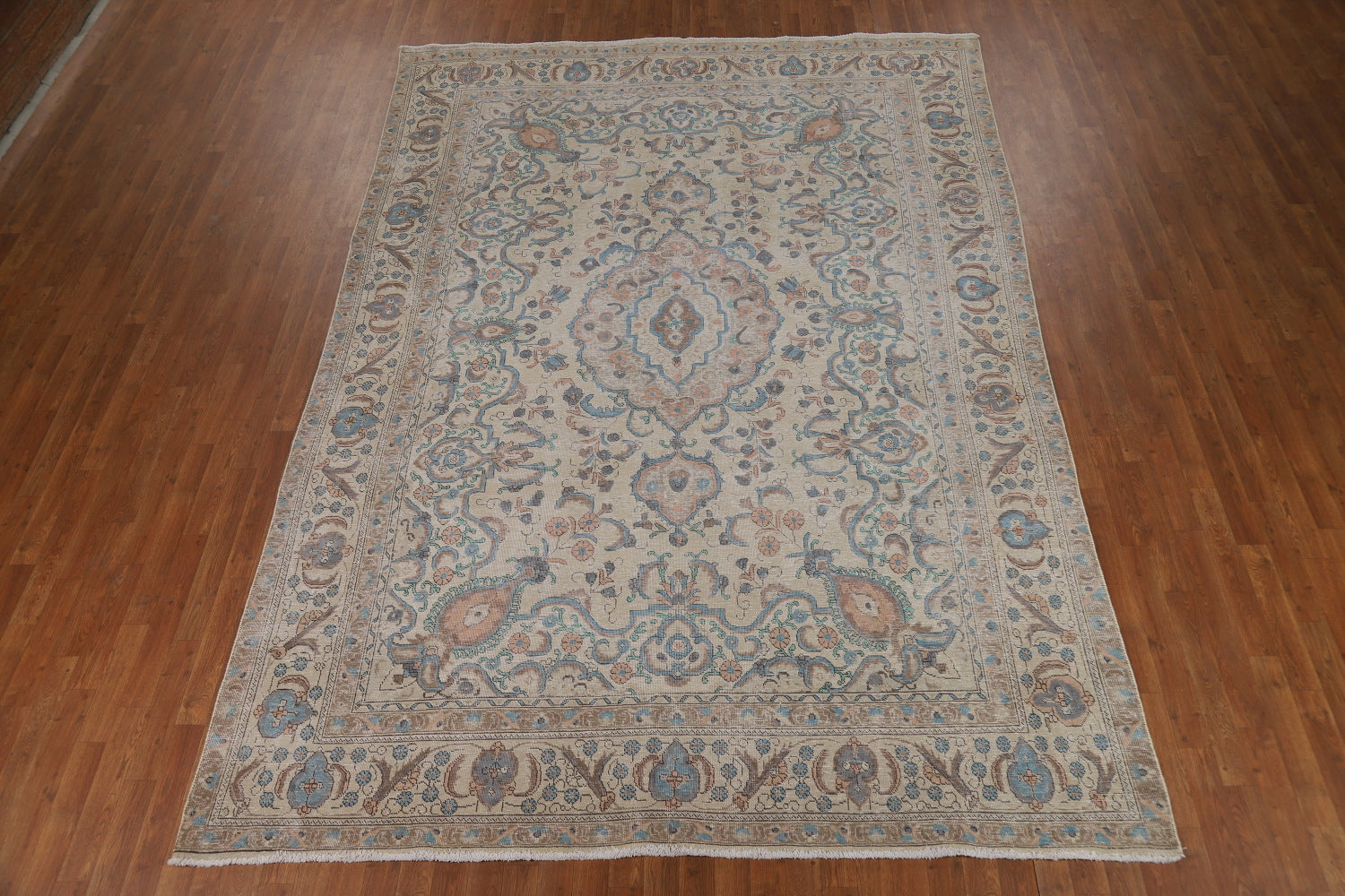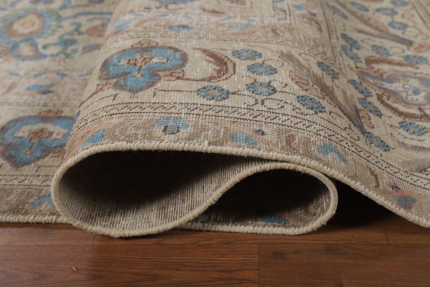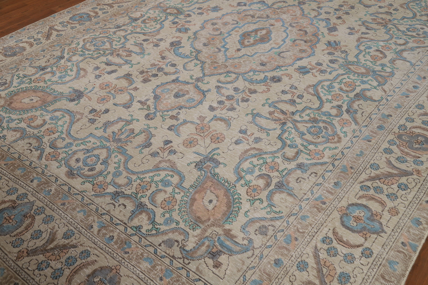A Beautiful Genuine Persia ( Persia ) Tabriz rug is Hand Knotted by skillful weavers in Persia ( Persia ) with 100% Wool Material. This rug is in Very Good ( Evenly Low Pile-Repair) condition. dimensions are 11' 8'' X 8' 2'' in foot and 356 X 249 in centimeter. the primary color is Beige & Ivories.
