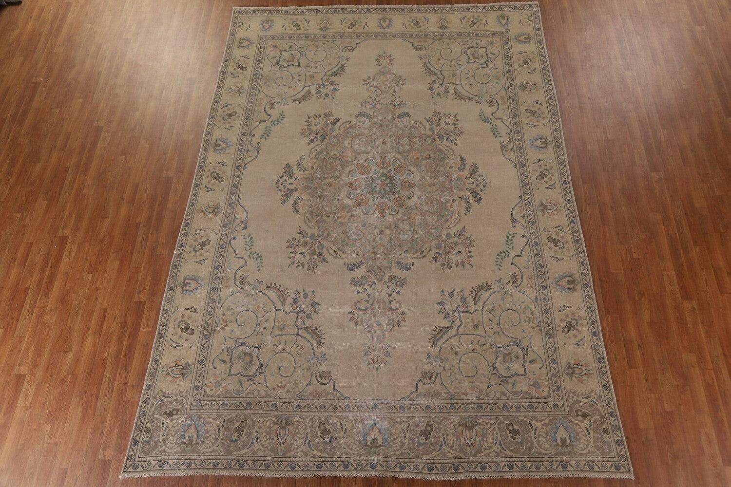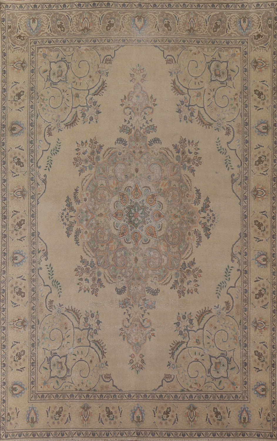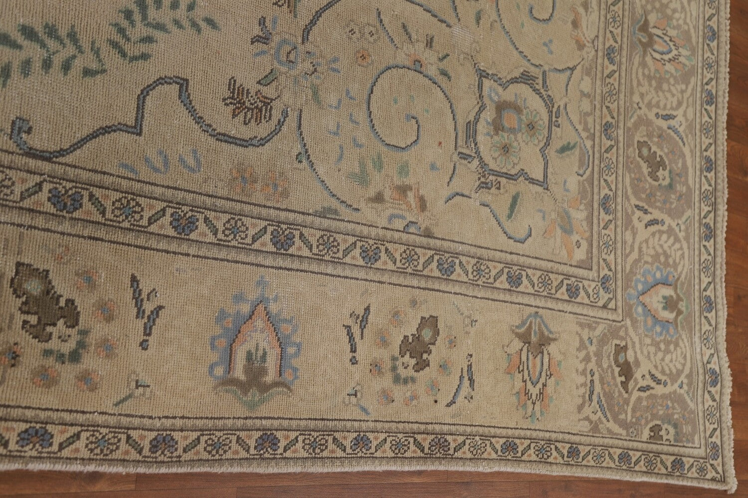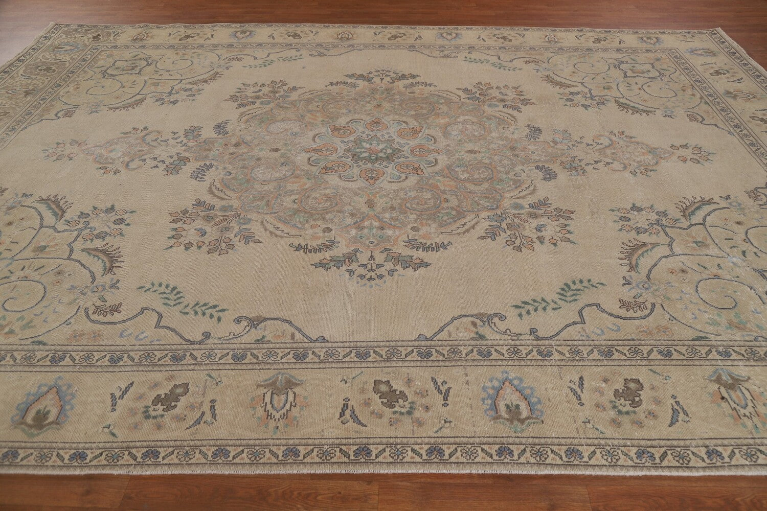 A Beautiful Genuine Persia ( Persia ) Tabriz rug is Hand Knotted by skillful weavers in Persia ( Persia ) with 100% Wool Material. This rug is in Very Good (Evenly Low Pile) condition. dimensions are 12' 8'' X 8' 11'' in foot and 386 X 272 in centimeter. the primary color is Beige & Ivories.