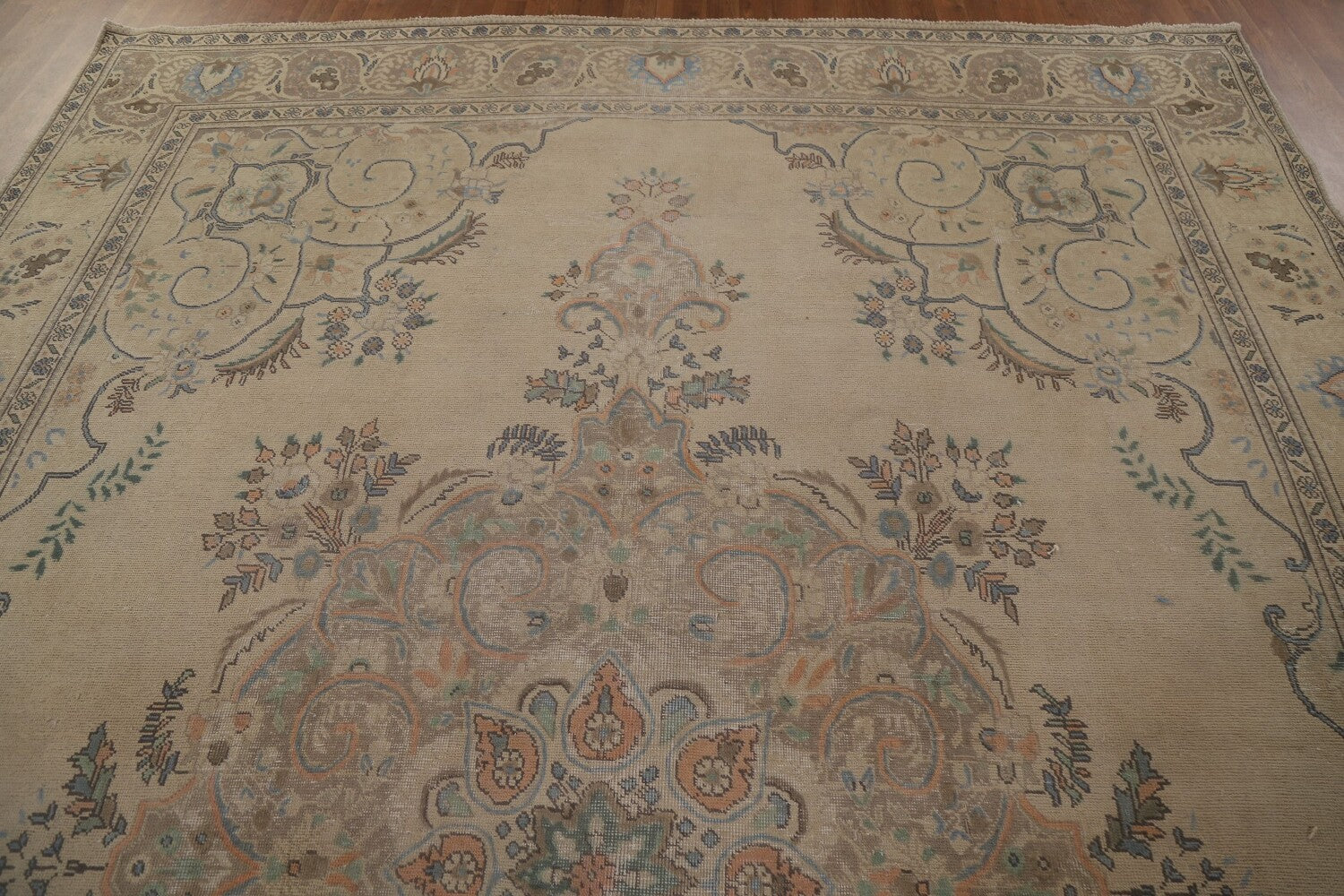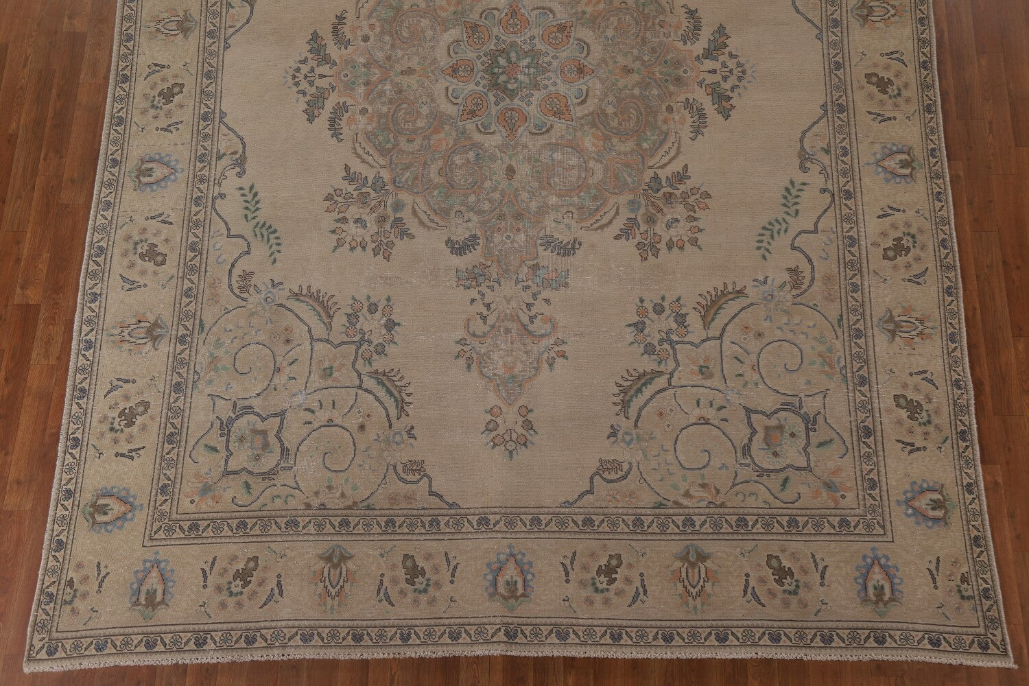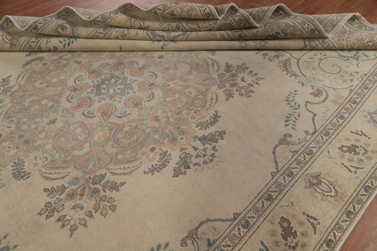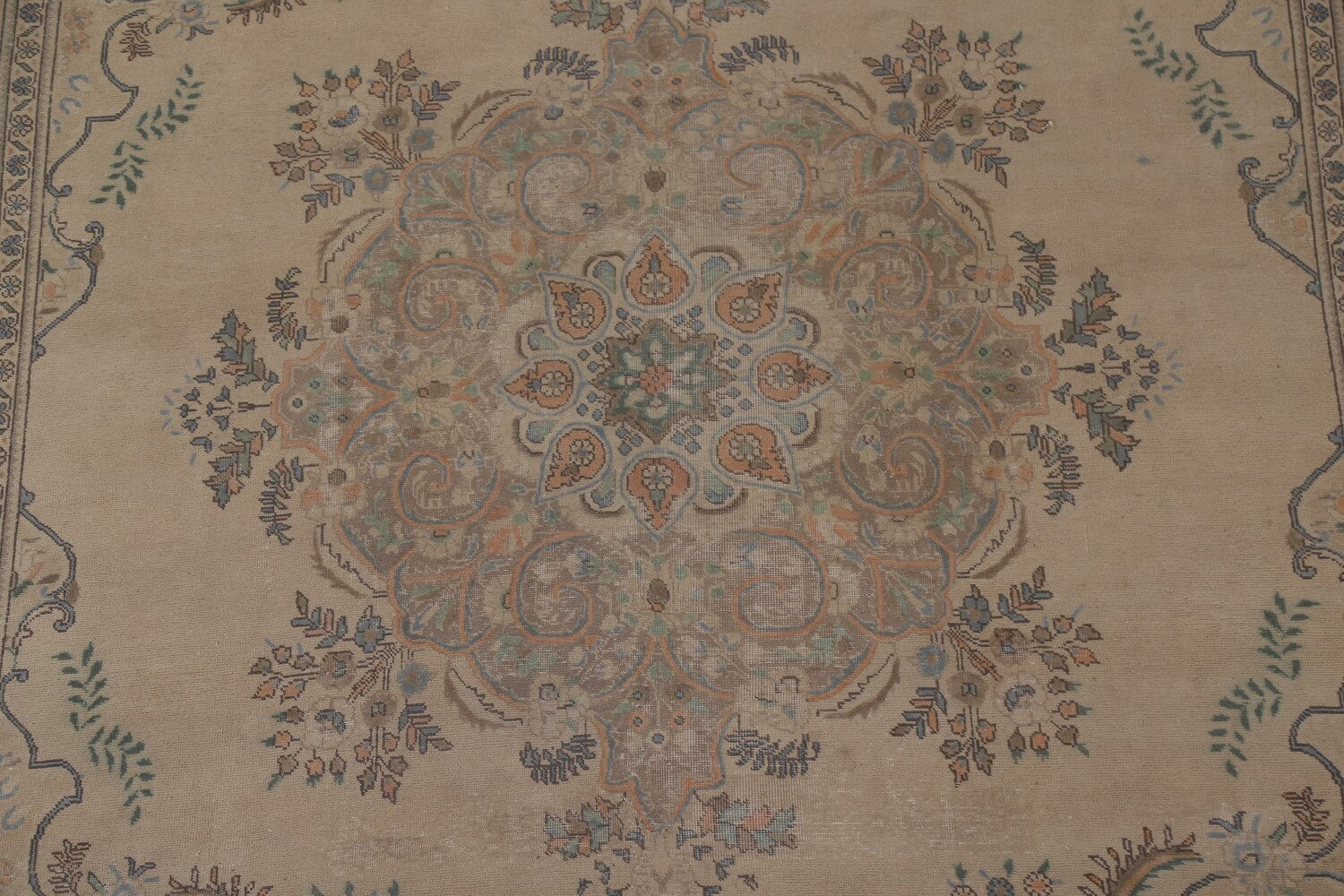 A Beautiful Genuine Persia ( Persia ) Tabriz rug is Hand Knotted by skillful weavers in Persia ( Persia ) with 100% Wool Material. This rug is in Very Good (Evenly Low Pile) condition. dimensions are 12' 8'' X 8' 11'' in foot and 386 X 272 in centimeter. the primary color is Beige & Ivories.