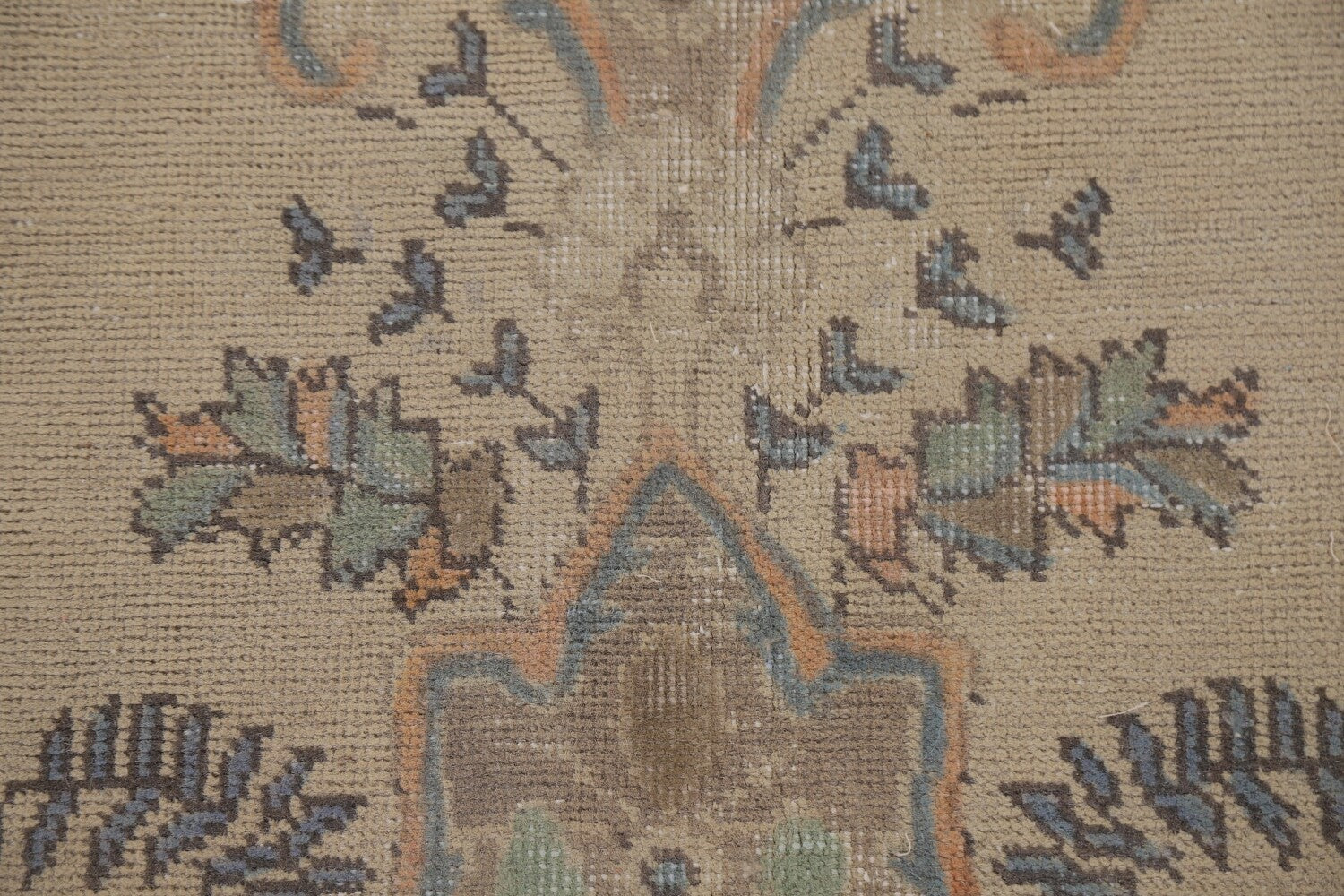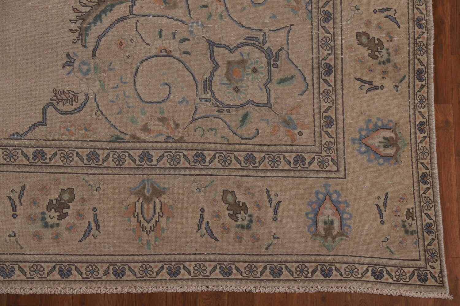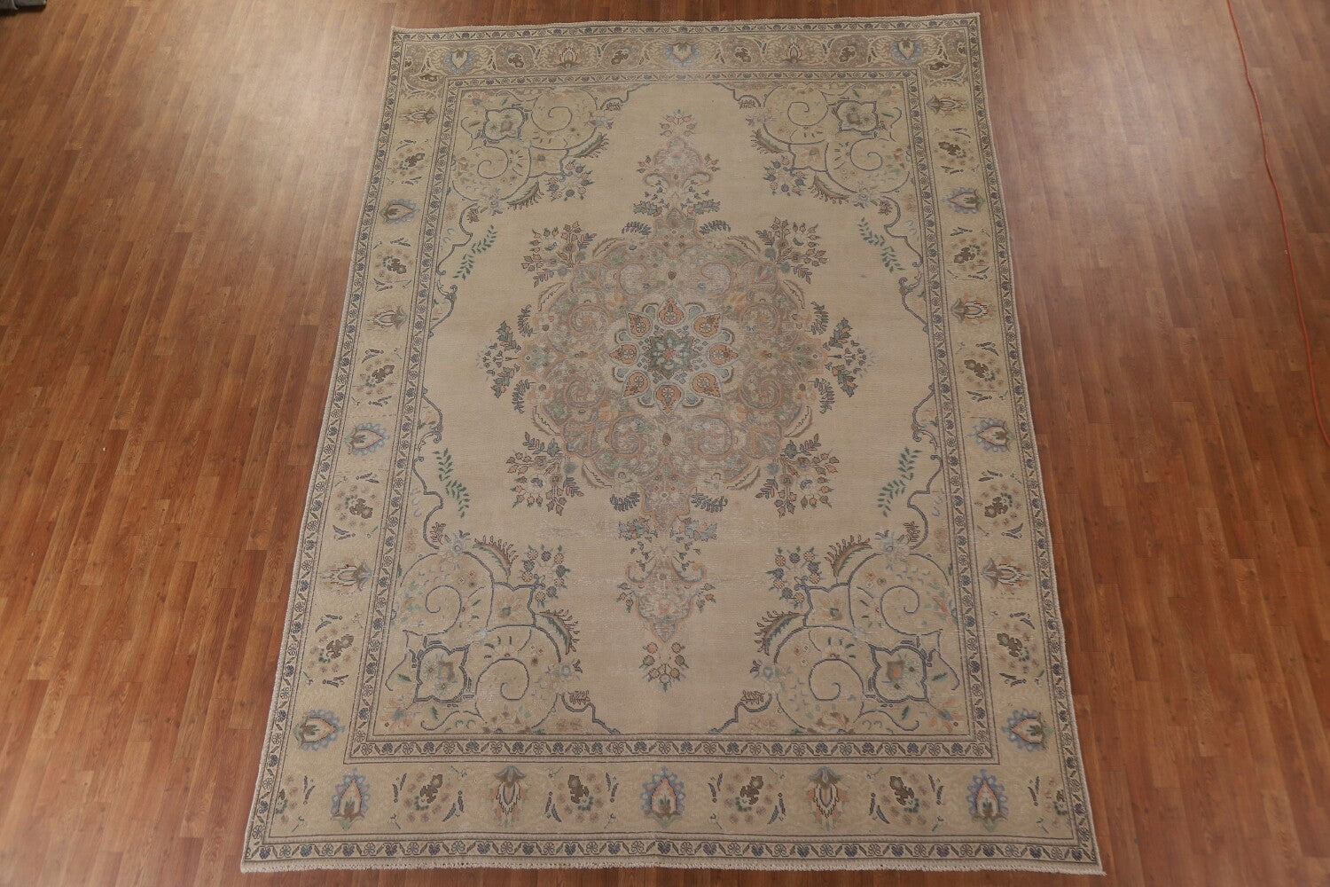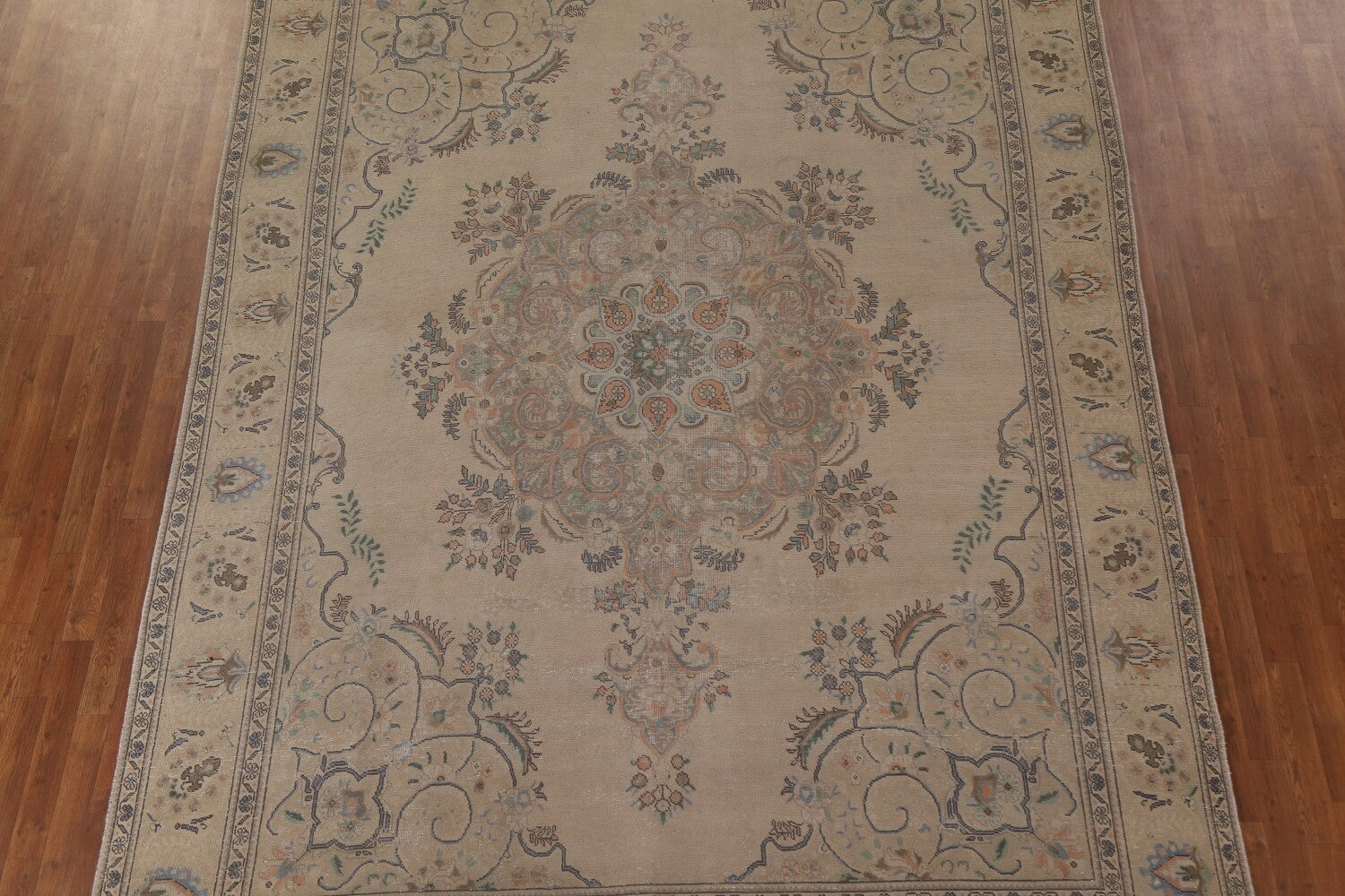 A Beautiful Genuine Persia ( Persia ) Tabriz rug is Hand Knotted by skillful weavers in Persia ( Persia ) with 100% Wool Material. This rug is in Very Good (Evenly Low Pile) condition. dimensions are 12' 8'' X 8' 11'' in foot and 386 X 272 in centimeter. the primary color is Beige & Ivories.