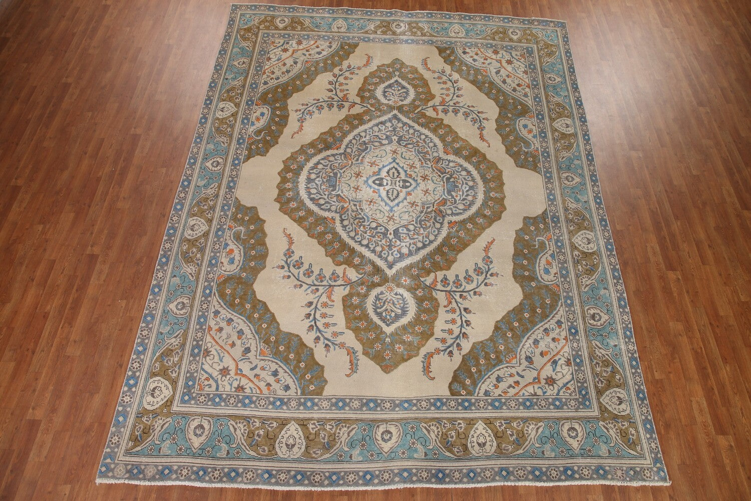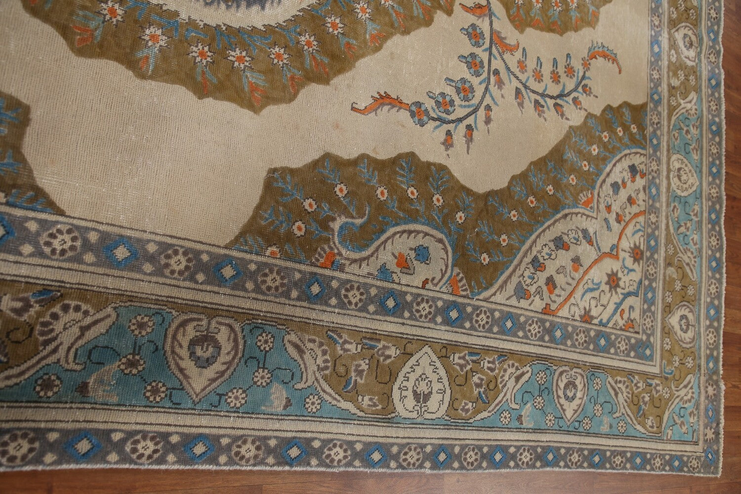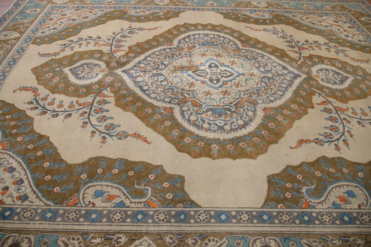 A Beautiful Genuine Persia ( Persia ) Tabriz rug is Hand Knotted by skillful weavers in Persia ( Persia ) with 100% Wool Material. This rug is in Very Good (Low Pile) condition. dimensions are 12' 8'' X 9' 4'' in foot and 386 X 284 in centimeter. the primary color is Beige & Ivories.