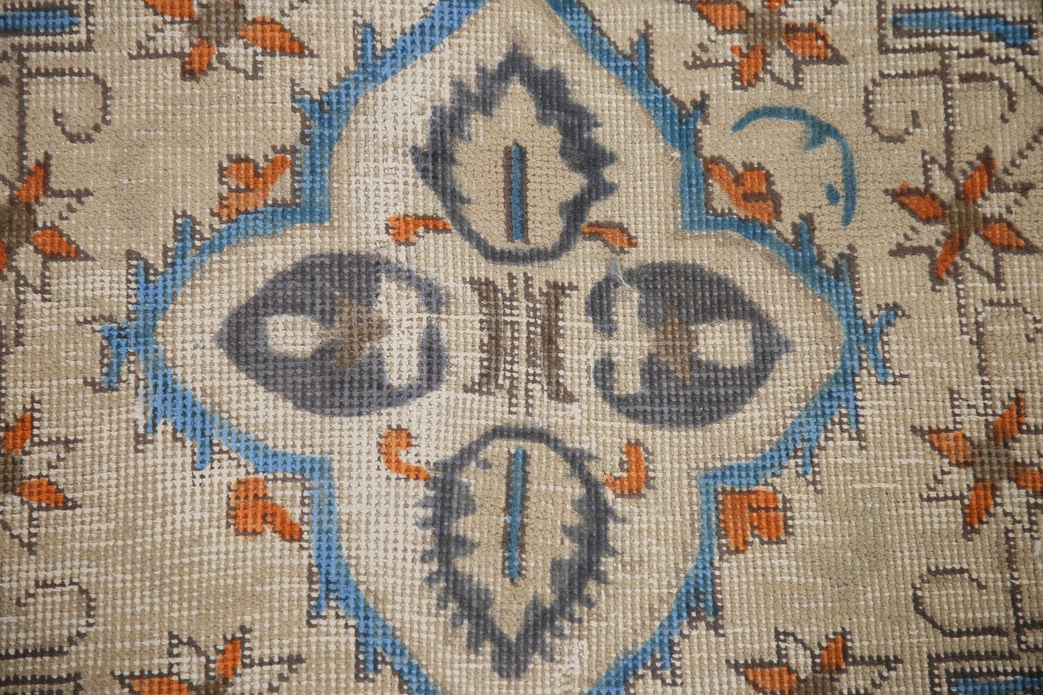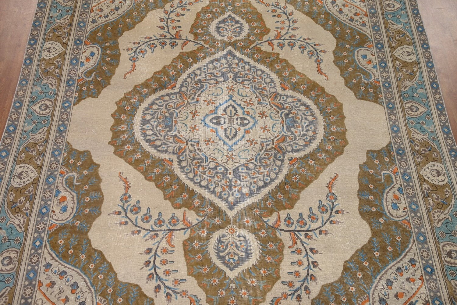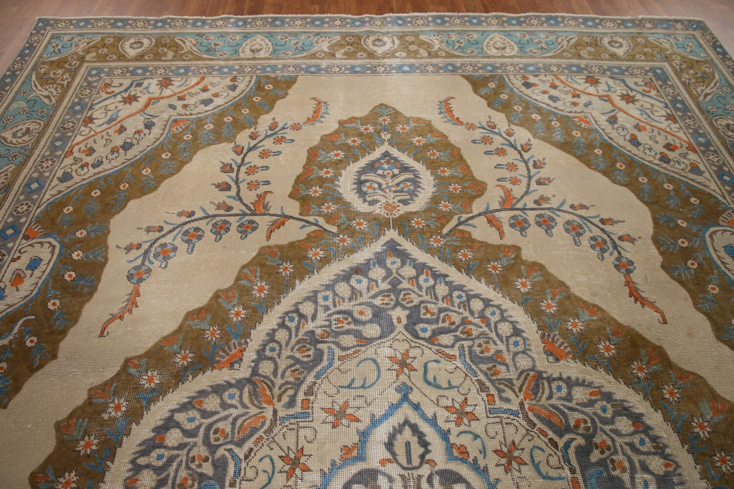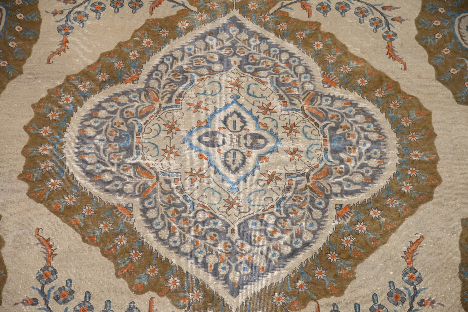 A Beautiful Genuine Persia ( Persia ) Tabriz rug is Hand Knotted by skillful weavers in Persia ( Persia ) with 100% Wool Material. This rug is in Very Good (Low Pile) condition. dimensions are 12' 8'' X 9' 4'' in foot and 386 X 284 in centimeter. the primary color is Beige & Ivories.