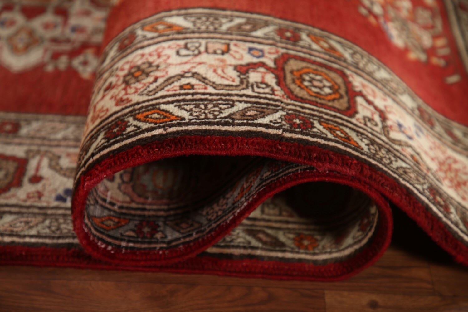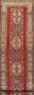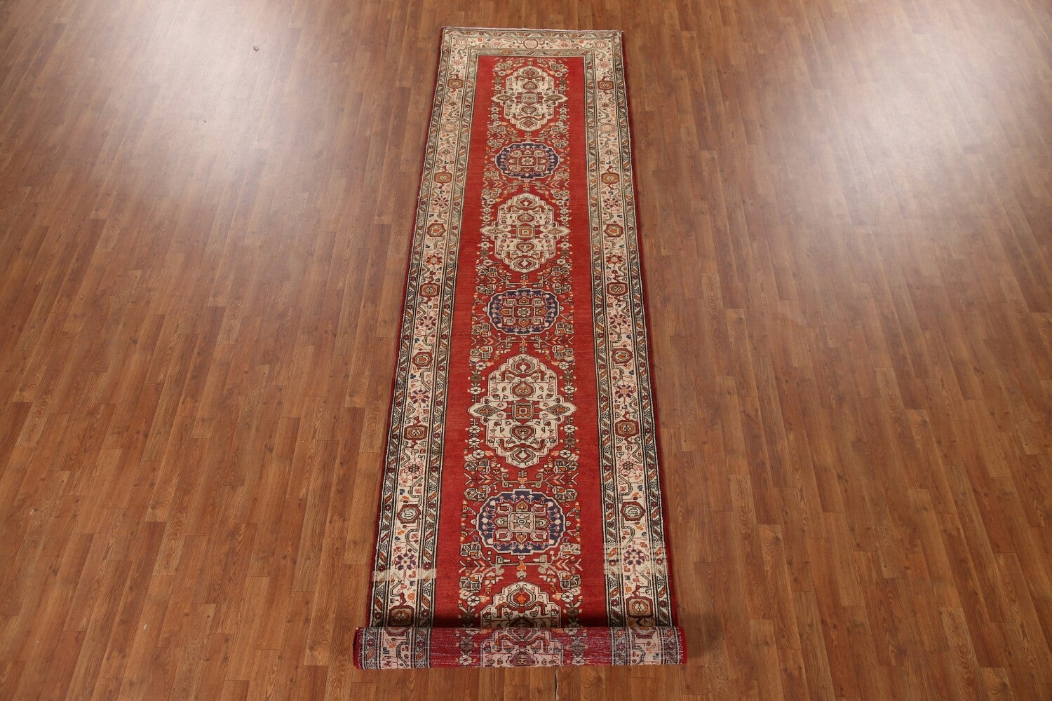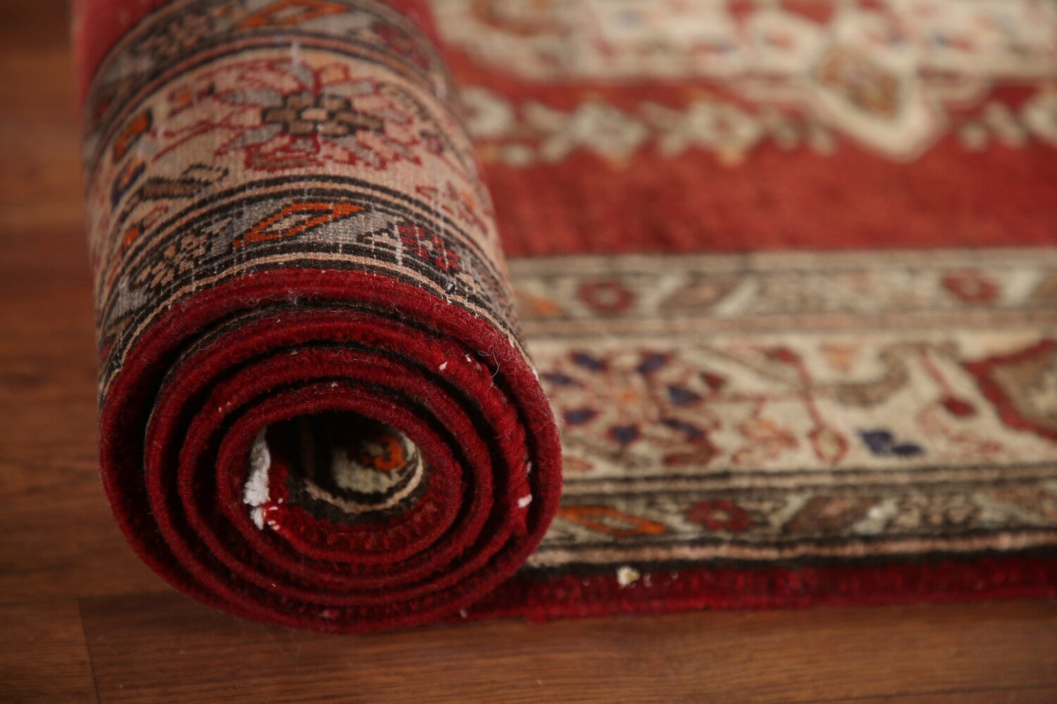A Beautiful Genuine Persia ( Persia ) Tabriz rug is Hand Knotted by skillful weavers in Persia ( Persia ) with 100% Wool Material. This rug is in Very Good (Abrash) condition. dimensions are 13' 2'' X 3' 6'' in foot and 401 X 107 in centimeter. the primary color is Red.
