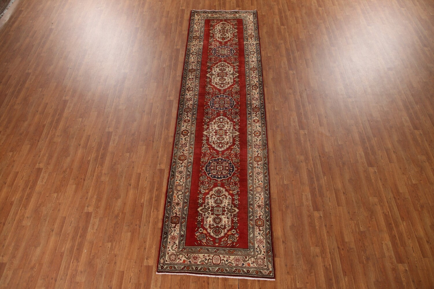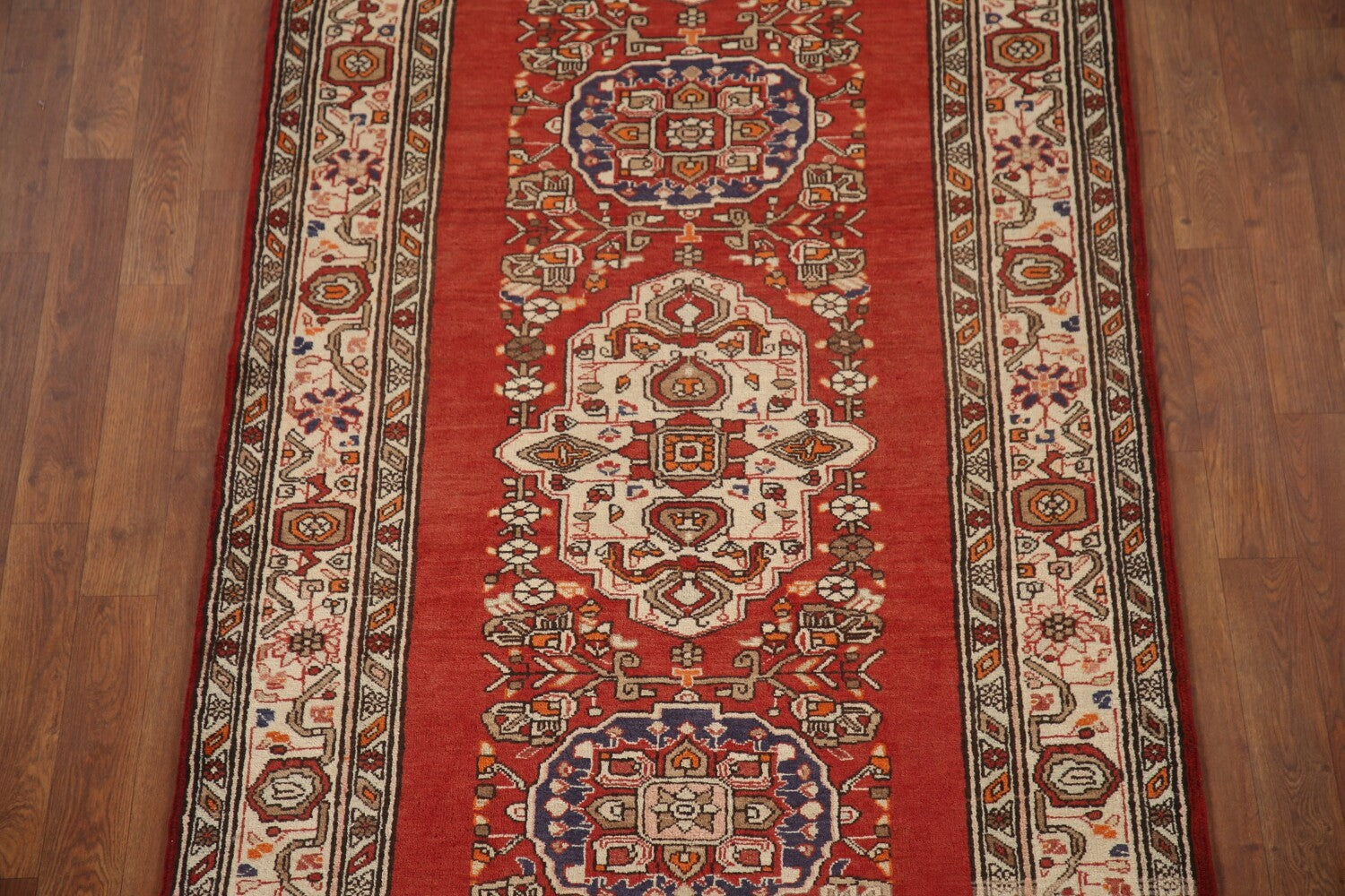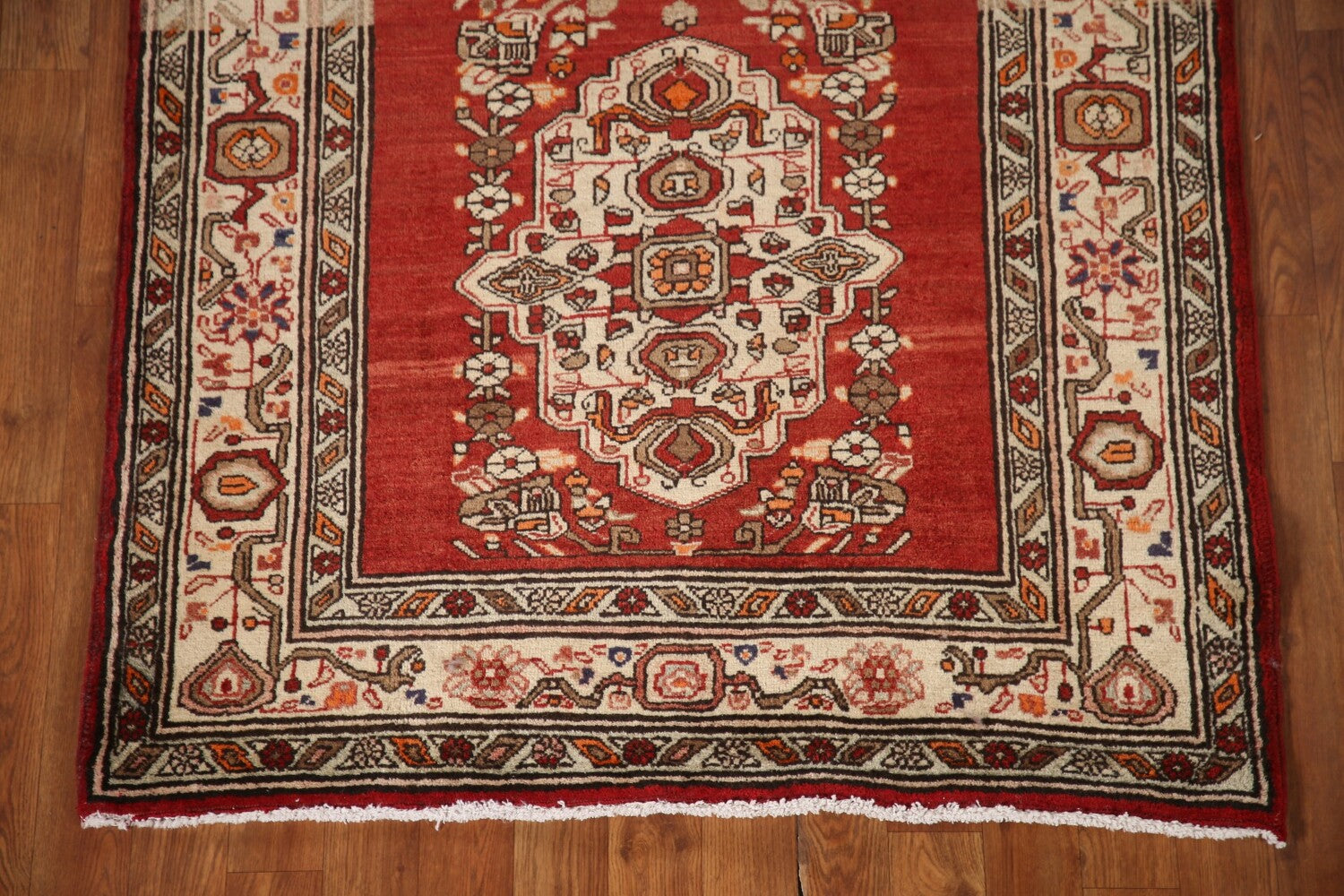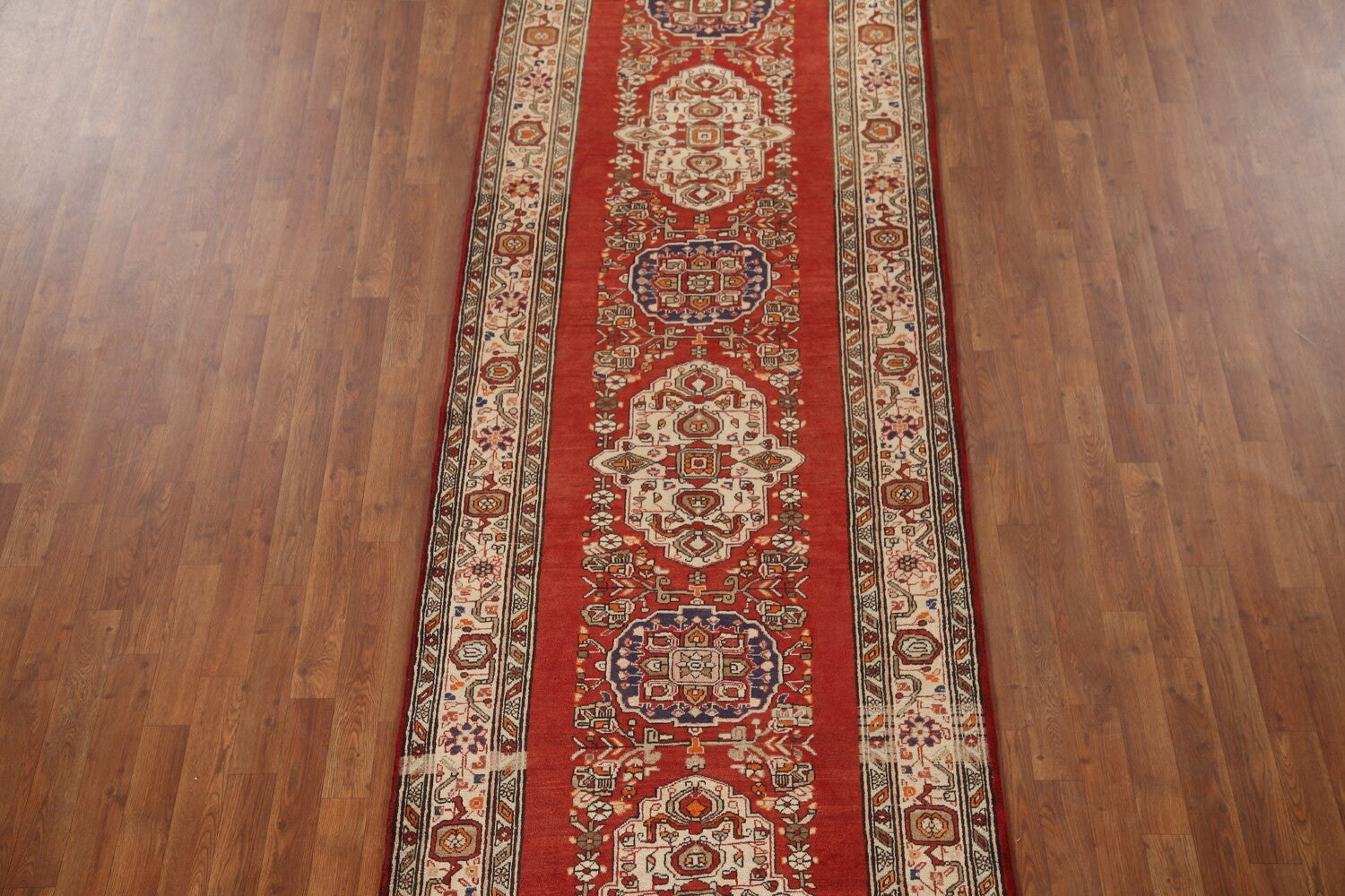 A Beautiful Genuine Persia ( Persia ) Tabriz rug is Hand Knotted by skillful weavers in Persia ( Persia ) with 100% Wool Material. This rug is in Very Good (Abrash) condition. dimensions are 13' 2'' X 3' 6'' in foot and 401 X 107 in centimeter. the primary color is Red.