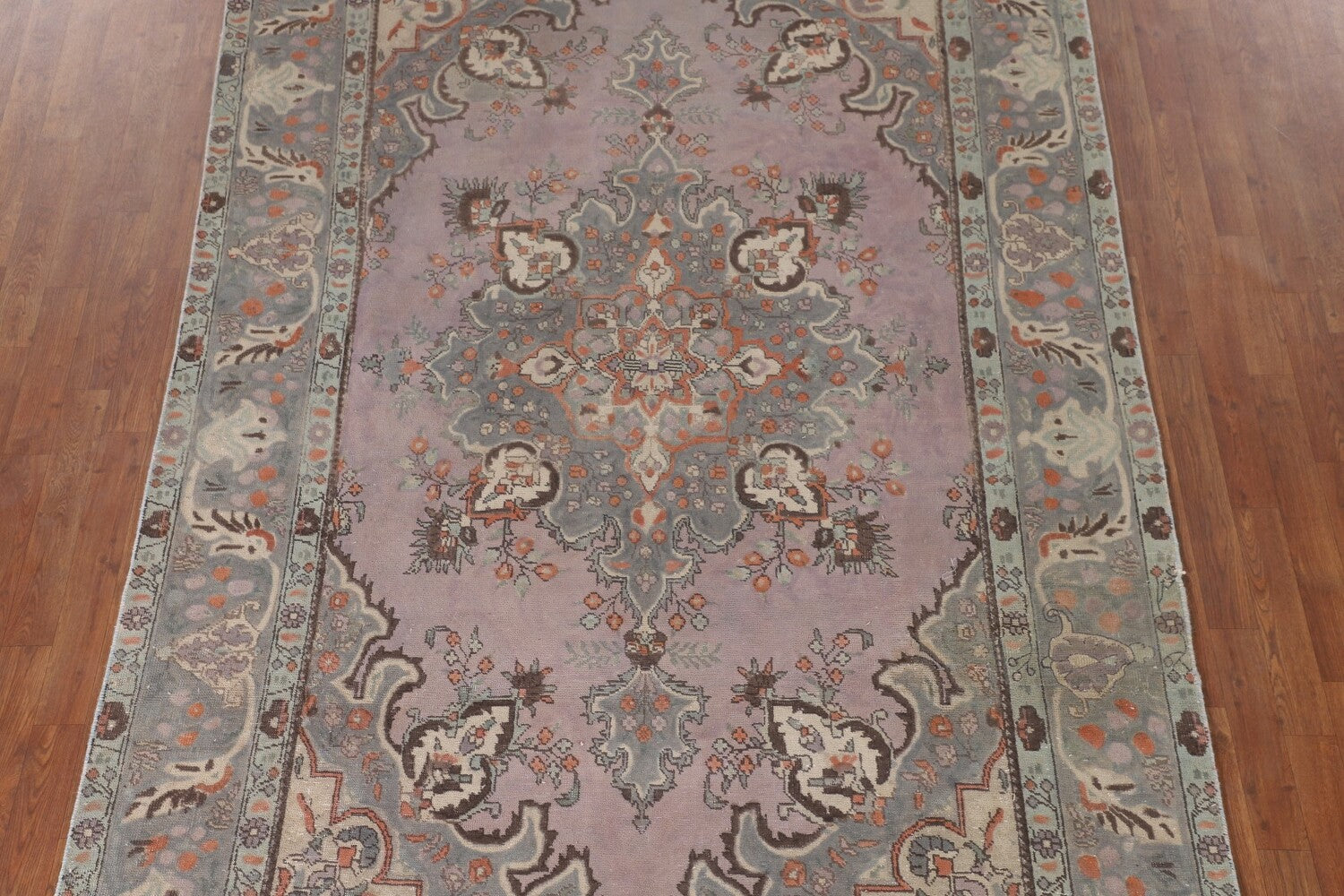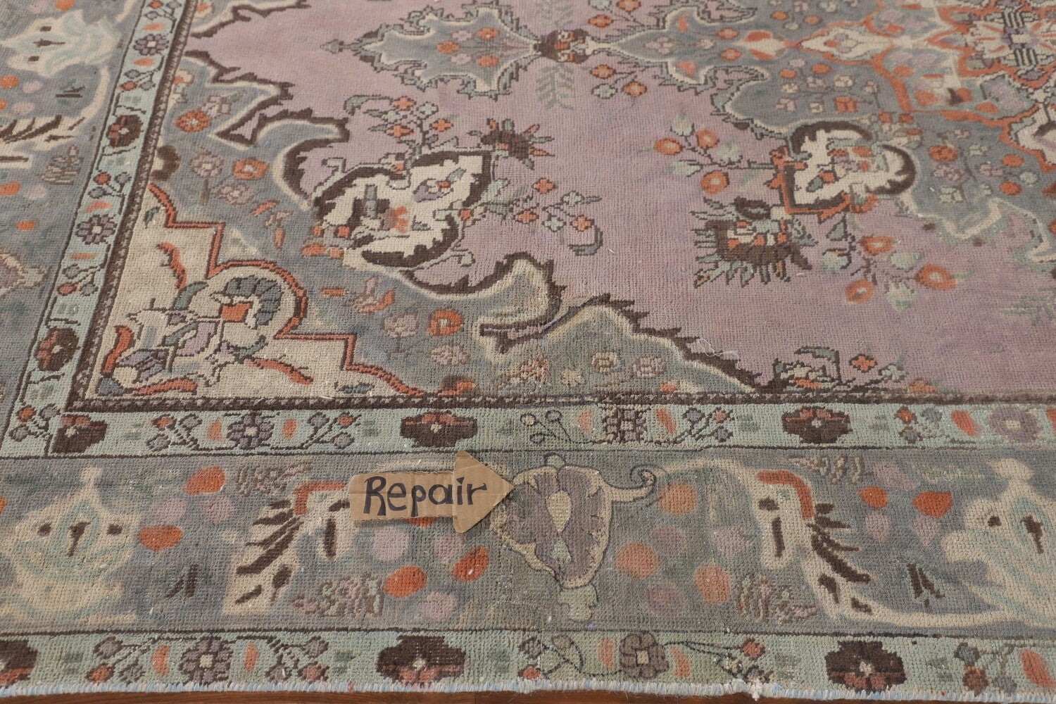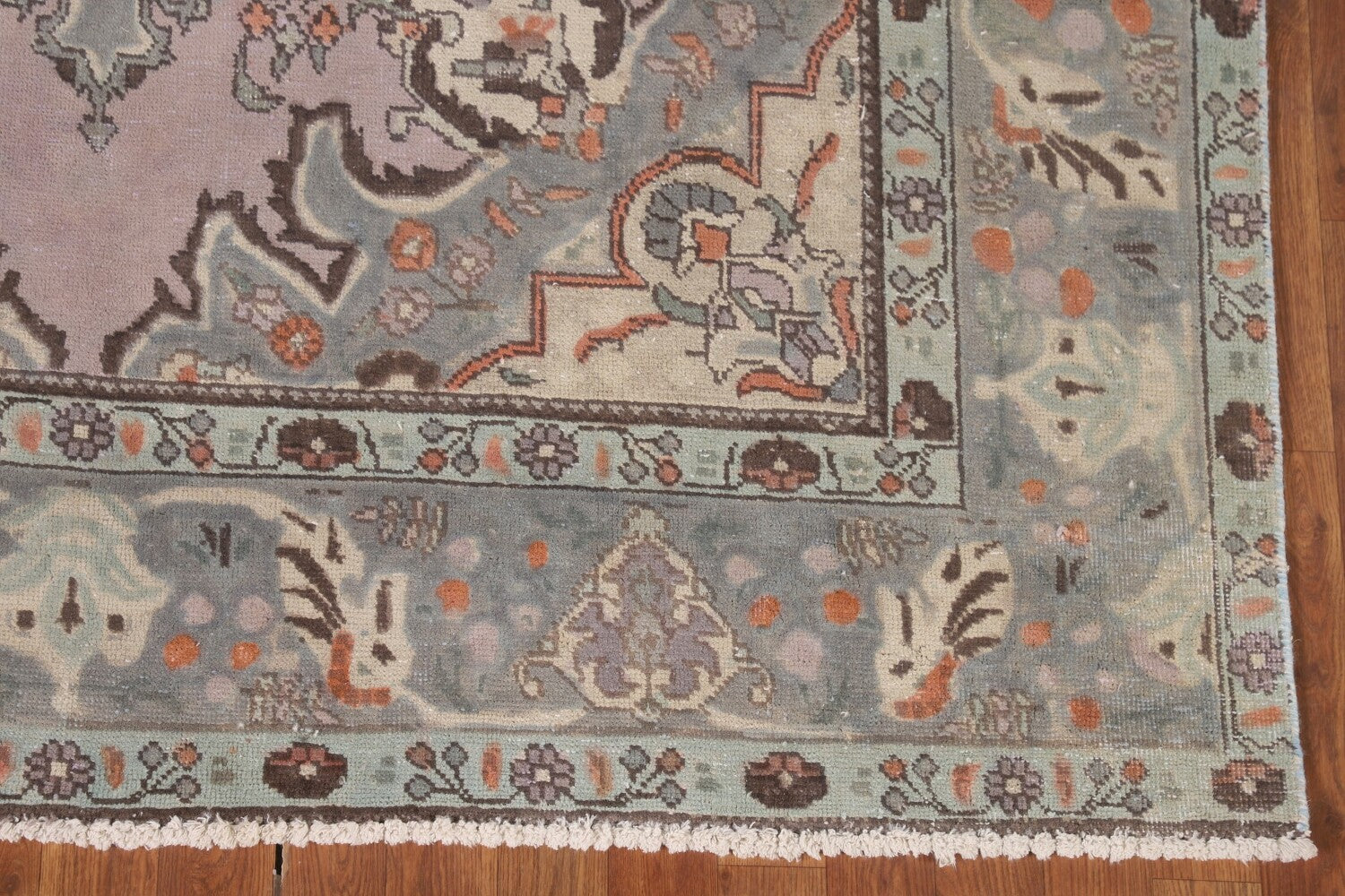 A Beautiful Genuine Persia ( Persia ) Tabriz rug is Hand Knotted by skillful weavers in Persia ( Persia ) with 100% Wool Material. This rug is in Very Good ( Evenly Low Pile-Repair) condition. dimensions are 9' 11'' X 6' 2'' in foot and 302 X 188 in centimeter. the primary color is Purples.