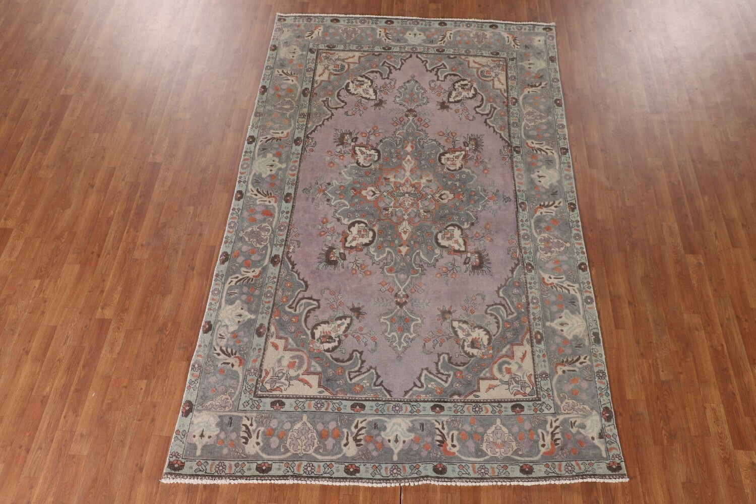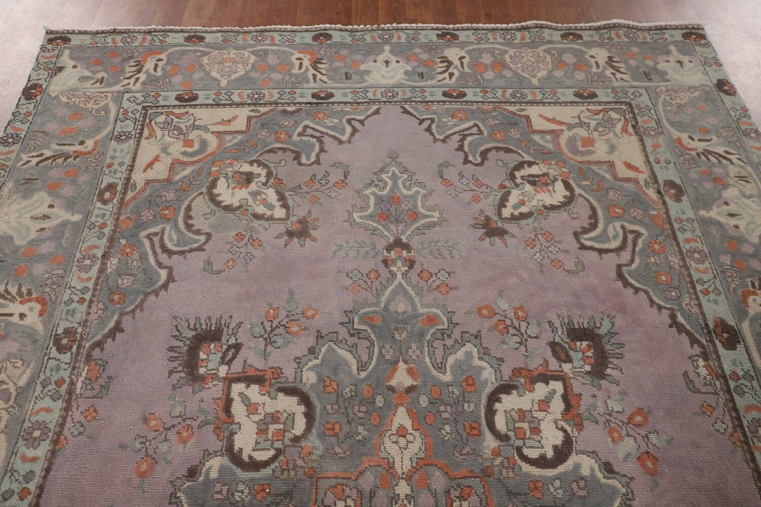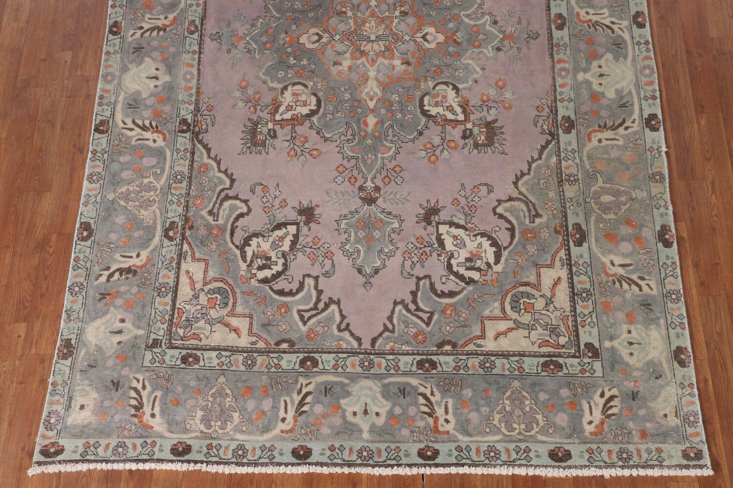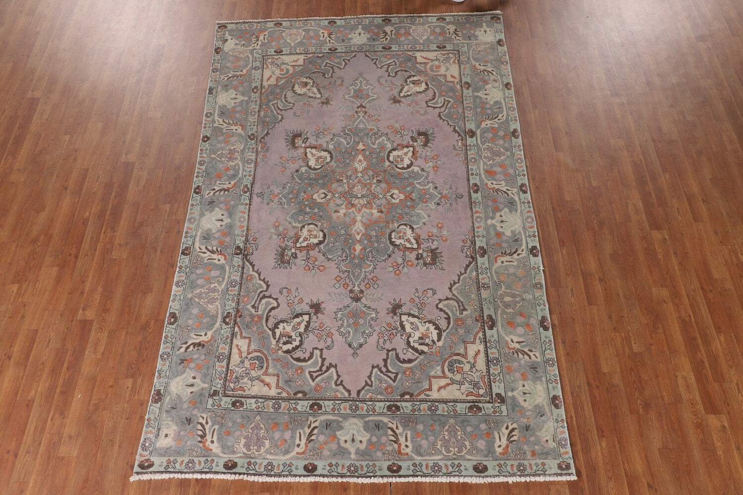 A Beautiful Genuine Persia ( Persia ) Tabriz rug is Hand Knotted by skillful weavers in Persia ( Persia ) with 100% Wool Material. This rug is in Very Good ( Evenly Low Pile-Repair) condition. dimensions are 9' 11'' X 6' 2'' in foot and 302 X 188 in centimeter. the primary color is Purples.