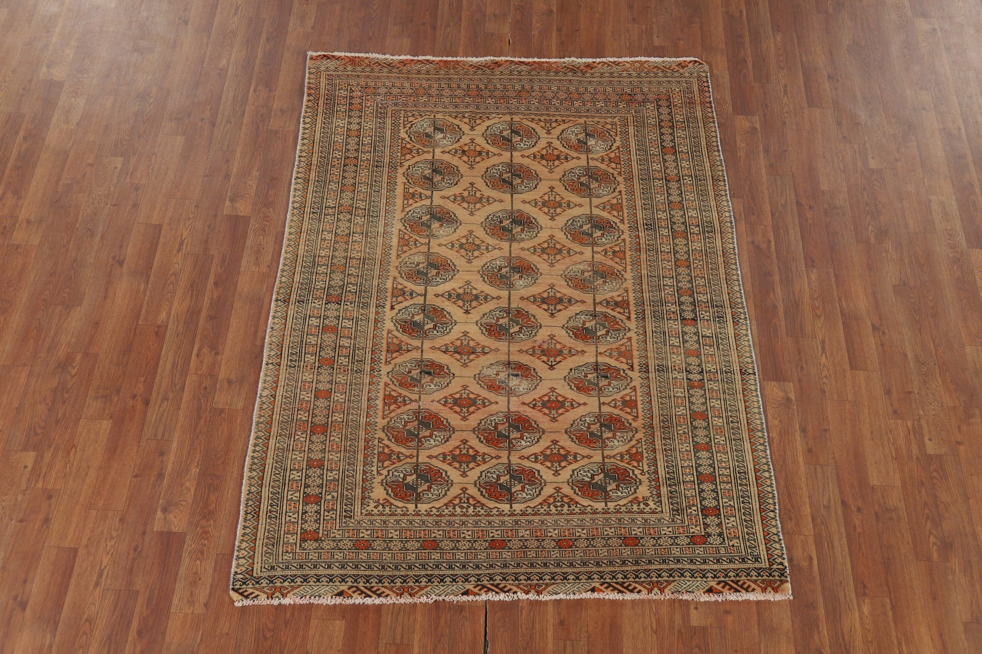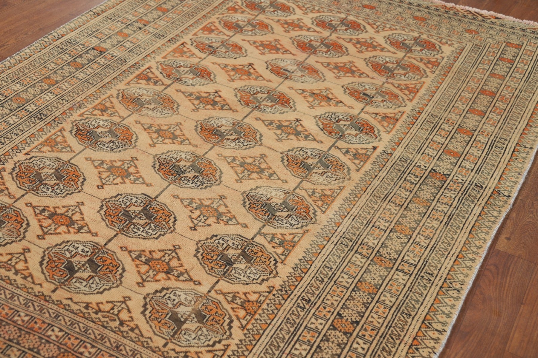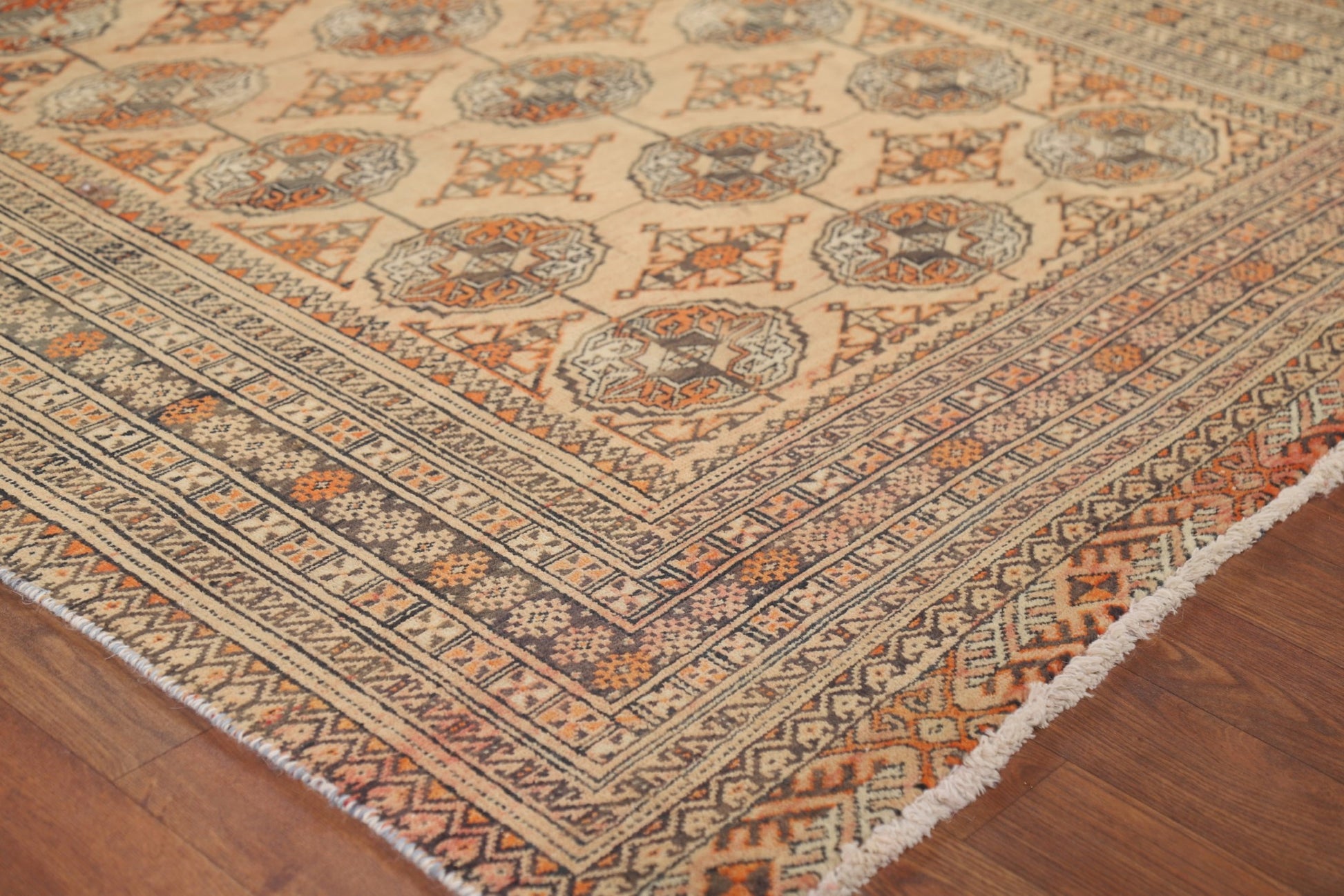 A Beautiful Genuine Persia ( Persia ) Bokhara rug is Hand Knotted by skillful weavers in Persia ( Persia ) with 100% Wool Material. This rug is in Very Good ( Evenly Low Pile-Repair) condition. dimensions are 6' 1'' X 4' 6'' in foot and 185 X 137 in centimeter. the primary color is Oranges & Rust.