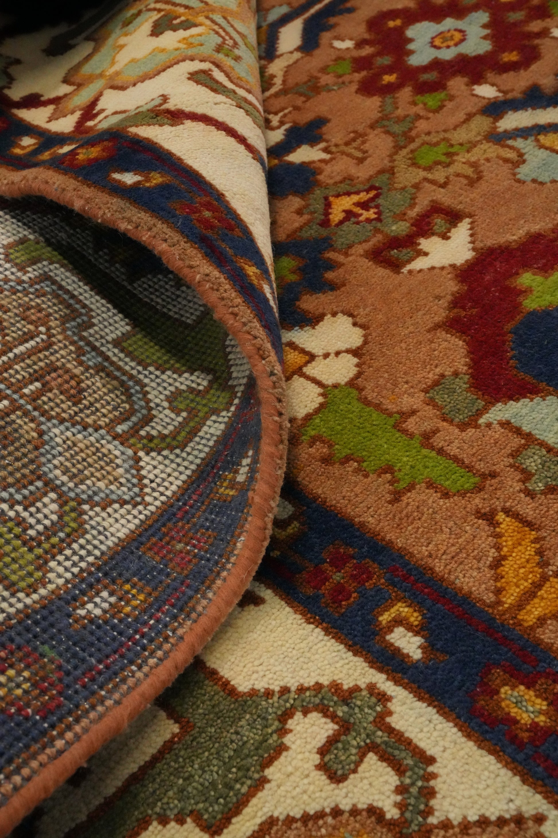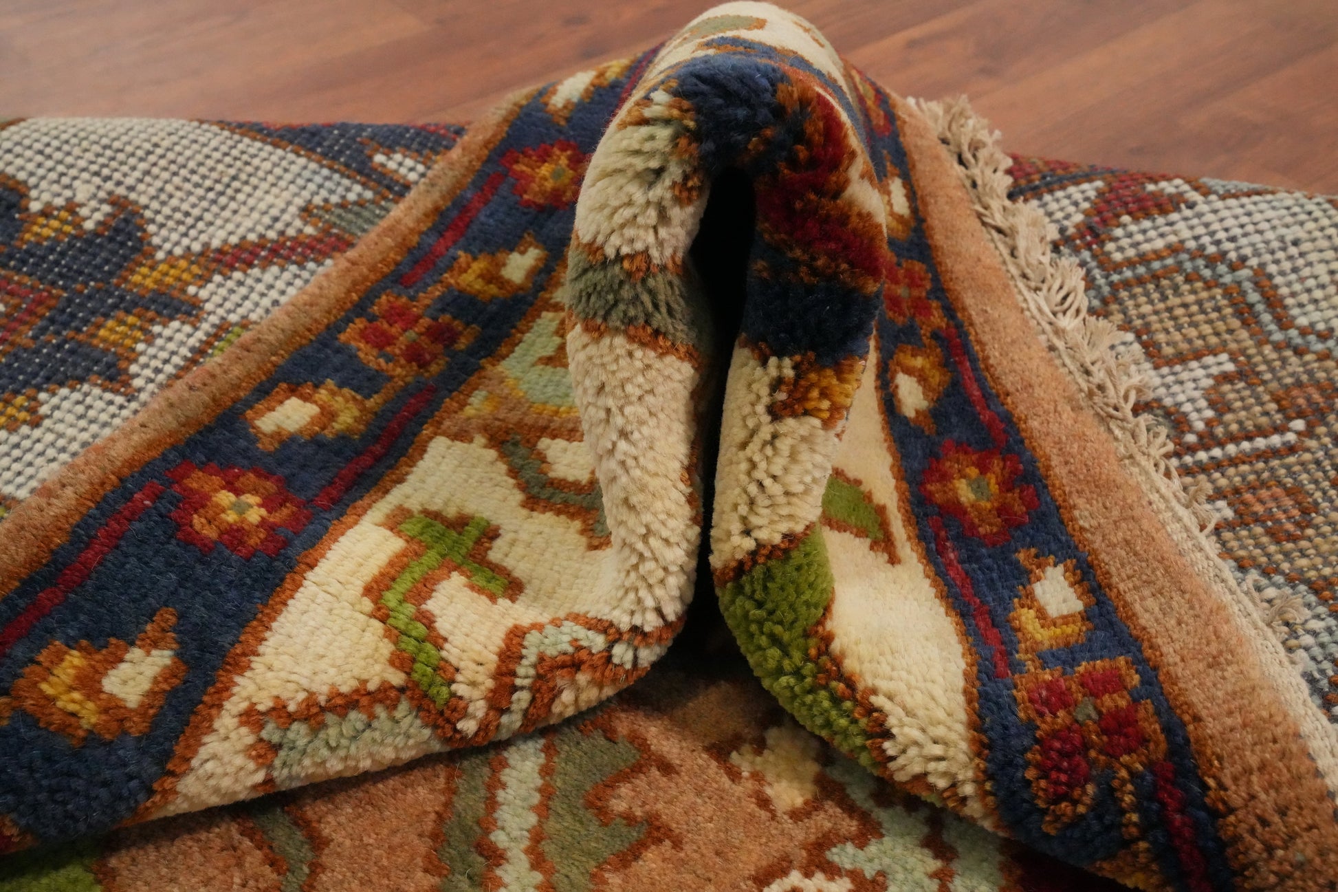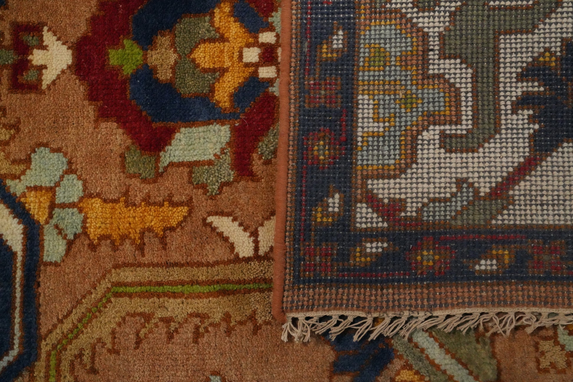 A Beautiful Genuine India Oushak rug is Hand Knotted by skillful weavers in India with 100% Wool Material. This rug is in New, First Quality condition. dimensions are 9' 9'' X 7' 11'' in foot and 297 X 241 in centimeter. the primary color is Peach.