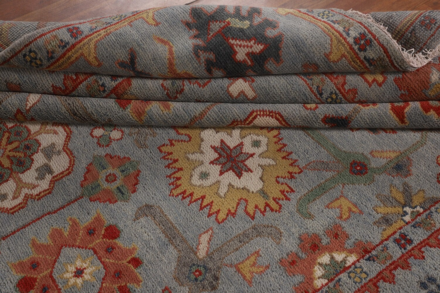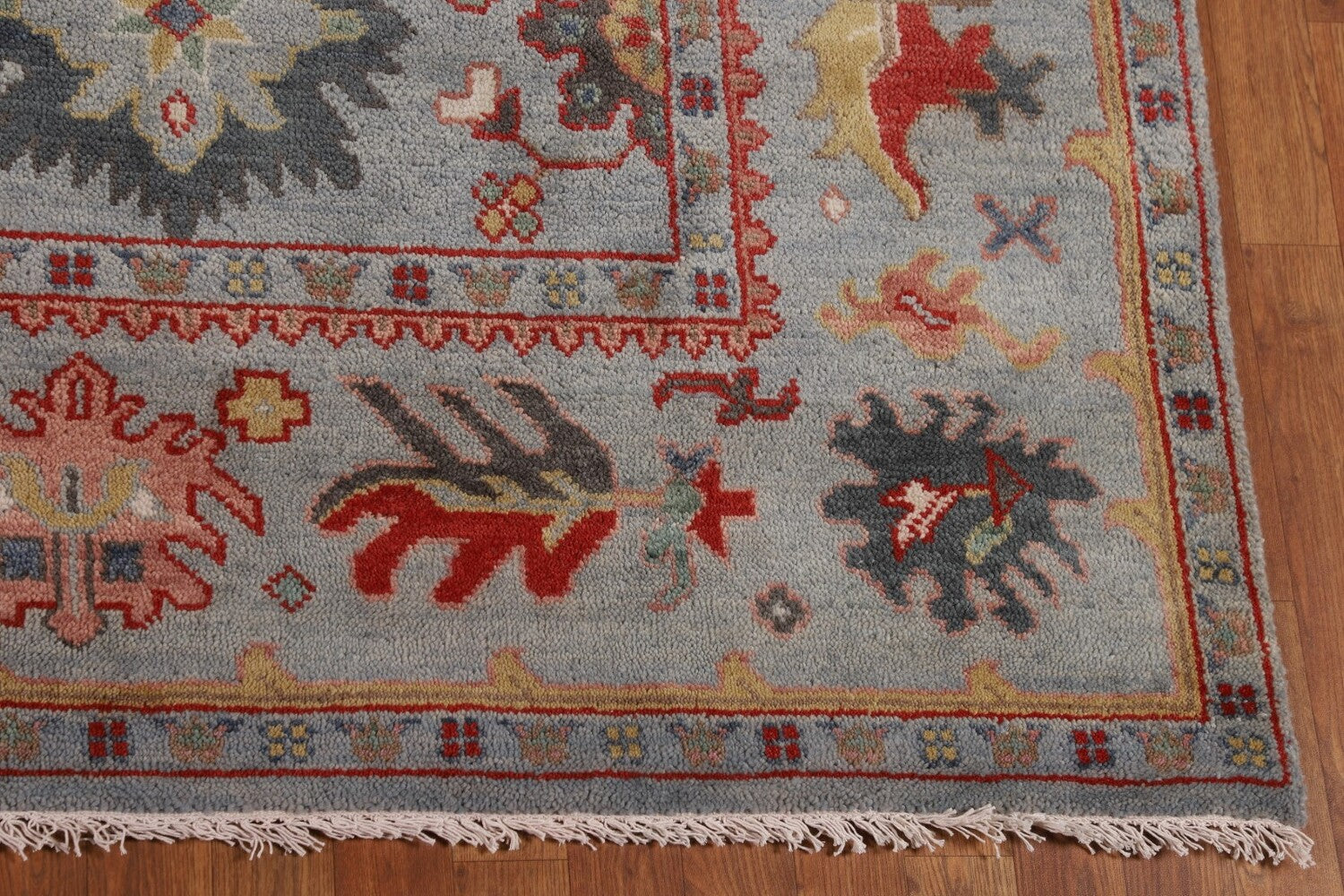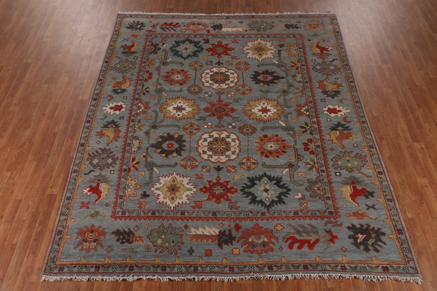 A Beautiful Genuine India Oushak rug is Hand Knotted by skillful weavers in India with 100% Wool Material. This rug is in New, First Quality condition. dimensions are 9' 9'' X 8' 2'' in foot and 297 X 249 in centimeter. the primary color is Greys & Charcoal.