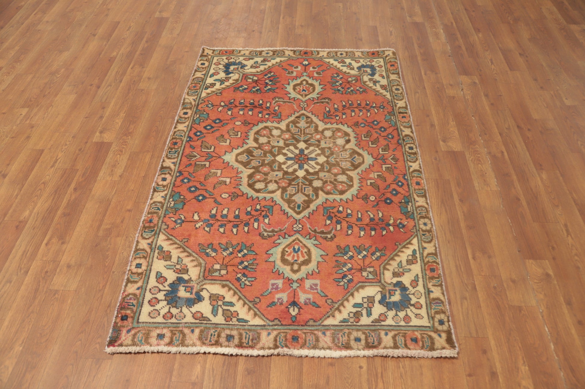 A Beautiful Genuine Persia ( Persia ) Tabriz rug is Hand Knotted by skillful weavers in Persia ( Persia ) with 100% Wool Material. This rug is in Very Good ( Low Pile ) condition. dimensions are 4' 10'' X 3' 2'' in foot and 147 X 97 in centimeter. the primary color is Oranges & Rust.