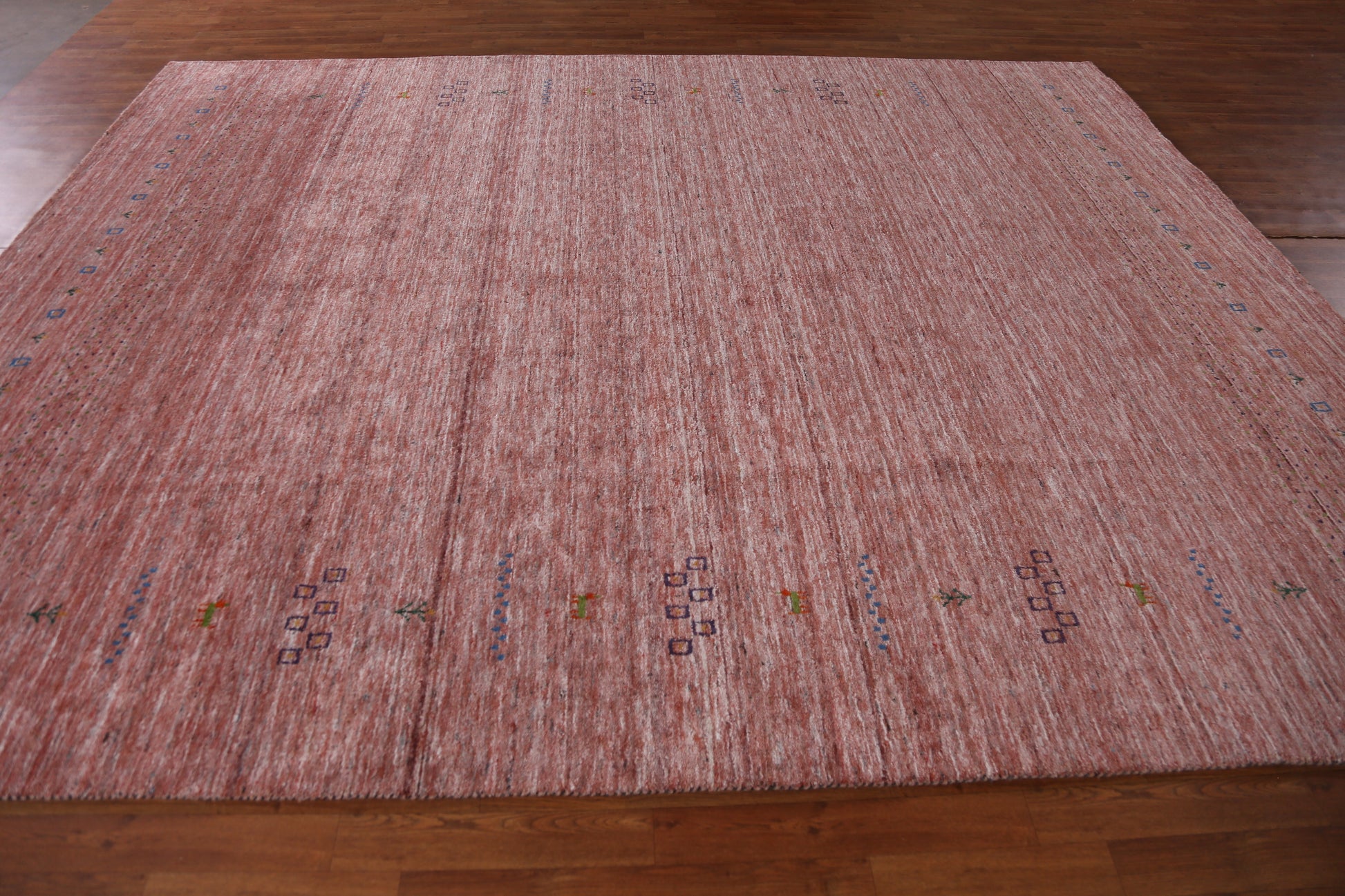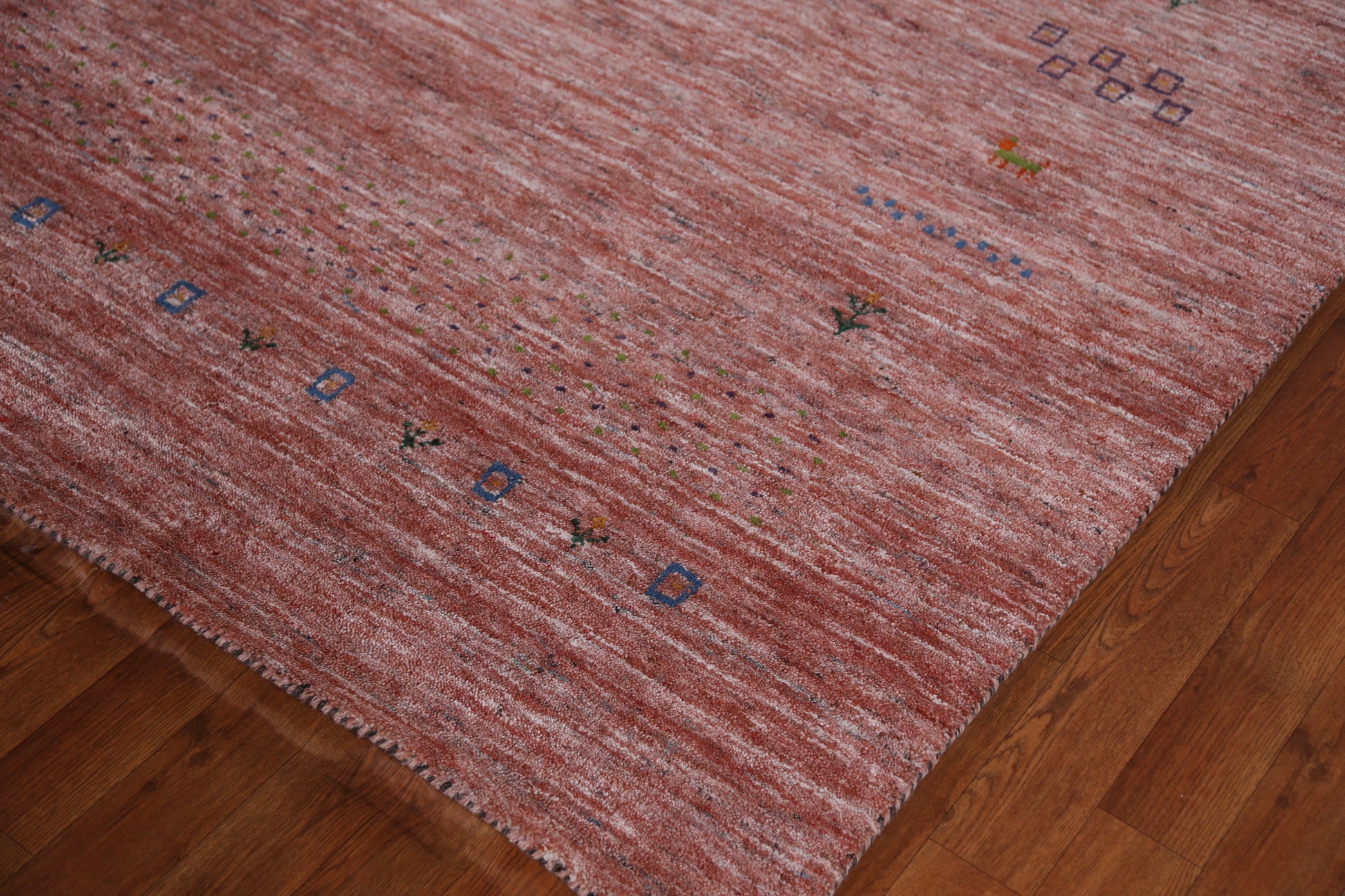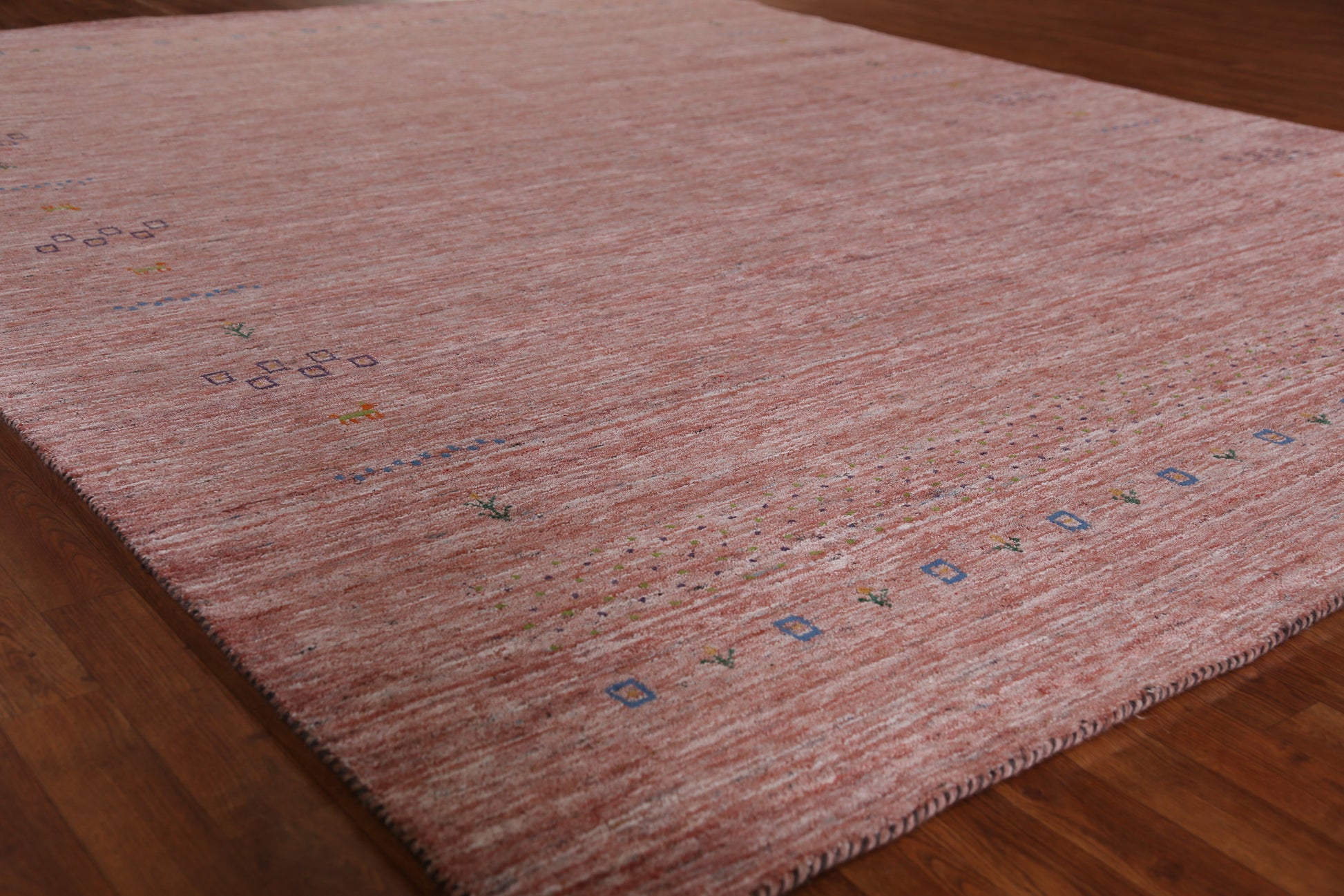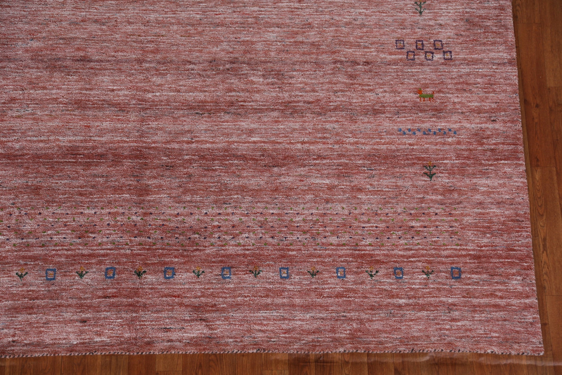 A Beautiful Genuine India Gabbeh rug is Hand Knotted by skillful weavers in India with 100% Wool Material. This rug is in New, First Quality condition. dimensions are 11' 3'' X 9' 1'' in foot and 343 X 277 in centimeter. the primary color is Peach.